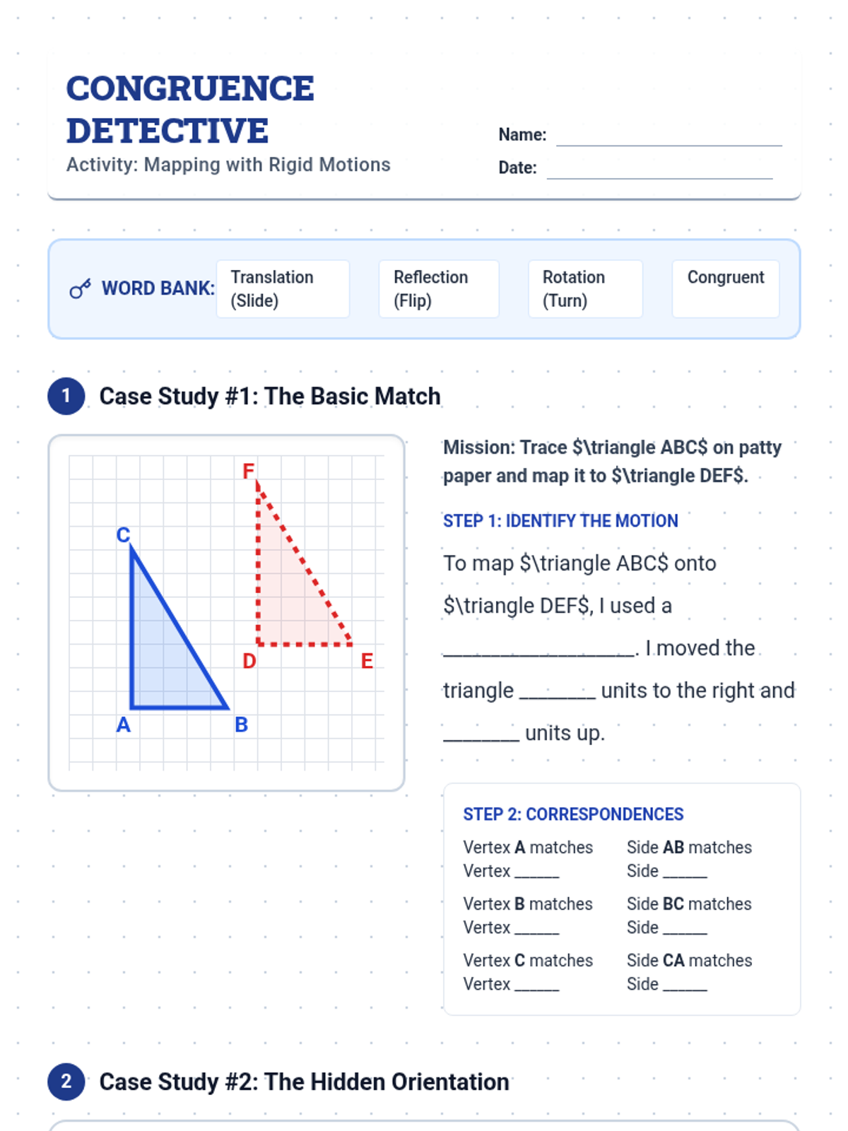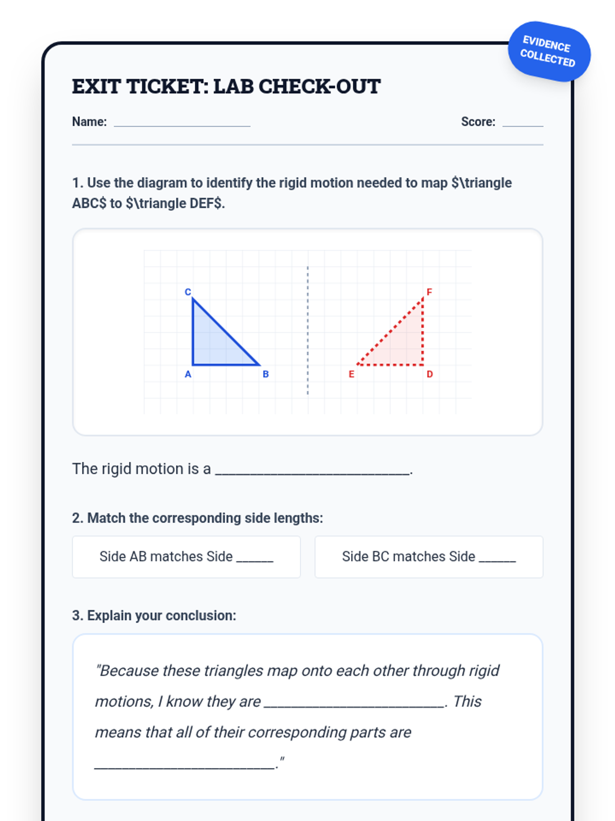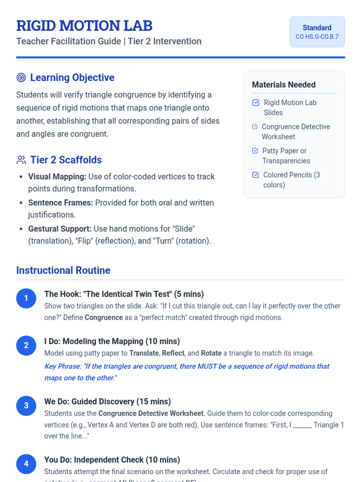 A targeted intervention sequence focused on understanding triangle congruence (SSS, SAS, ASA) through the lens of rigid motions, specifically designed for Tier 2 small group support.