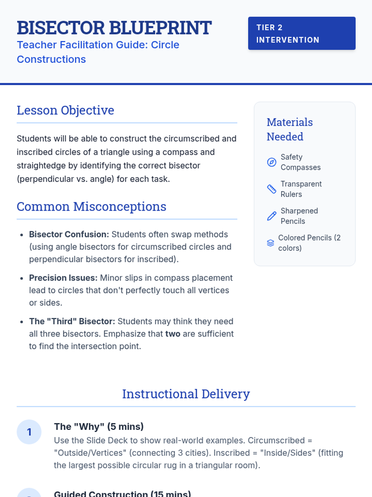 A specialized intervention sequence for High School Geometry focusing on the logic and execution of formal geometric constructions using compass and straightedge. Designed for Tier 2 small group support with scaffolded steps and targeted practice.