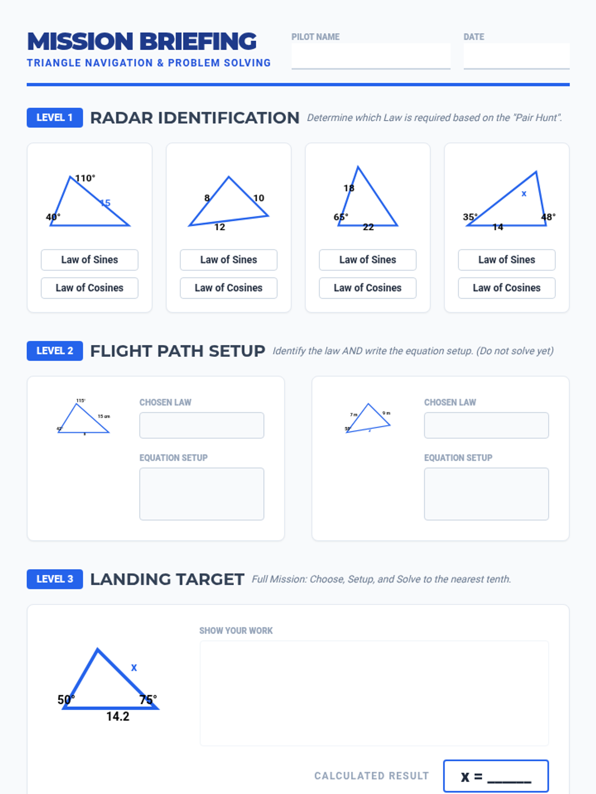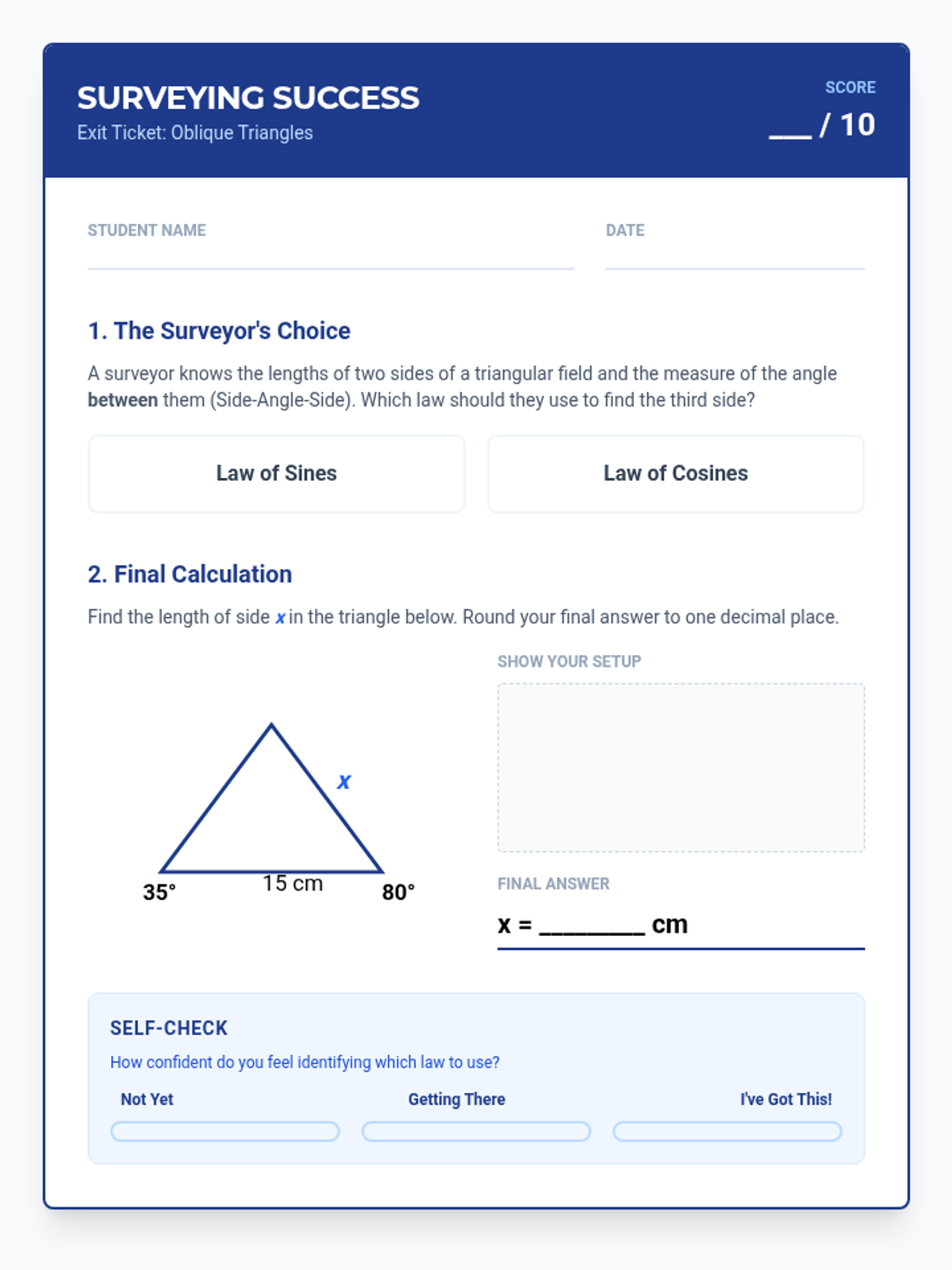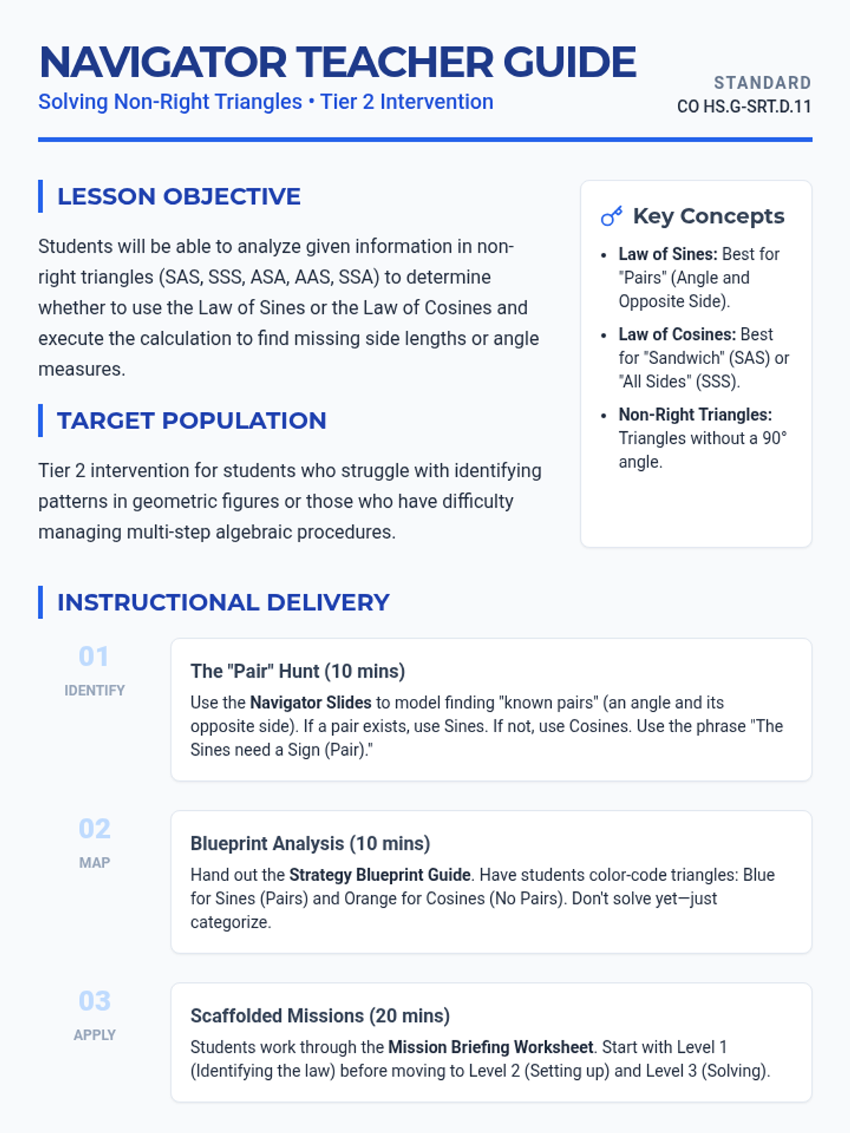 A specialized intervention sequence designed for high school geometry students to master solving non-right triangles using the Law of Sines and Law of Cosines, with a focus on decision-making and scaffolded practice.