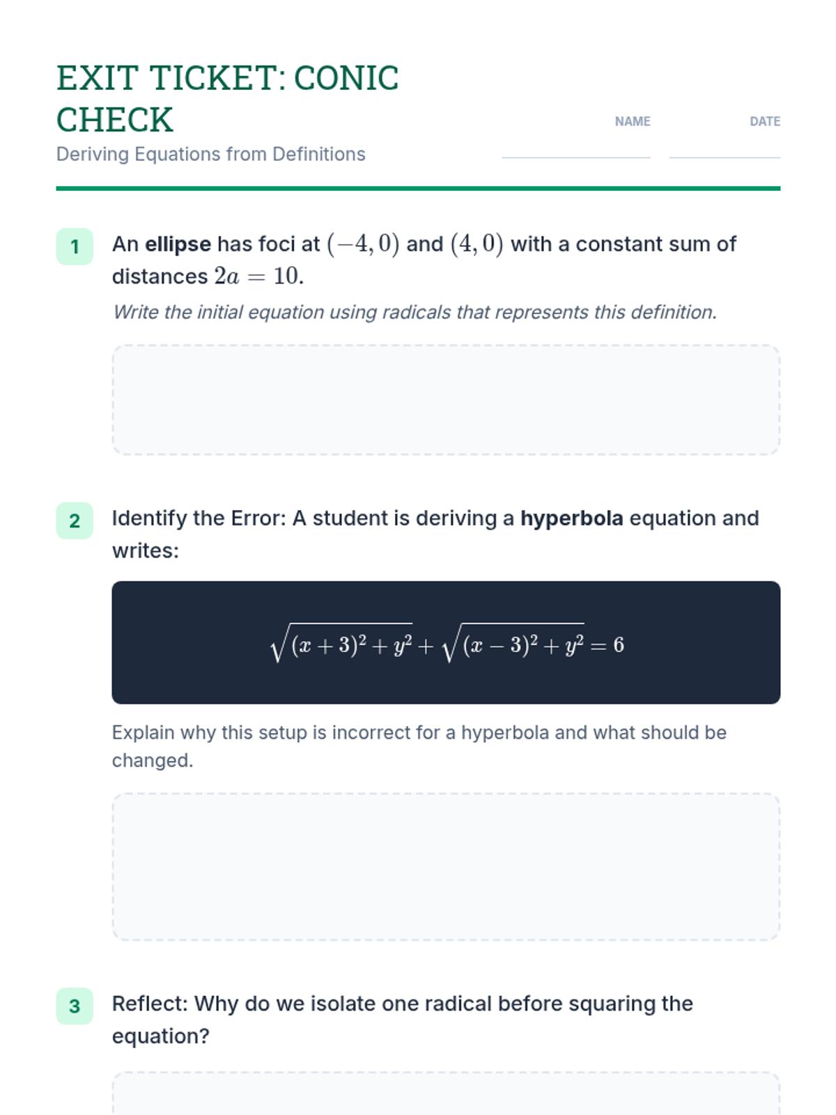 A targeted intervention sequence for high school geometry students to master deriving equations for ellipses and hyperbolas using their geometric definitions.