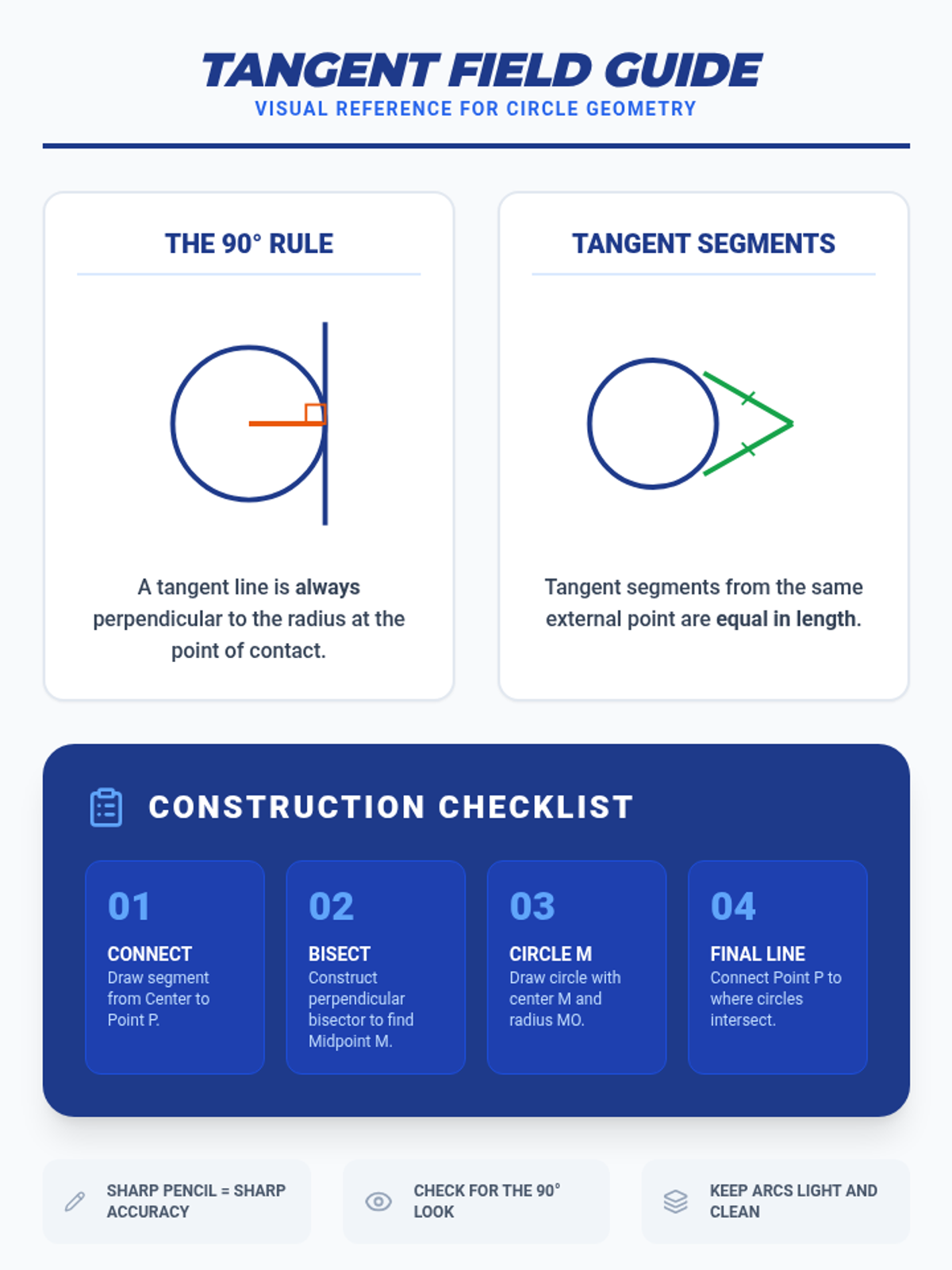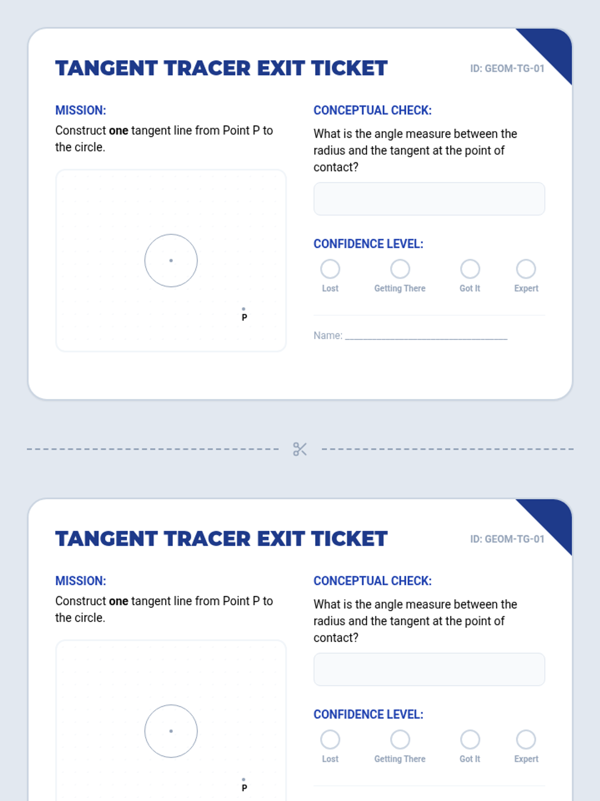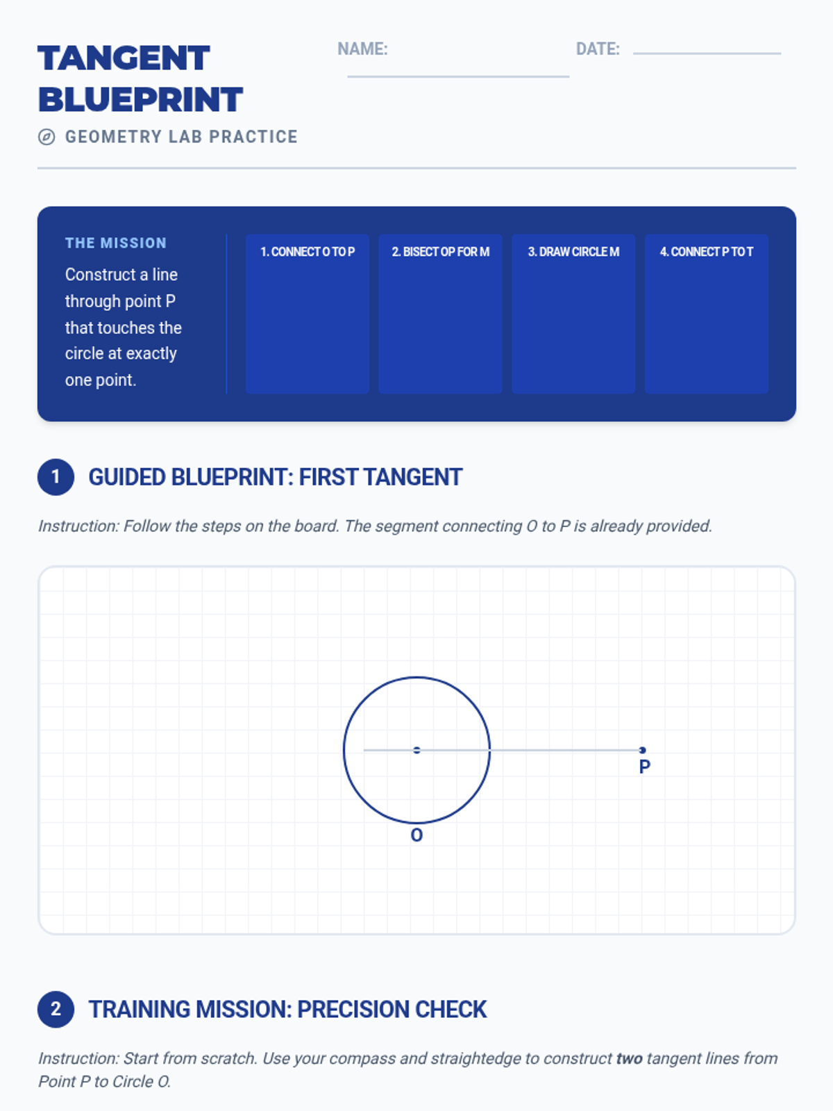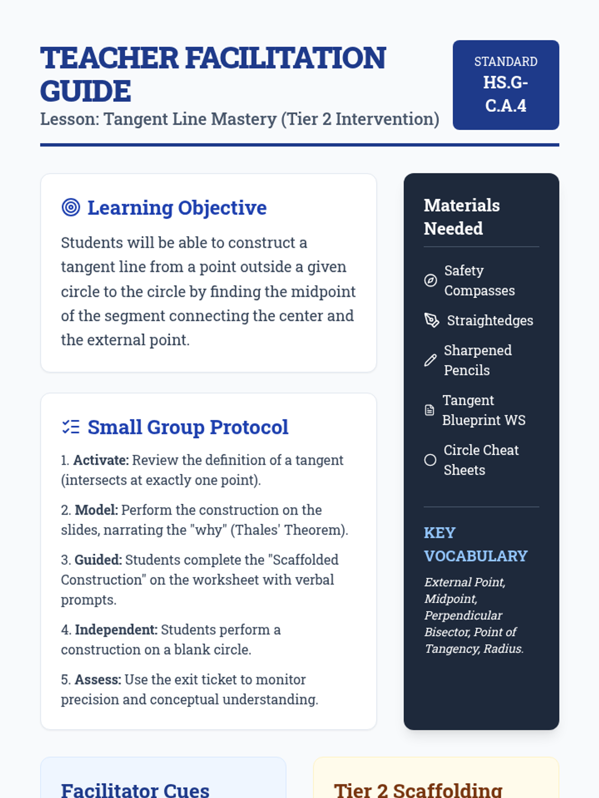 A targeted intervention sequence focused on geometric constructions, specifically tangent lines from external points to circles, designed for Tier 2 small group support with visual scaffolds and step-by-step mastery.