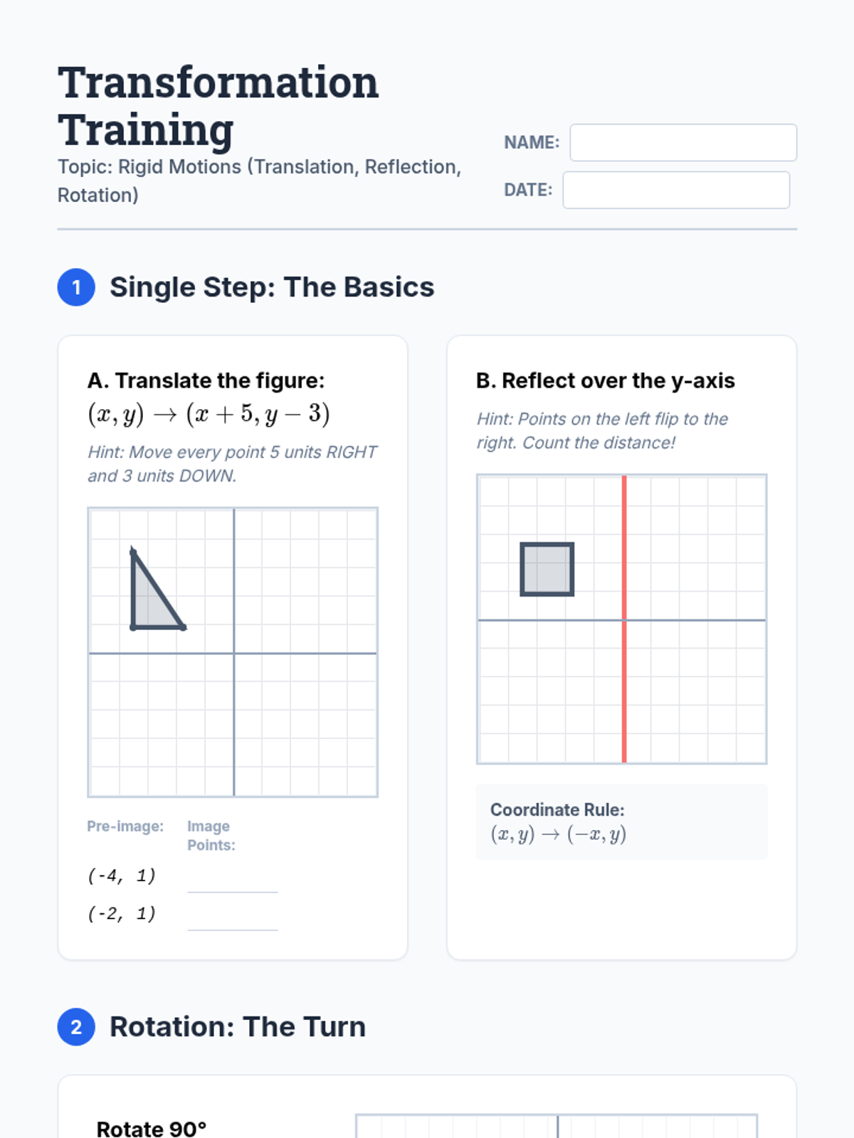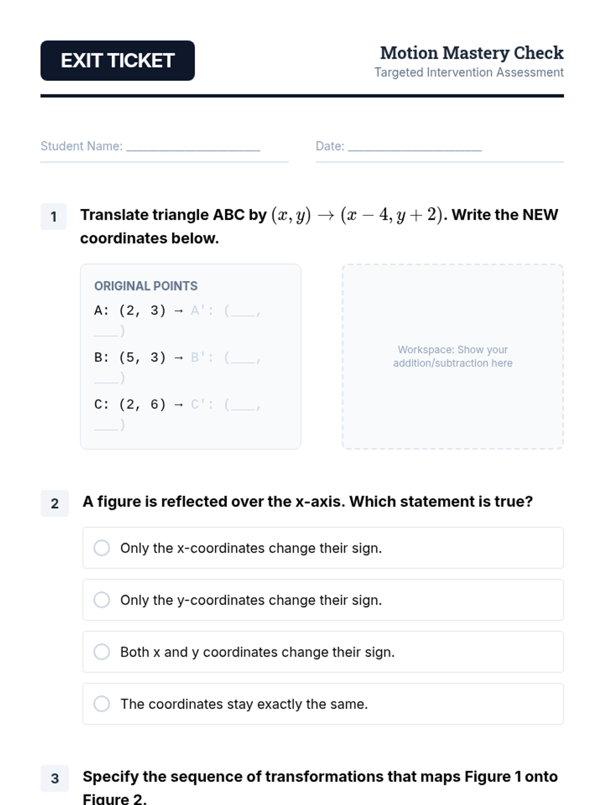A targeted Tier 2 intervention sequence focused on geometric transformations. It utilizes a Concrete-Representational-Abstract (CRA) approach, guiding struggling learners from physical manipulation with tracing paper to coordinate-based abstract rules.