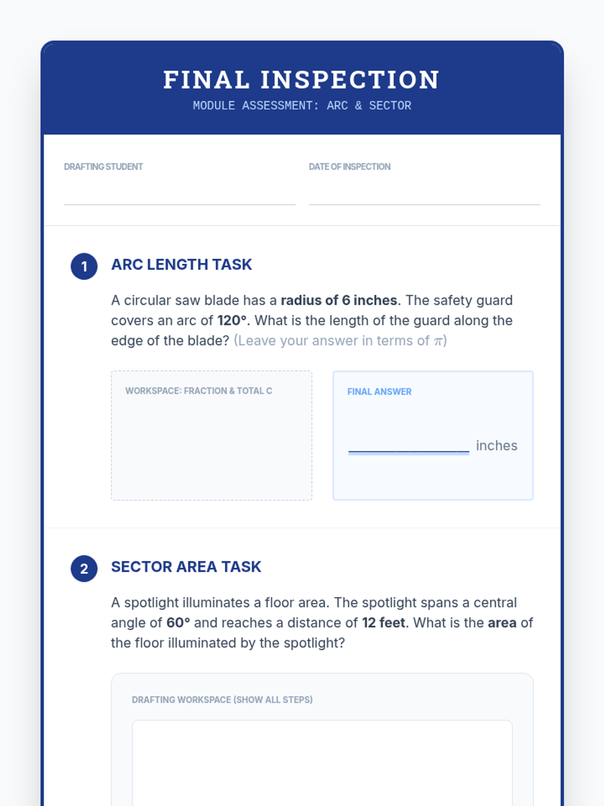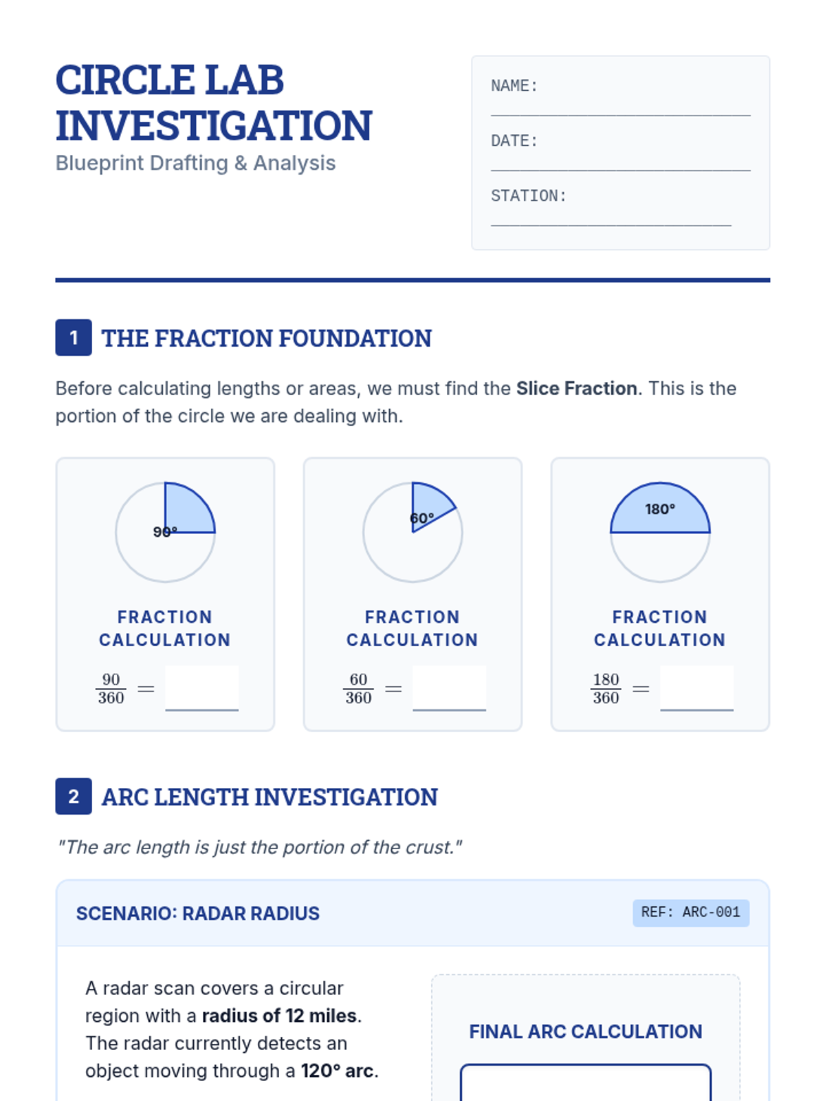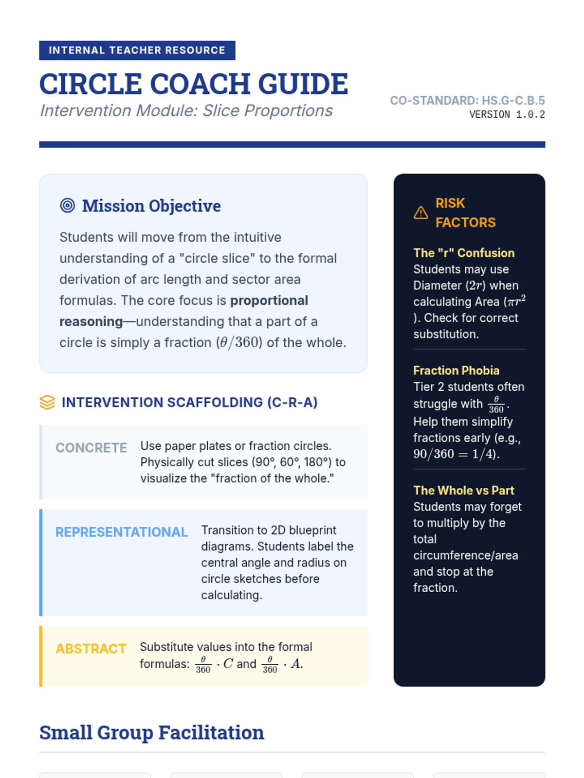A Tier 2 intervention sequence focused on foundational circle geometry concepts, specifically arc length proportionality and sector area using similarity reasoning. Students move from concrete measurement to abstract formula derivation.