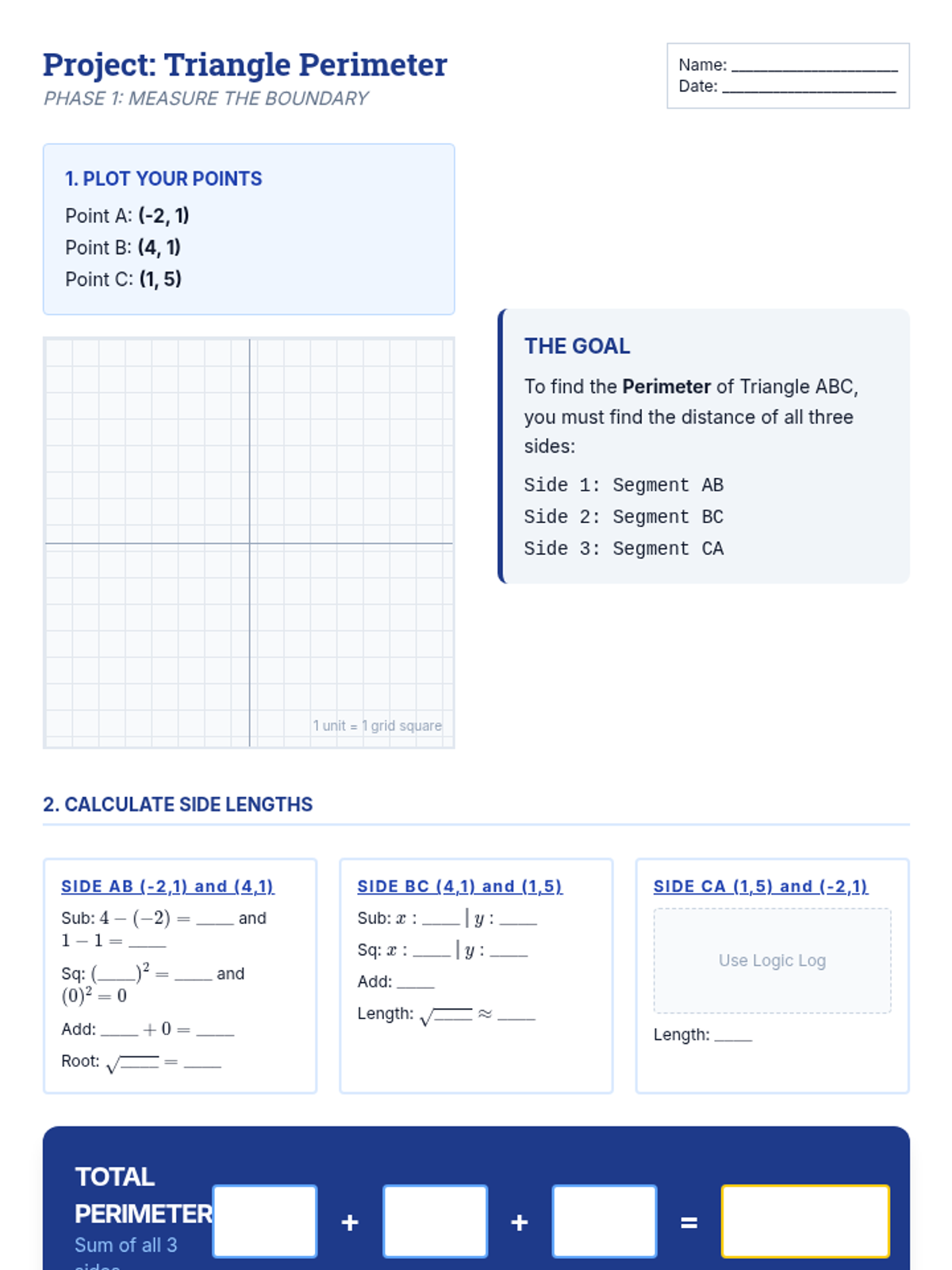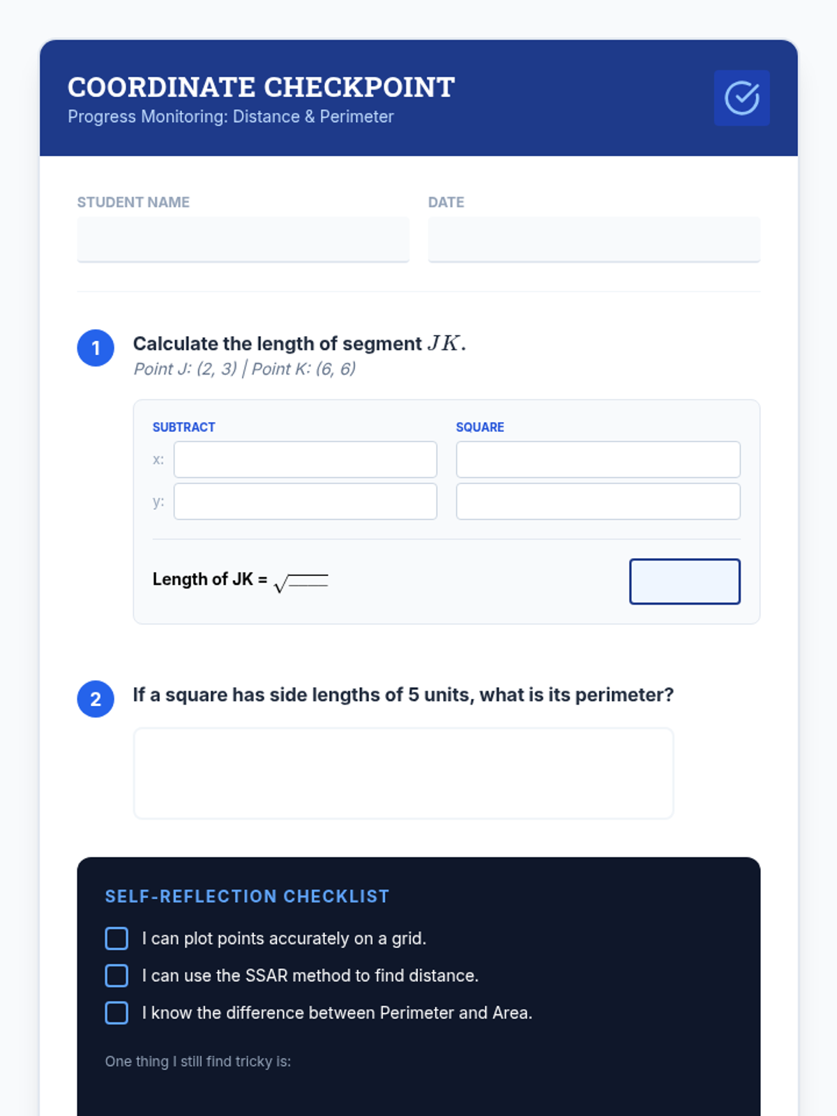 A targeted intervention sequence focused on helping High School students master the application of the distance formula to find perimeter and area in the coordinate plane. This unit uses structured calculation templates and scaffolded practice to support Tier 2 learners.
