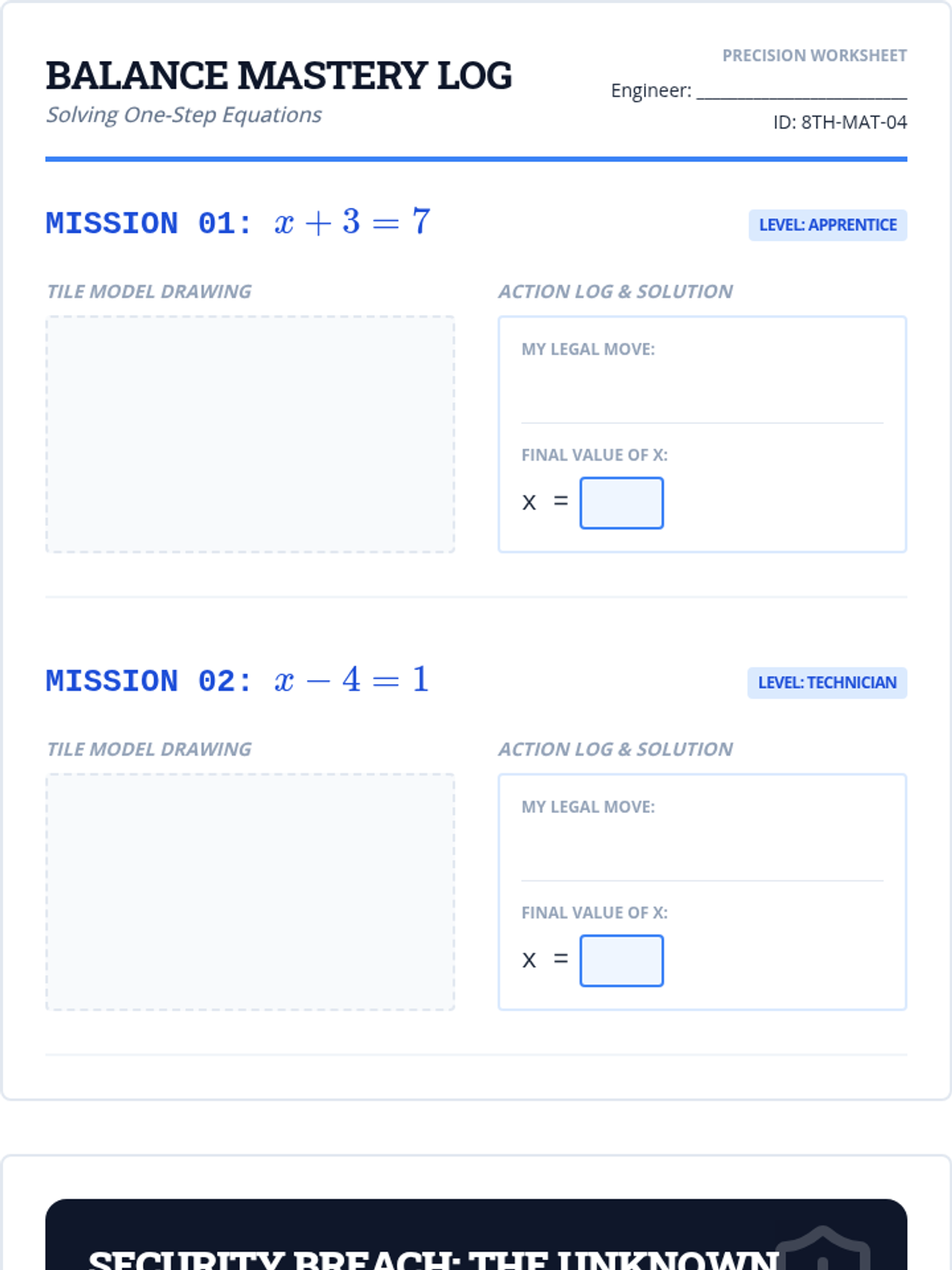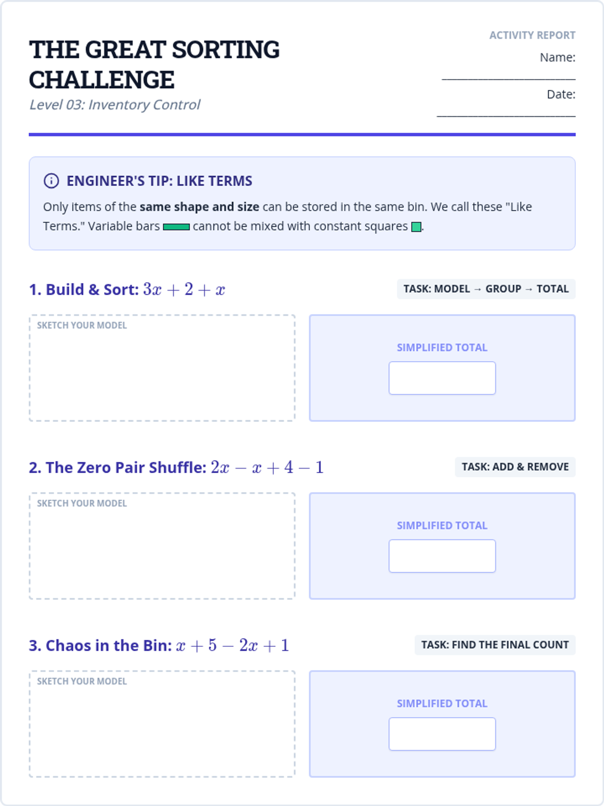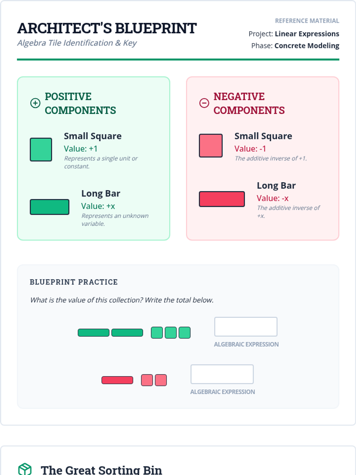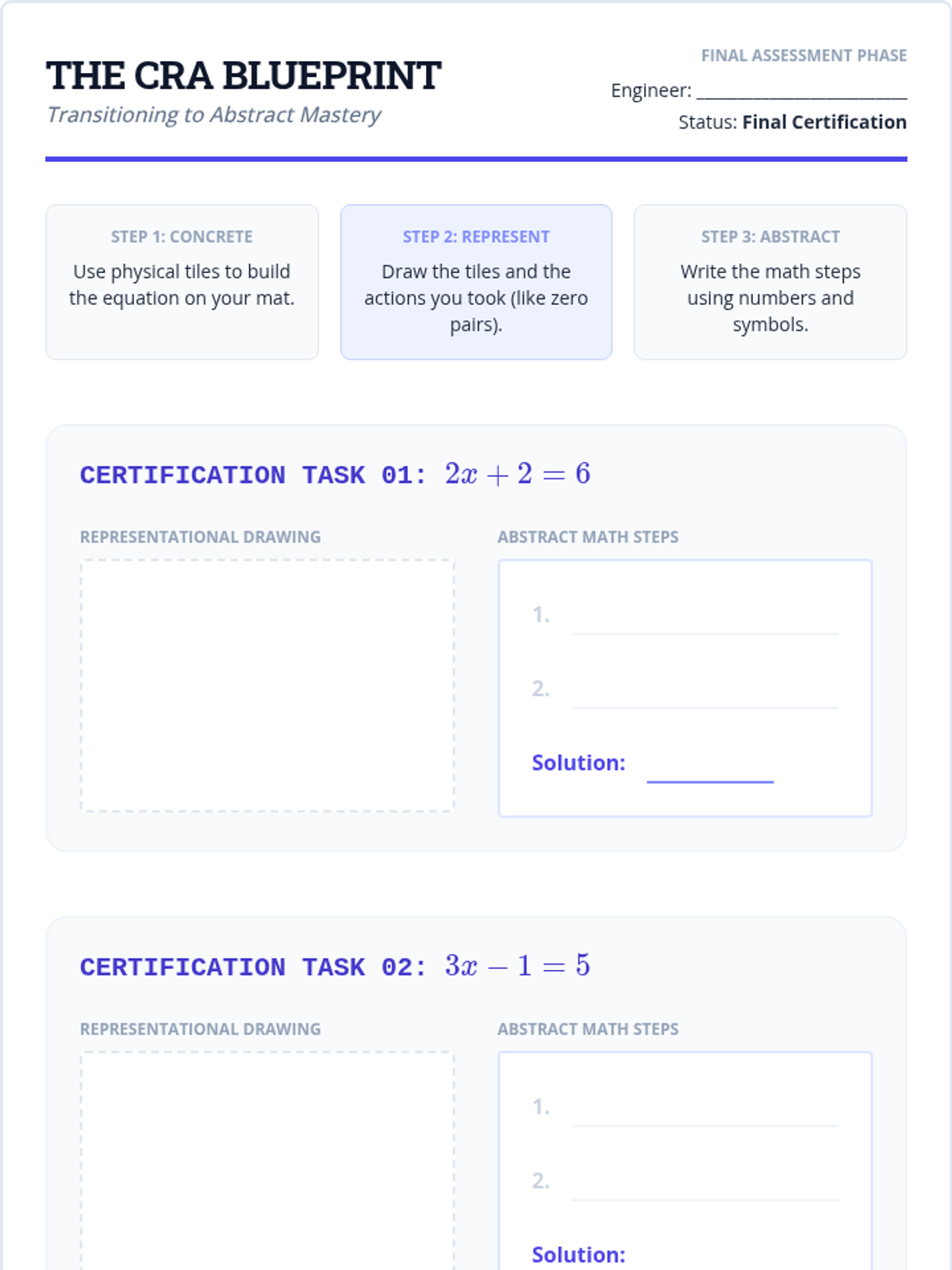 A specialized math support sequence for 8th-grade students, focusing on the Concrete-Representational-Abstract (CRA) transition for linear expressions and equations using algebra tiles. Students move from mastering zero pairs with integers to solving two-step equations through physical manipulation and visual modeling.