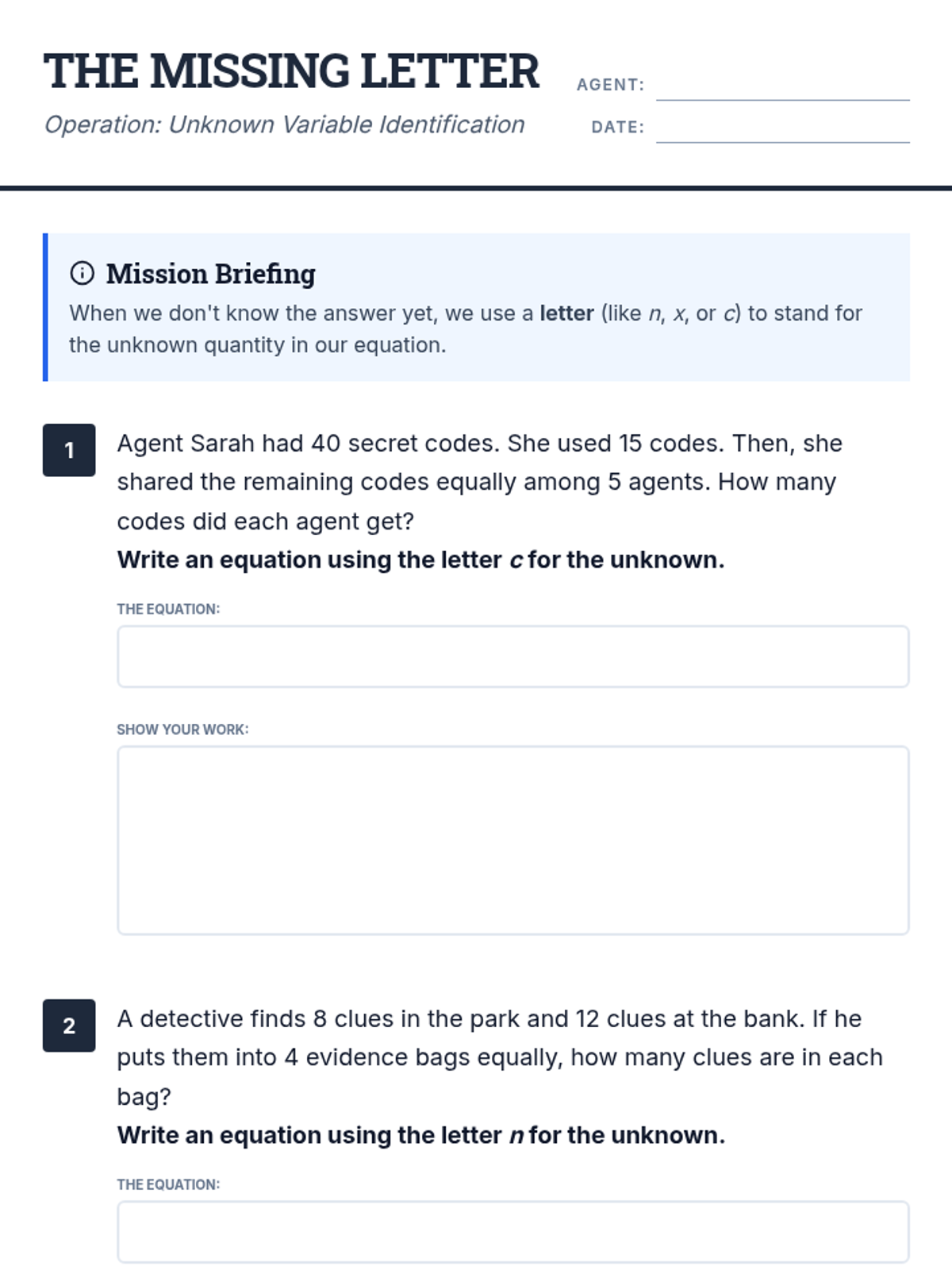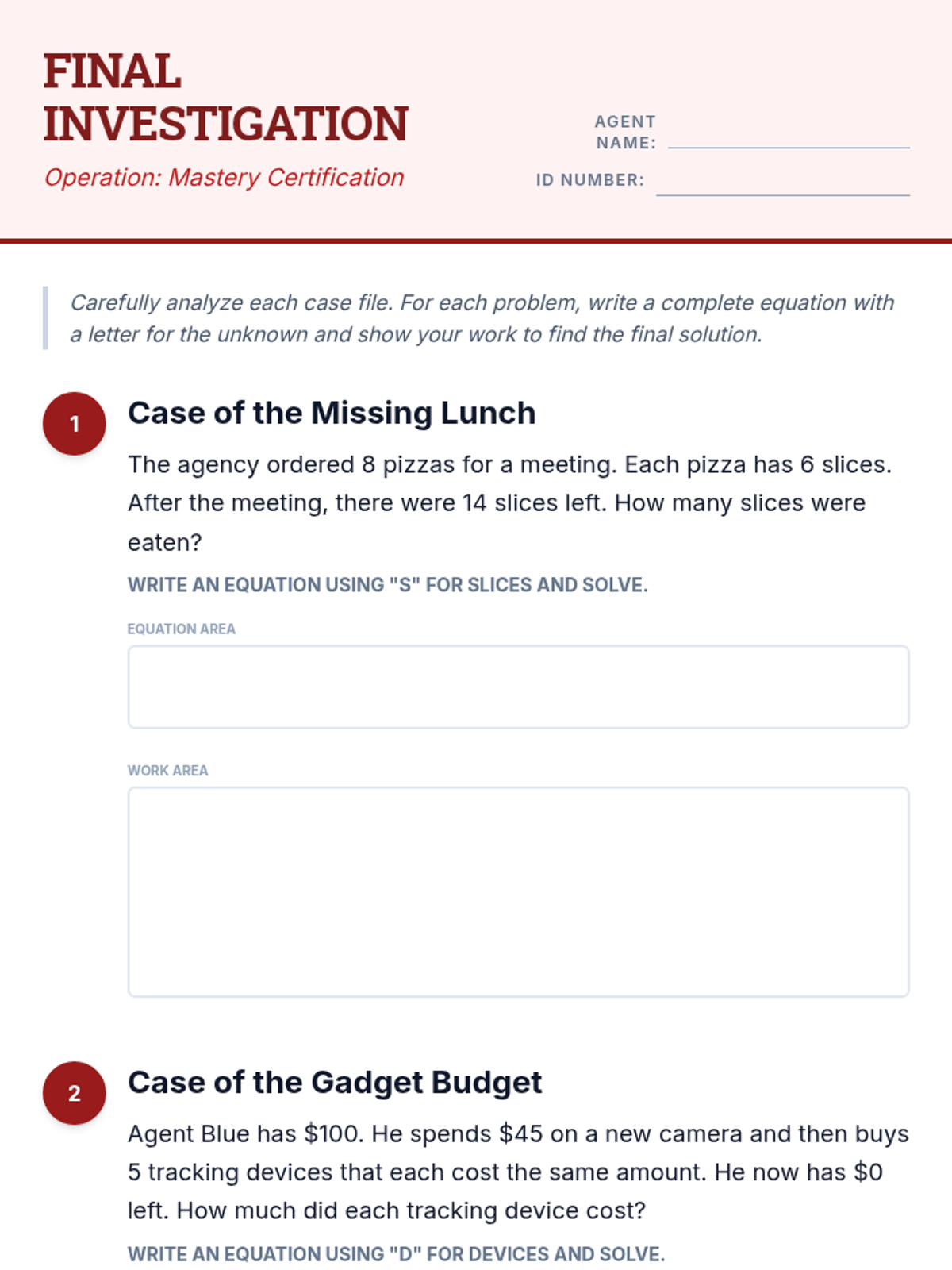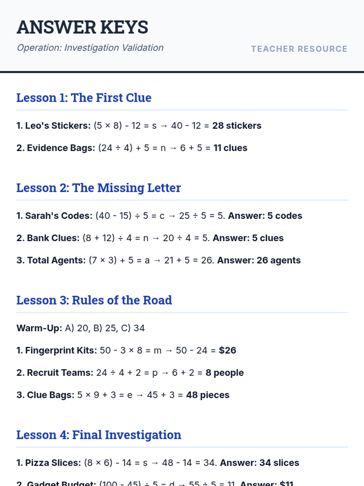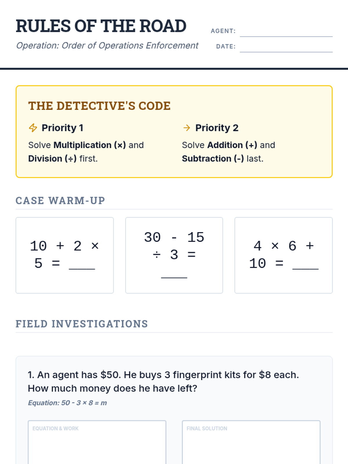 A comprehensive math unit focused on solving two-step word problems using the four operations, representing unknowns with letters, and applying the Order of Operations. The unit follows a "Mystery Agency" theme where students act as detectives solving numerical cases.