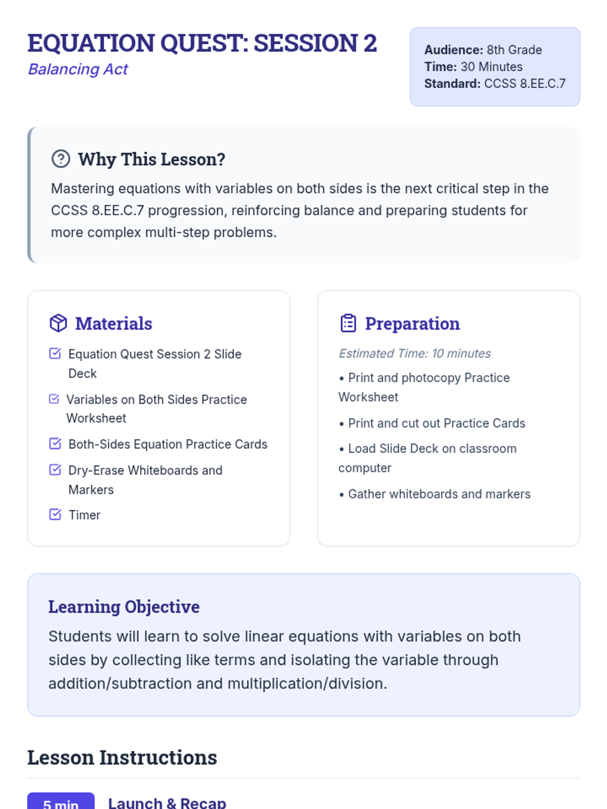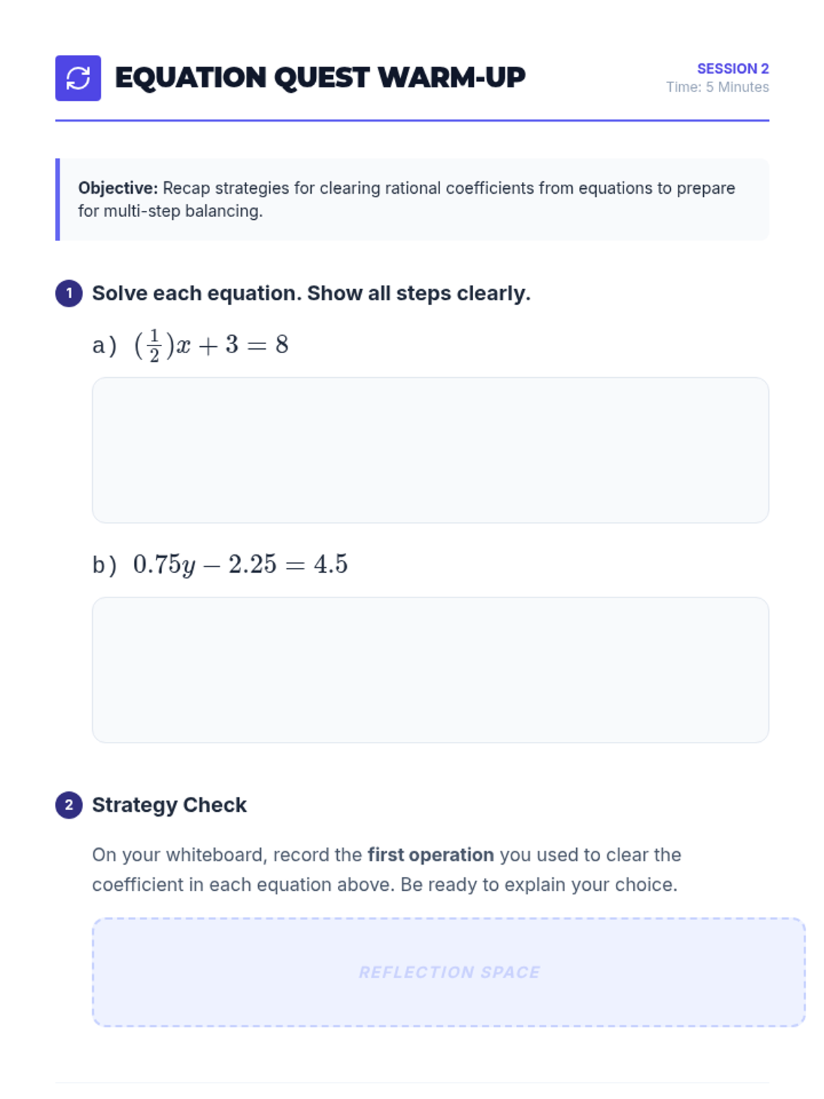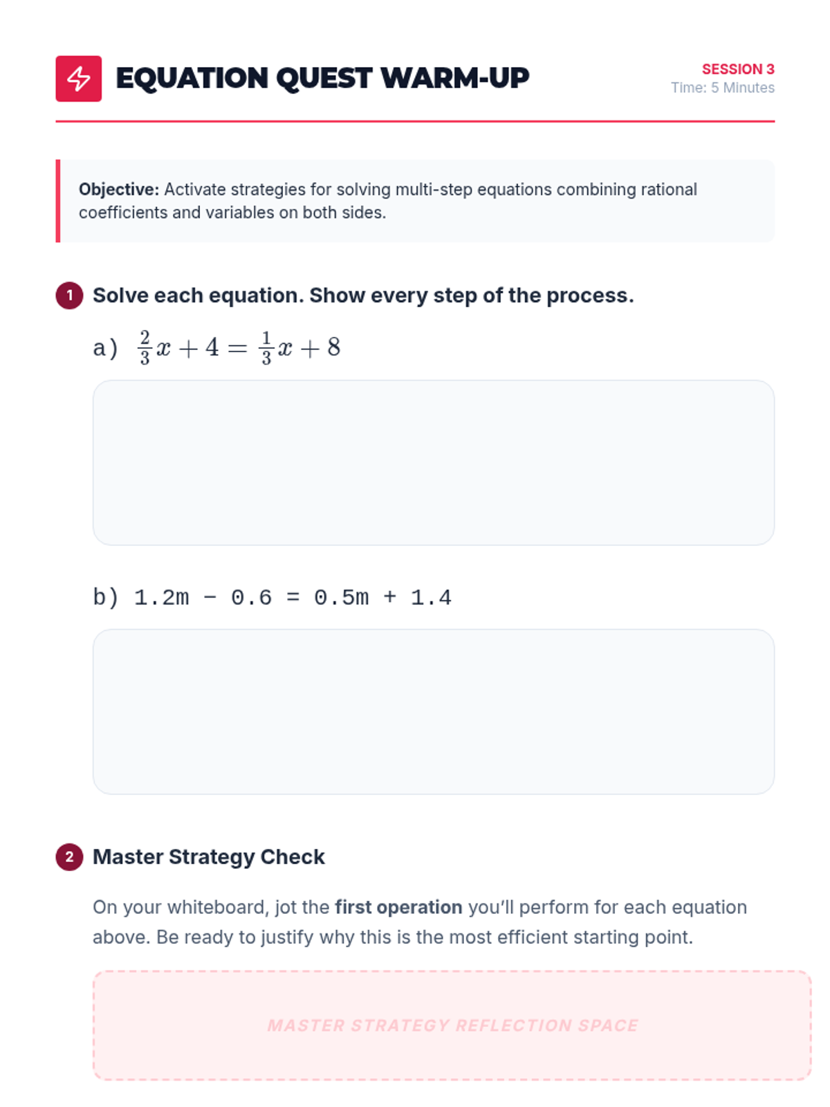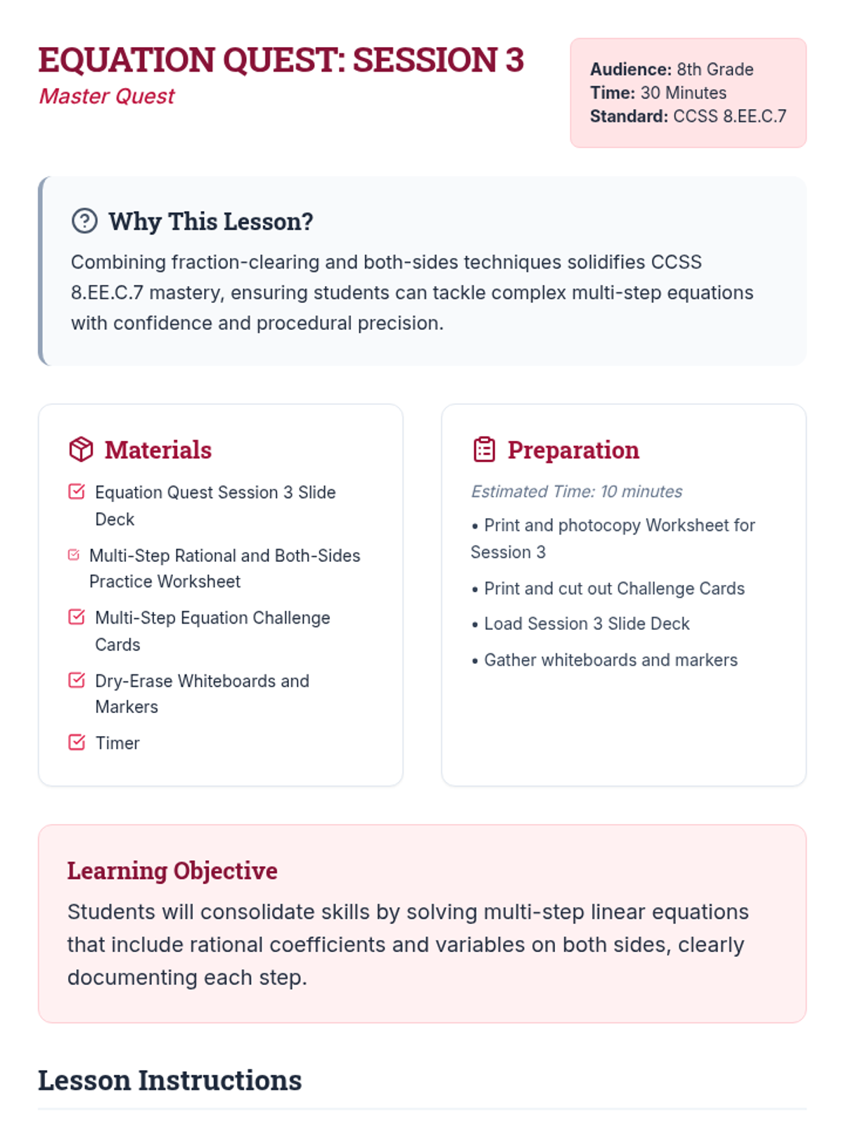 A three-session progression for mastering multi-step linear equations with rational coefficients, guiding 8th graders from foundational review to complex multi-step problem-solving.