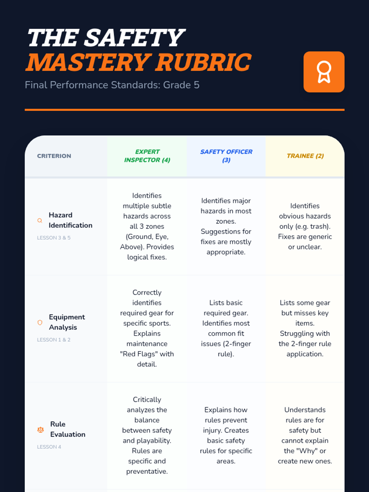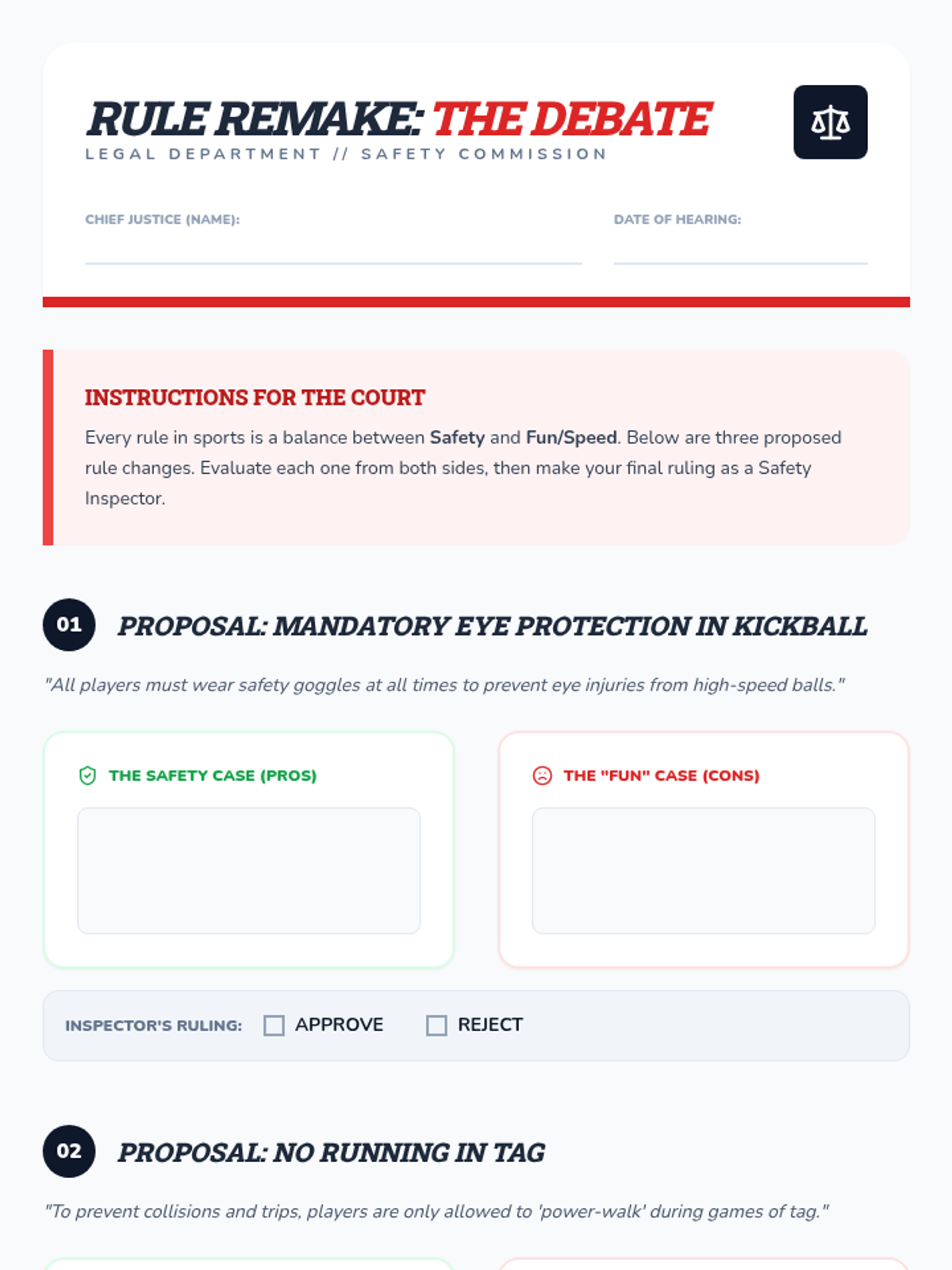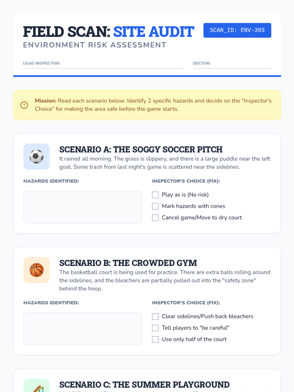 Students become safety inspectors to evaluate sports equipment, environmental hazards, and the protective nature of rules to prevent injuries. Through hands-on experiments and site audits, they learn to create safer spaces for physical activity.