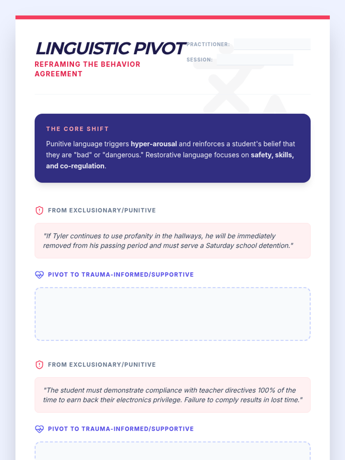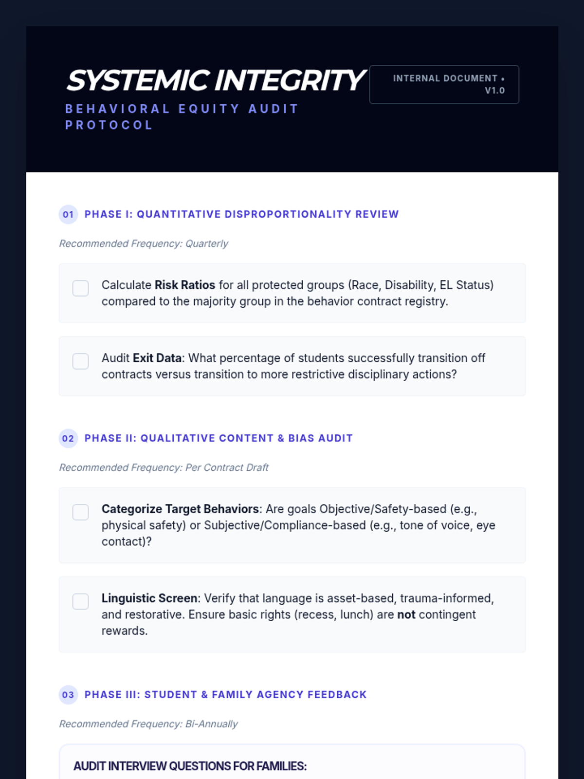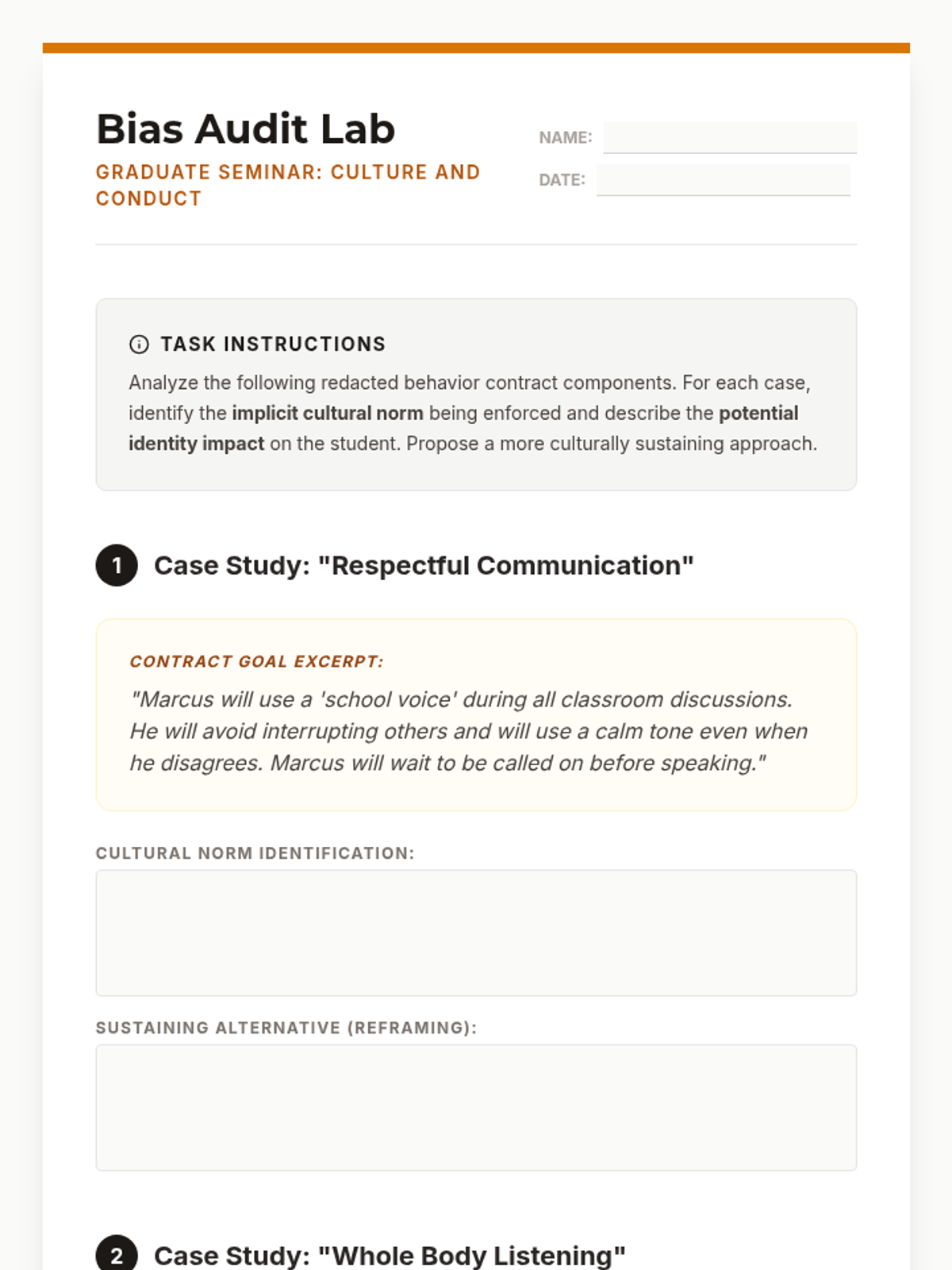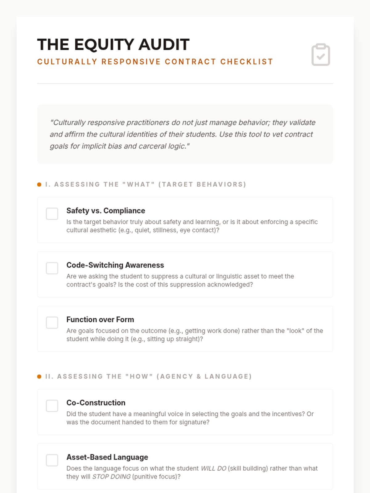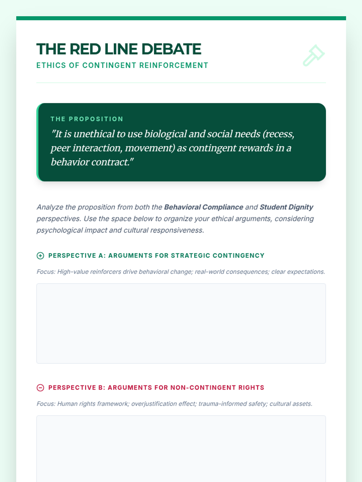 A graduate-level exploration of the ethics and cultural implications of behavior contracting, moving beyond technical implementation to focus on equity, dignity, and power dynamics. Students will learn to audit behavioral systems for bias and craft restorative, trauma-informed agreements.