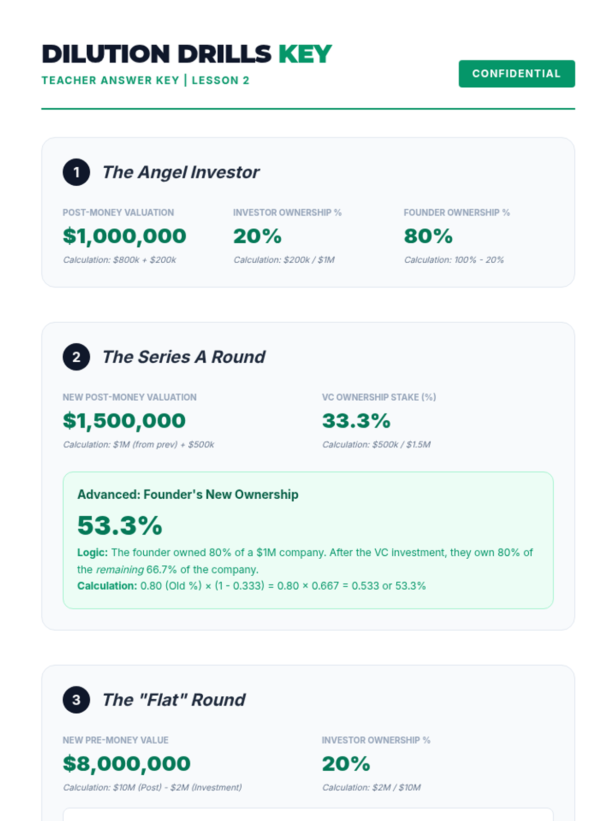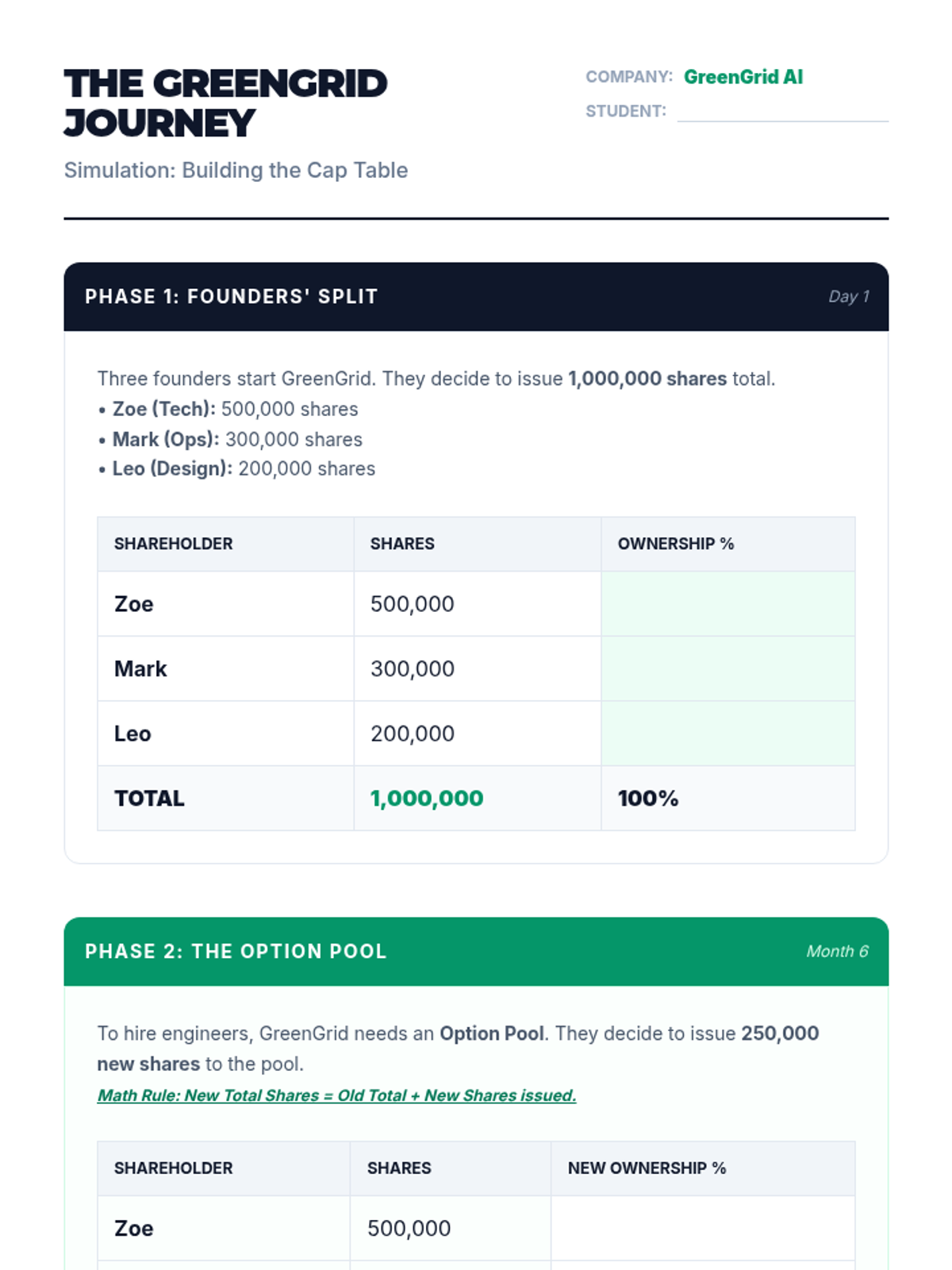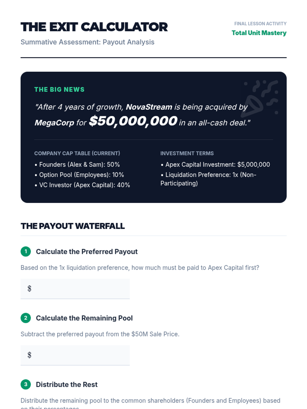 A comprehensive unit on startup finance focusing on equity allocation, valuation, dilution, and investment terms. Students learn to navigate the complex financial lifecycle of a high-growth startup from founding to exit.