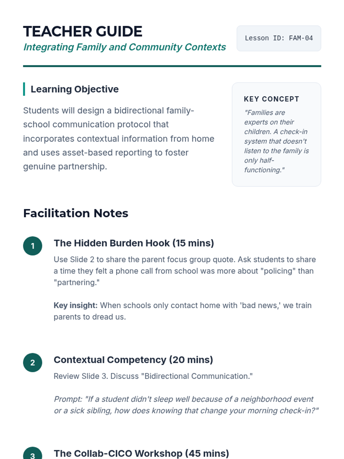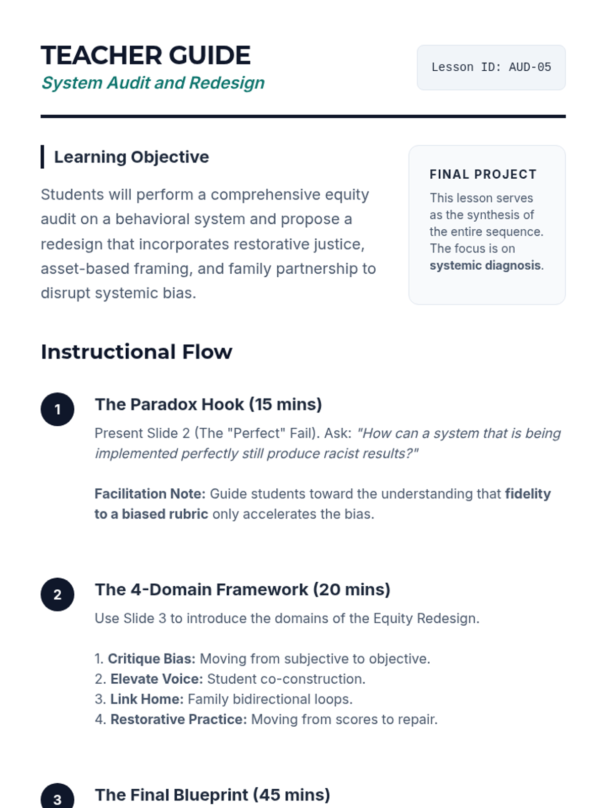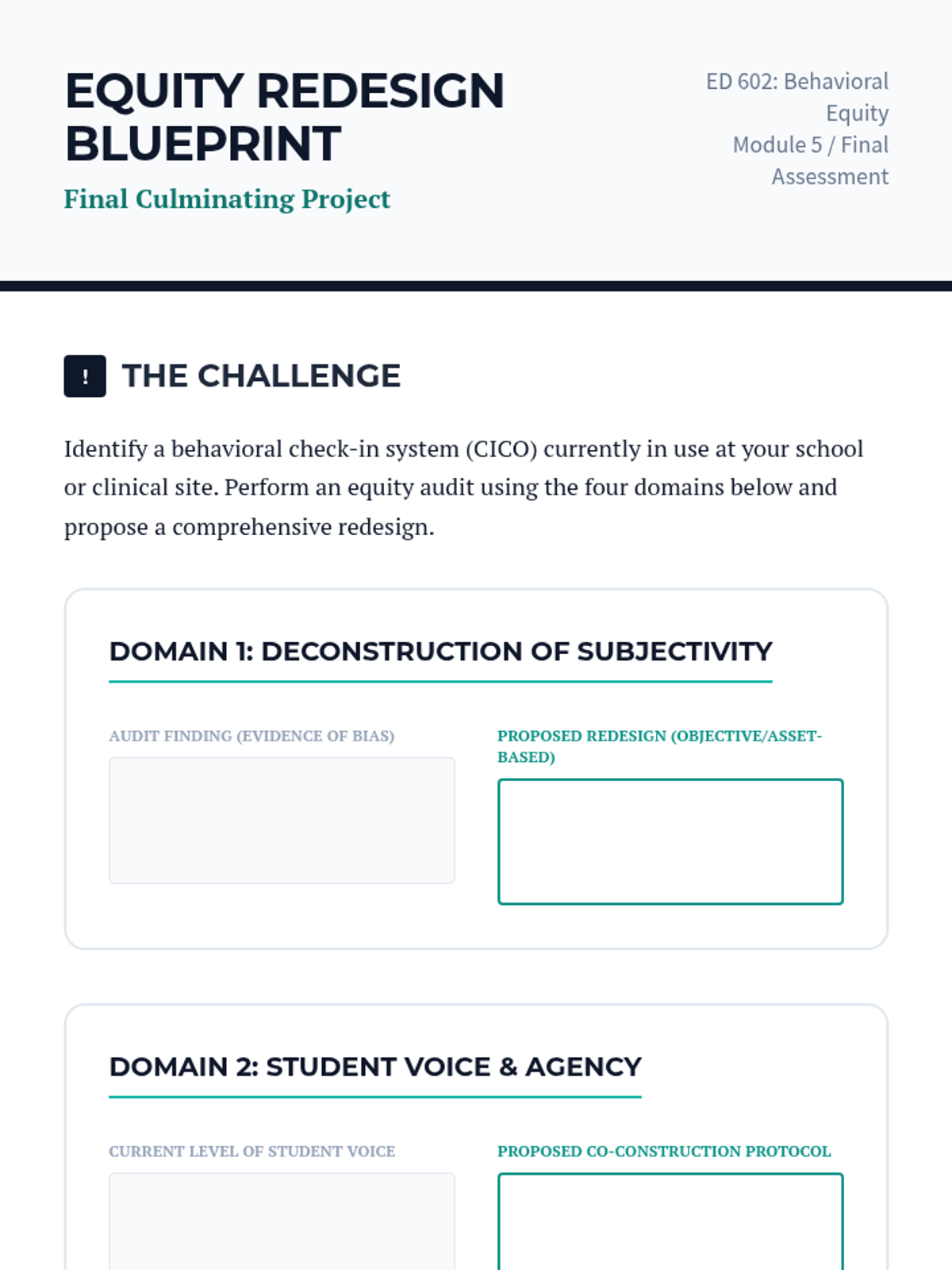 A graduate-level sequence focused on interrogating and redesigning behavioral check-in procedures through a lens of cultural responsiveness and equity. Students will move from deconstructing implicit bias to designing asset-based, family-engaged systems.