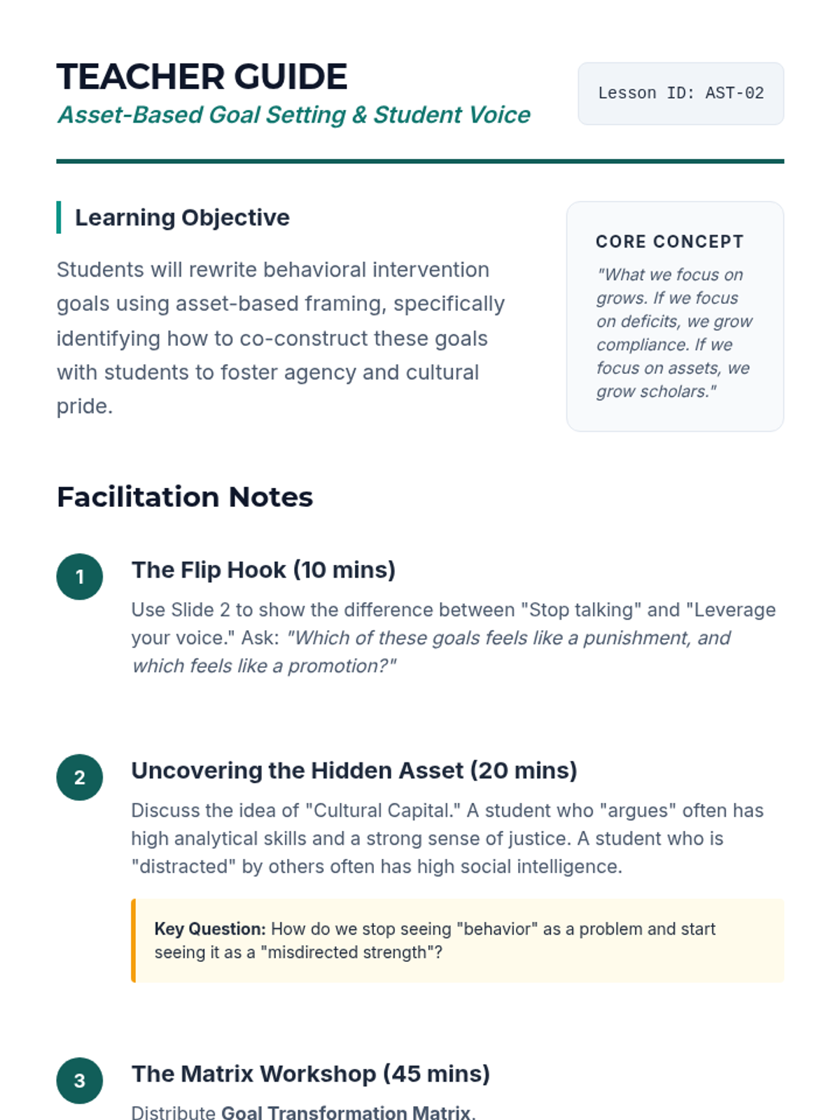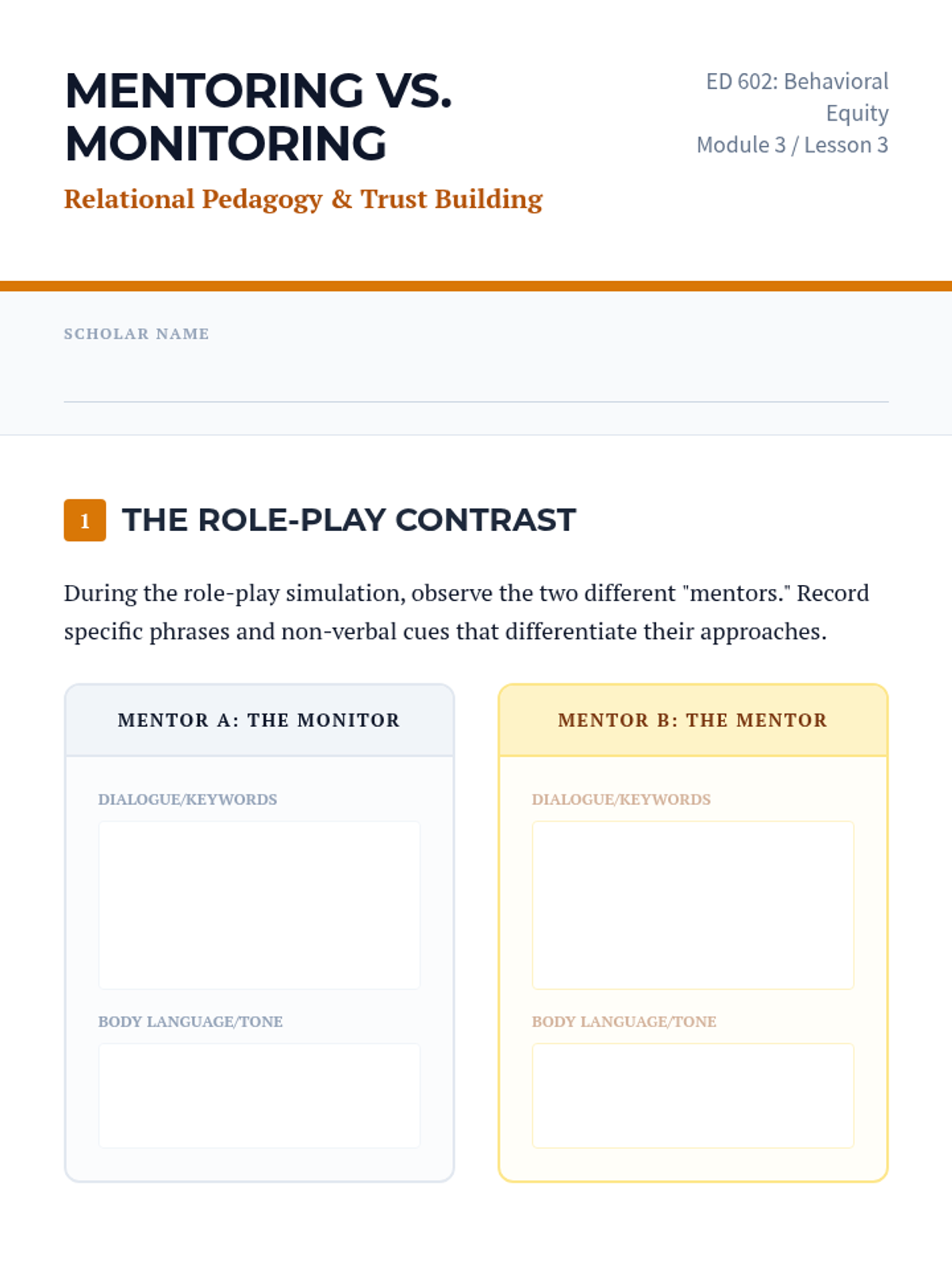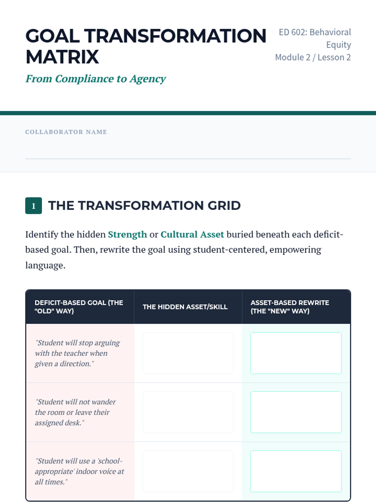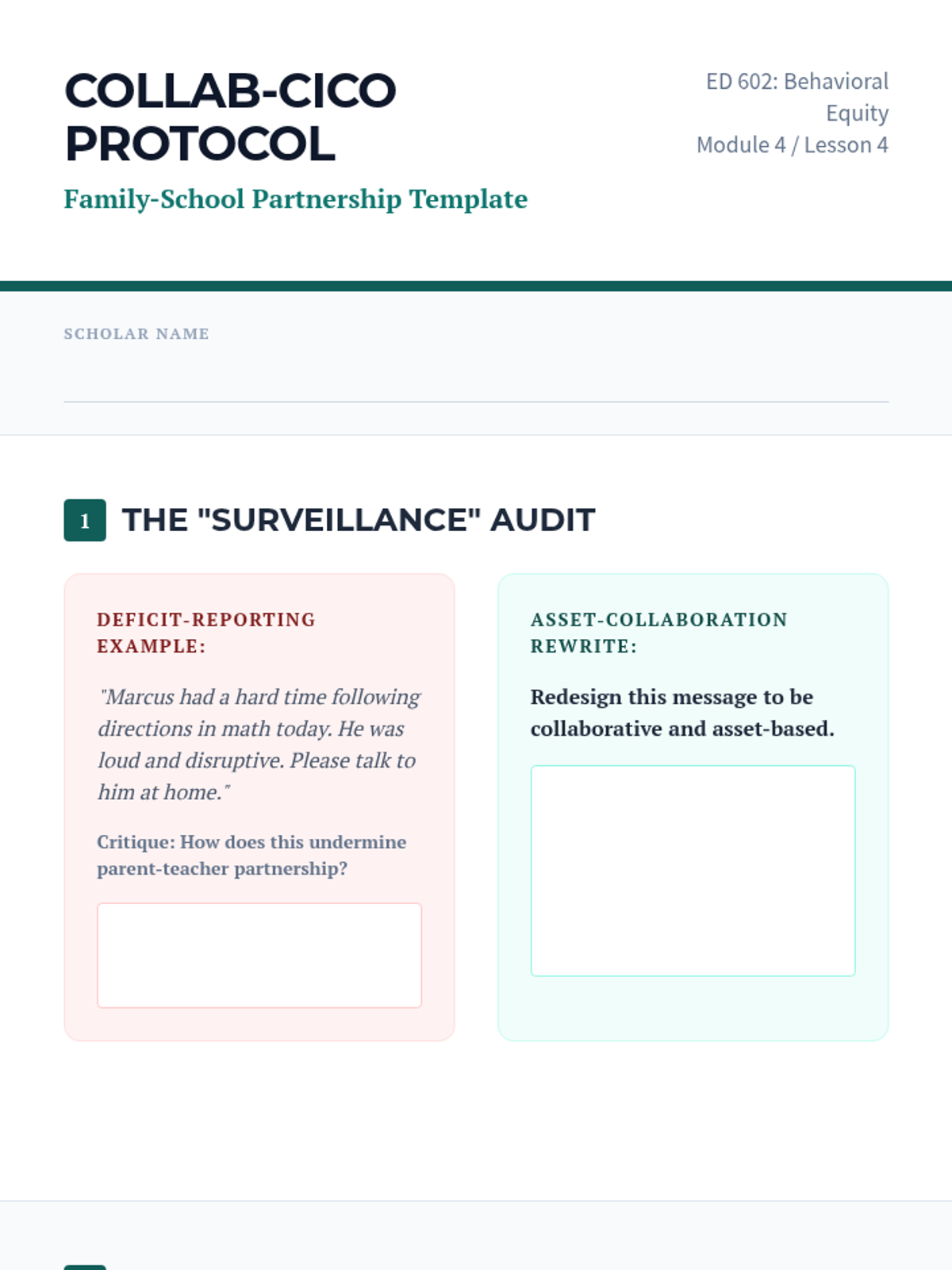A graduate-level sequence focused on interrogating and redesigning behavioral check-in procedures through a lens of cultural responsiveness and equity. Students will move from deconstructing implicit bias to designing asset-based, family-engaged systems.