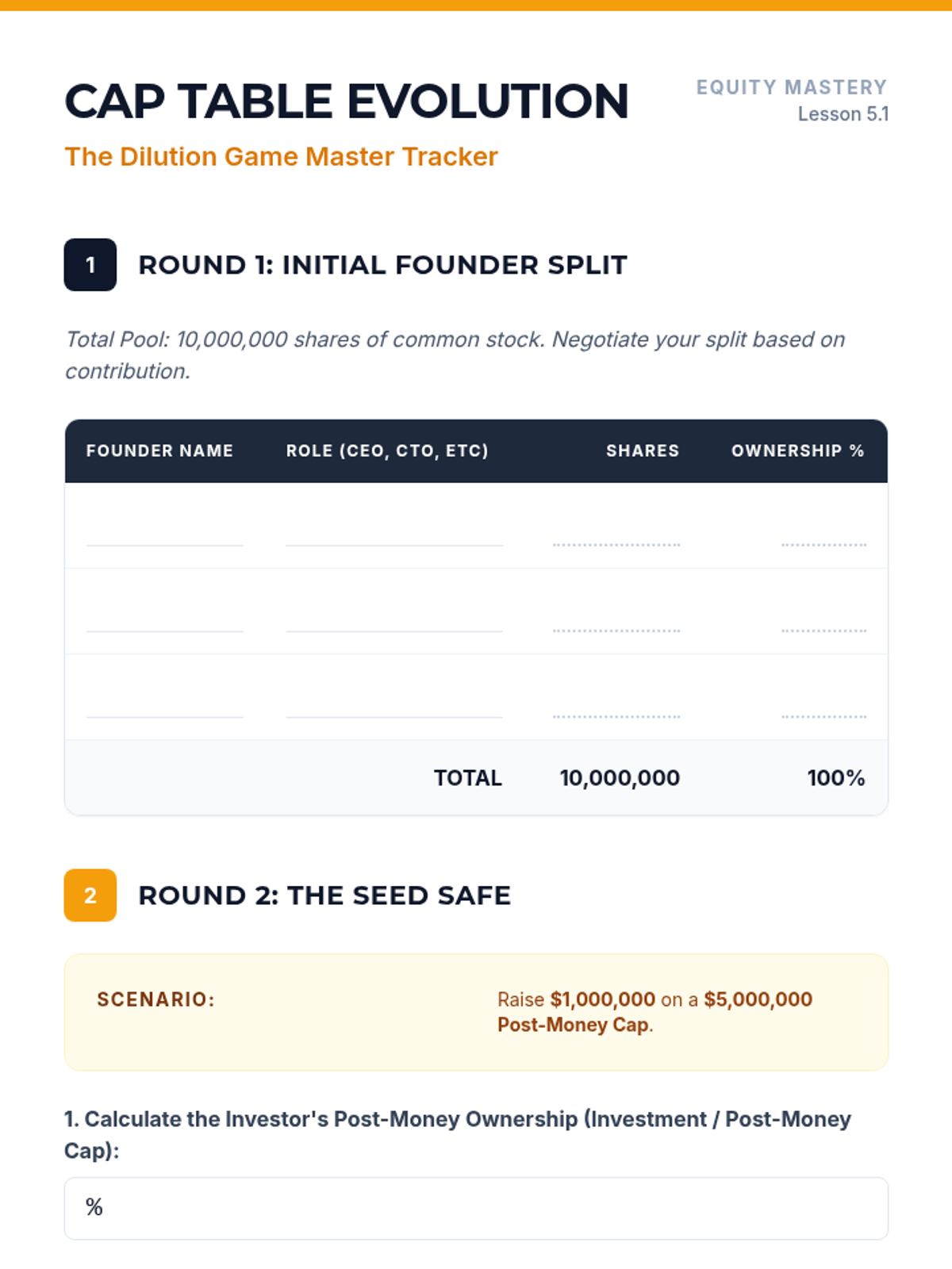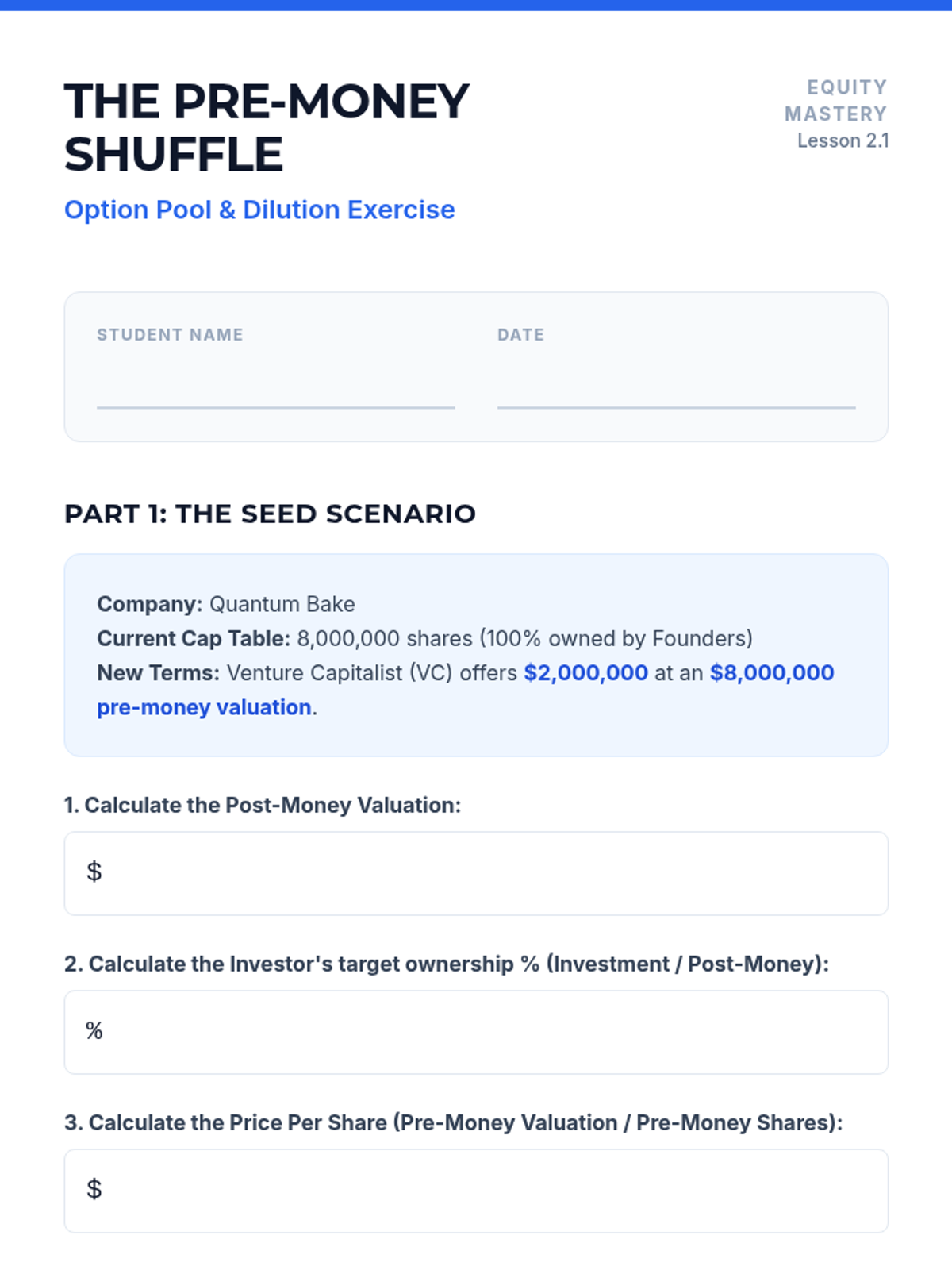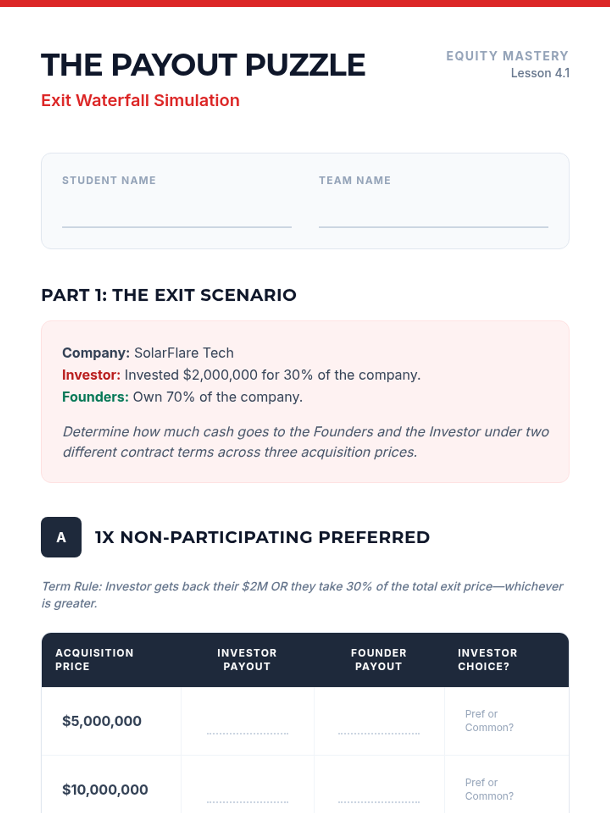 A comprehensive sequence on equity management, cap tables, and dilution for undergraduate entrepreneurs. Students learn to navigate the financial and legal complexities of startup ownership from inception to exit.