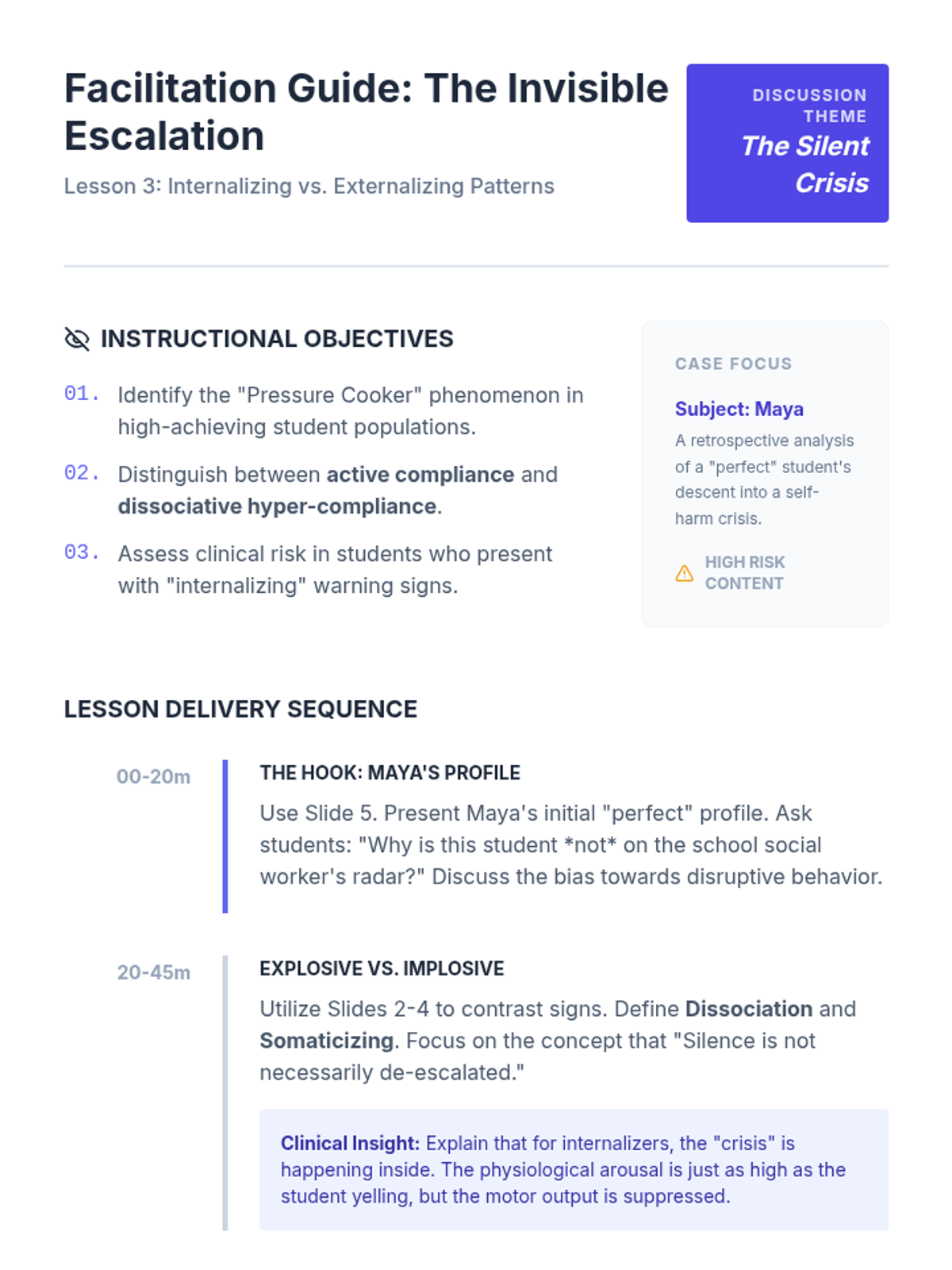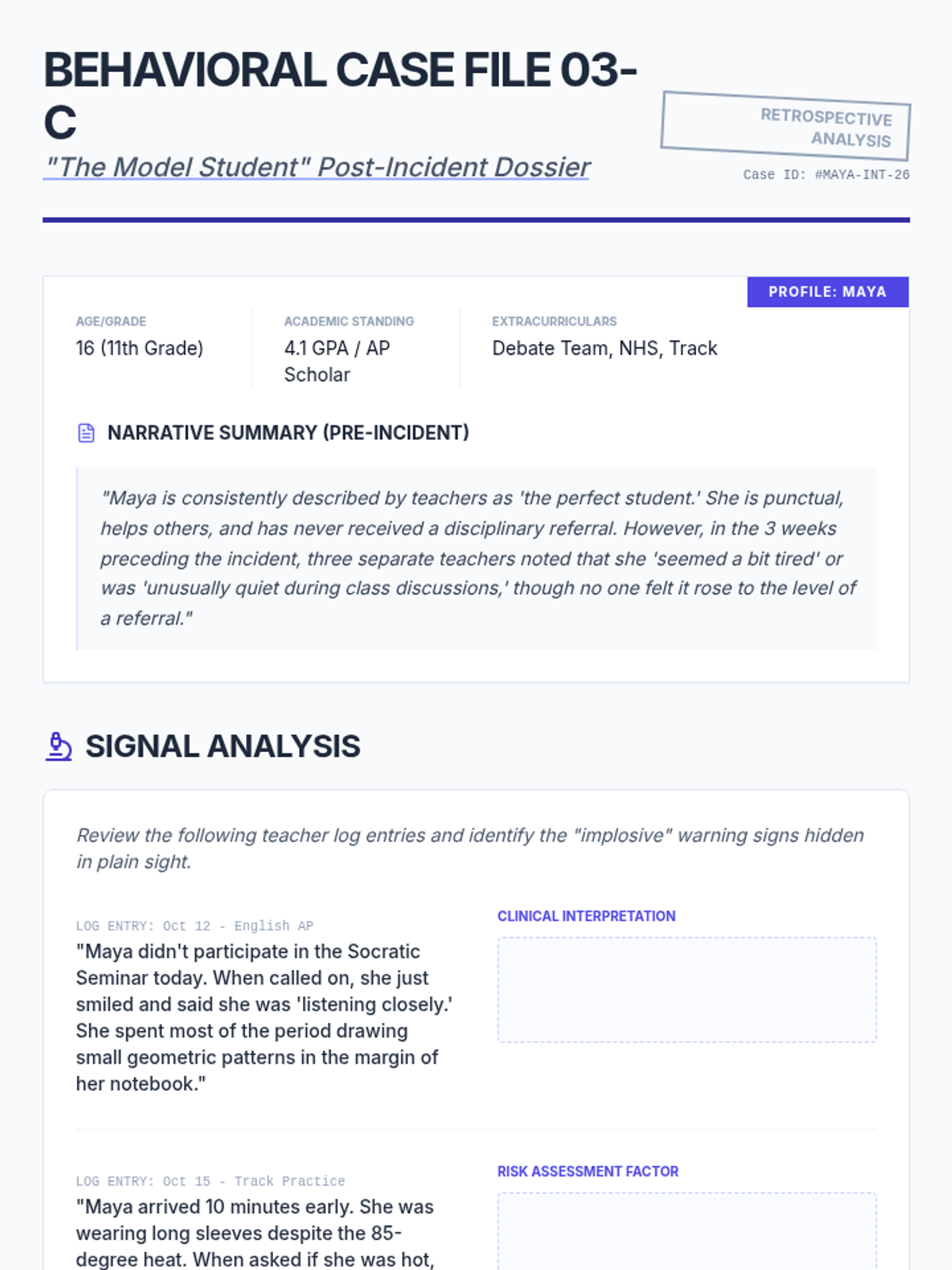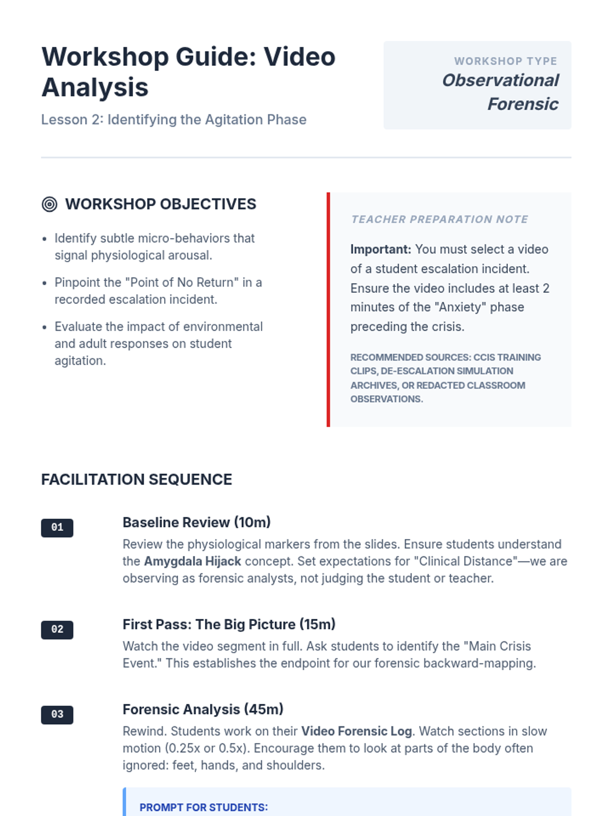 A graduate-level sequence focused on the forensic analysis of behavioral escalation. Students utilize case studies, FBA data, and cultural context to identify subtle warning signs and predict agitation patterns in diverse student populations.