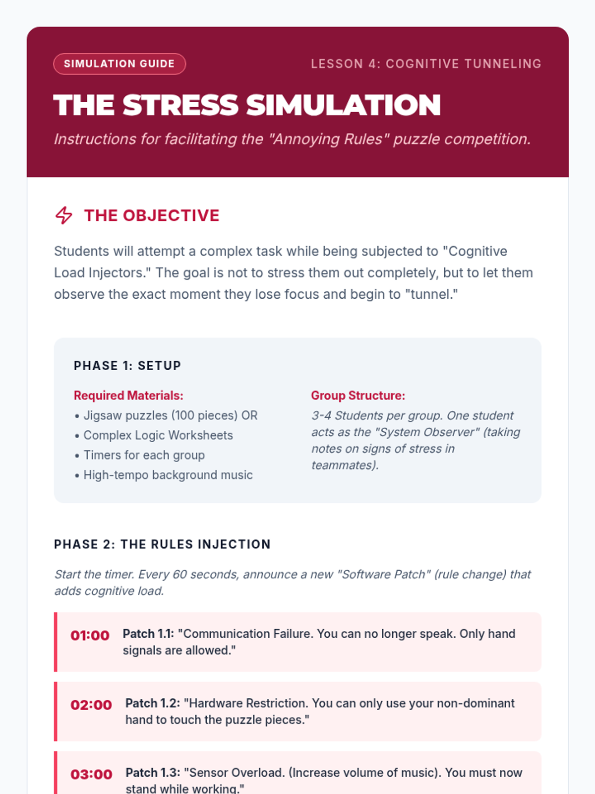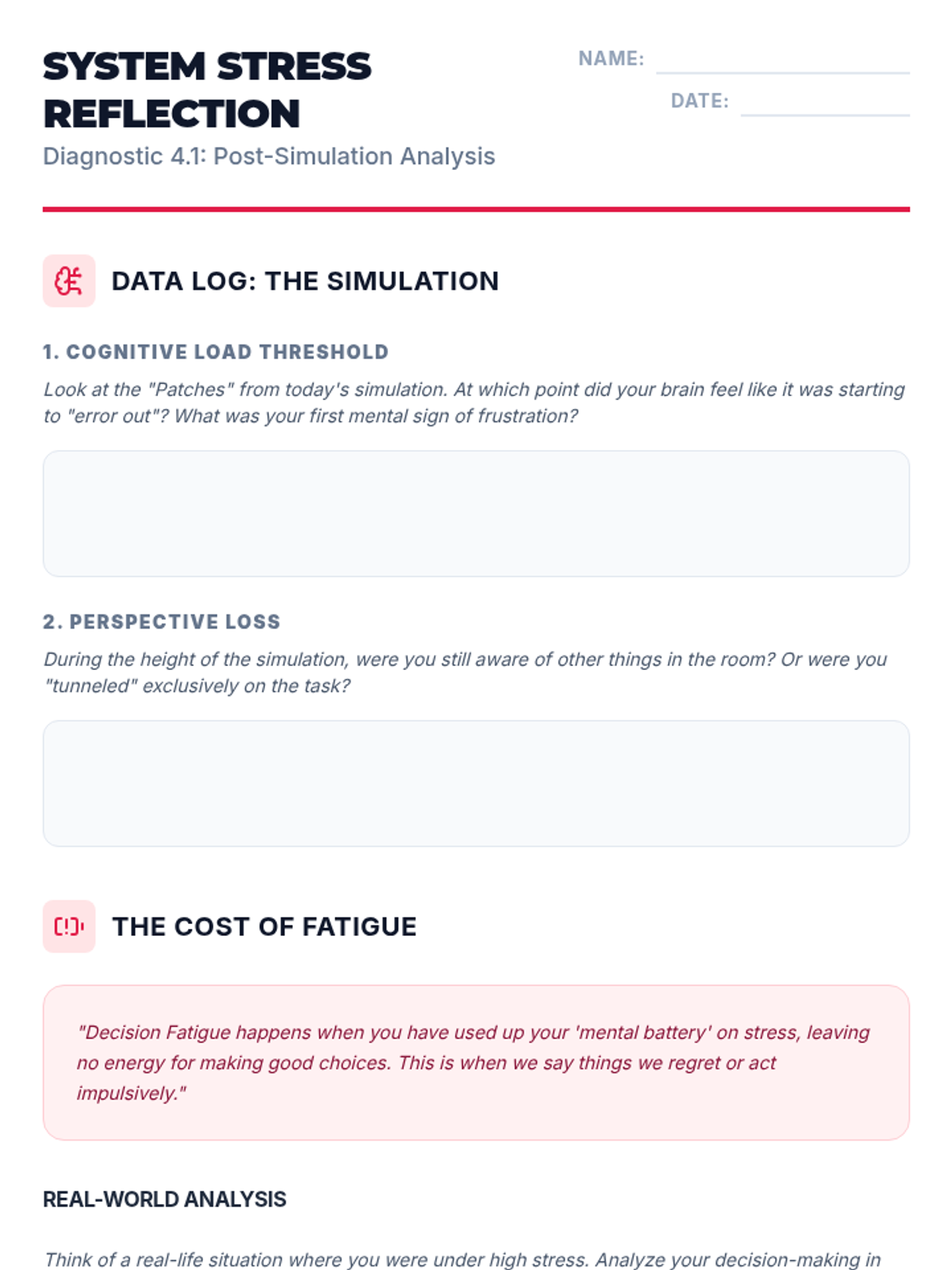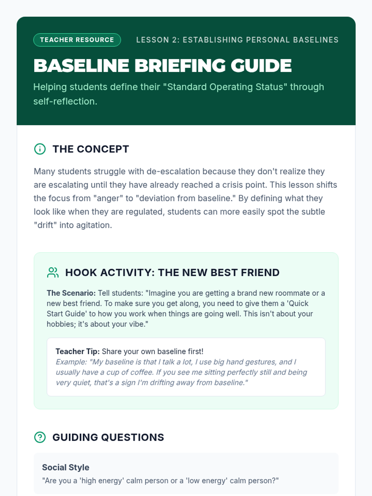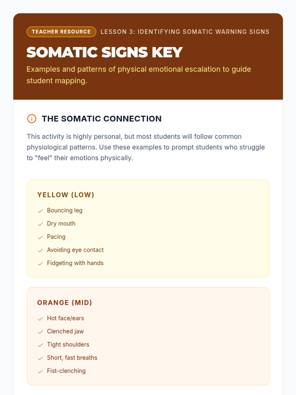 A 5-lesson sequence for 9th-grade students focusing on the physiological and cognitive aspects of emotional escalation. Students learn to identify early warning signs in their bodies and minds to prevent crises through self-awareness and personalized monitoring protocols.