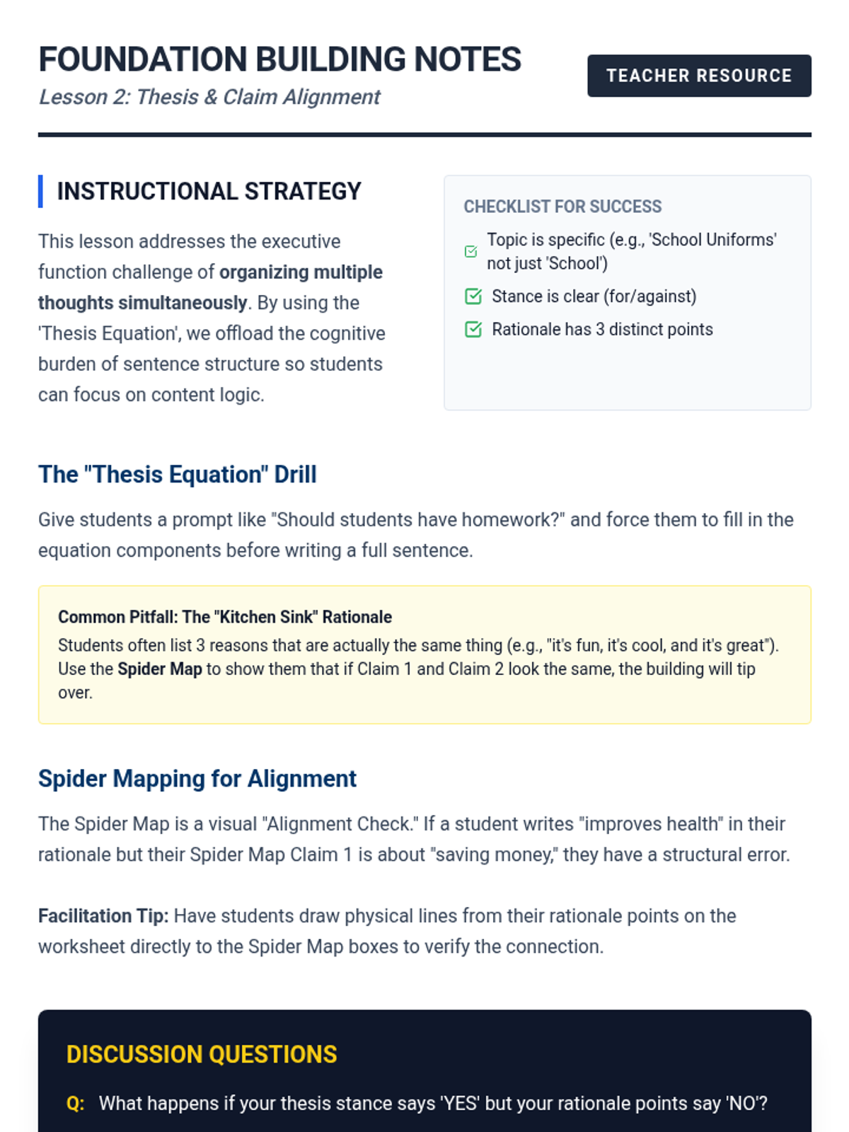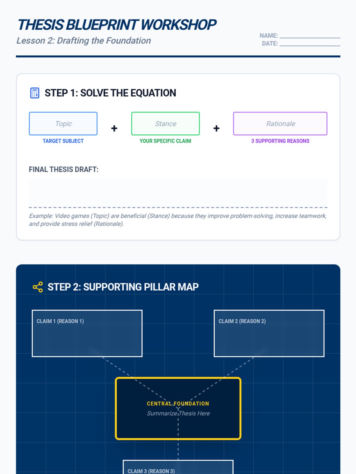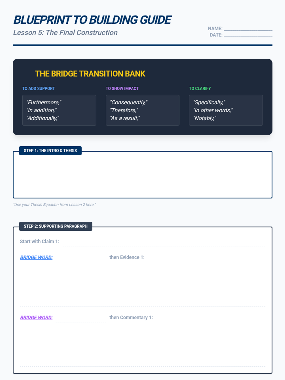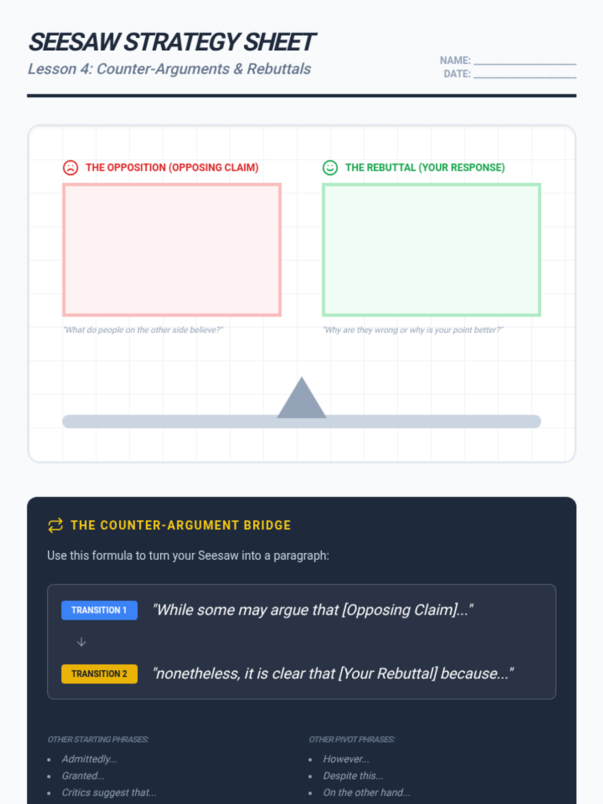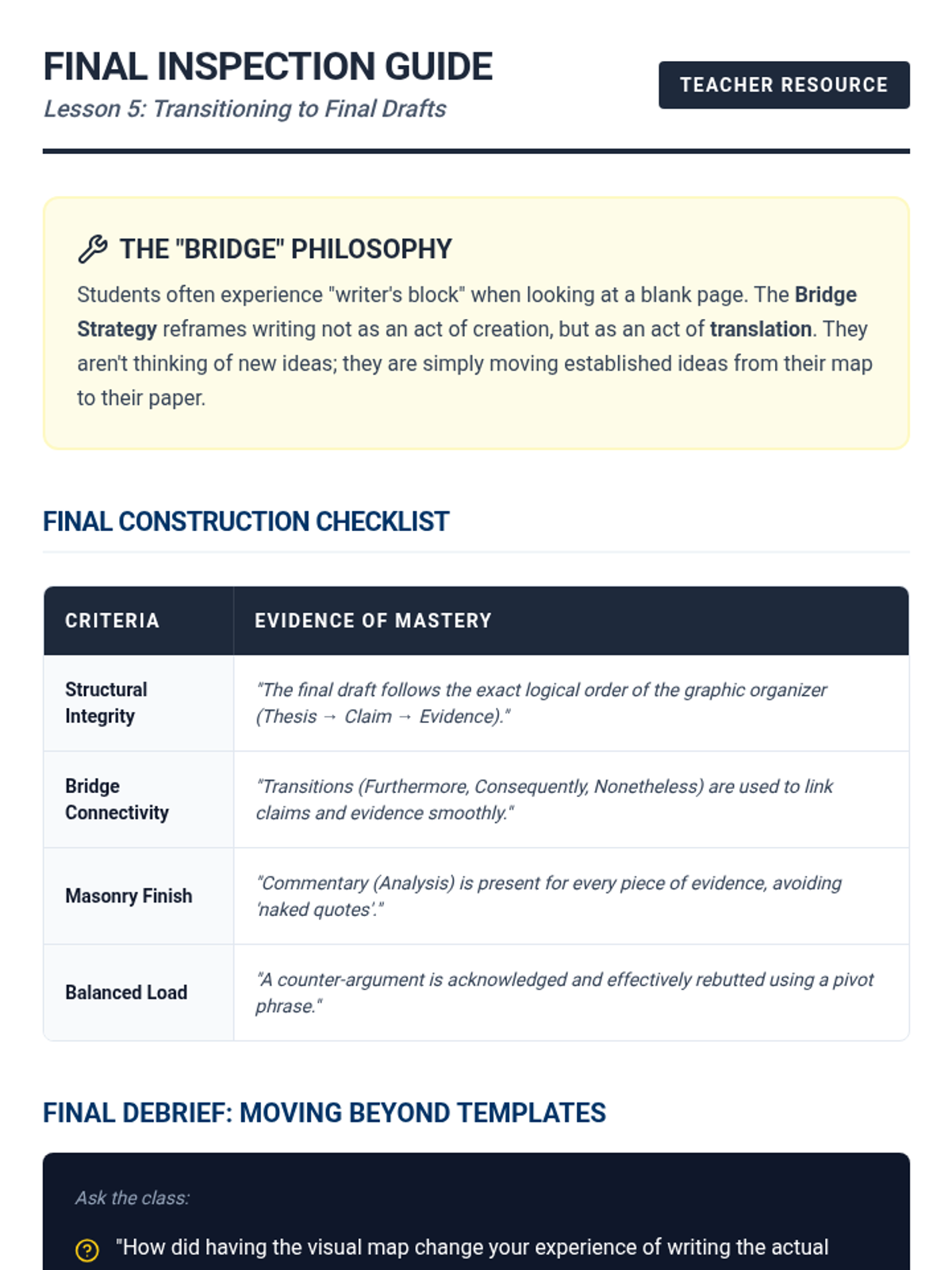 A specialized writing sequence for 11th-grade students that uses hierarchical graphic organizers to teach the architecture of argumentative essays. Students move from deconstructing model texts to generating their own visual blueprints for claims, evidence, and counter-arguments.