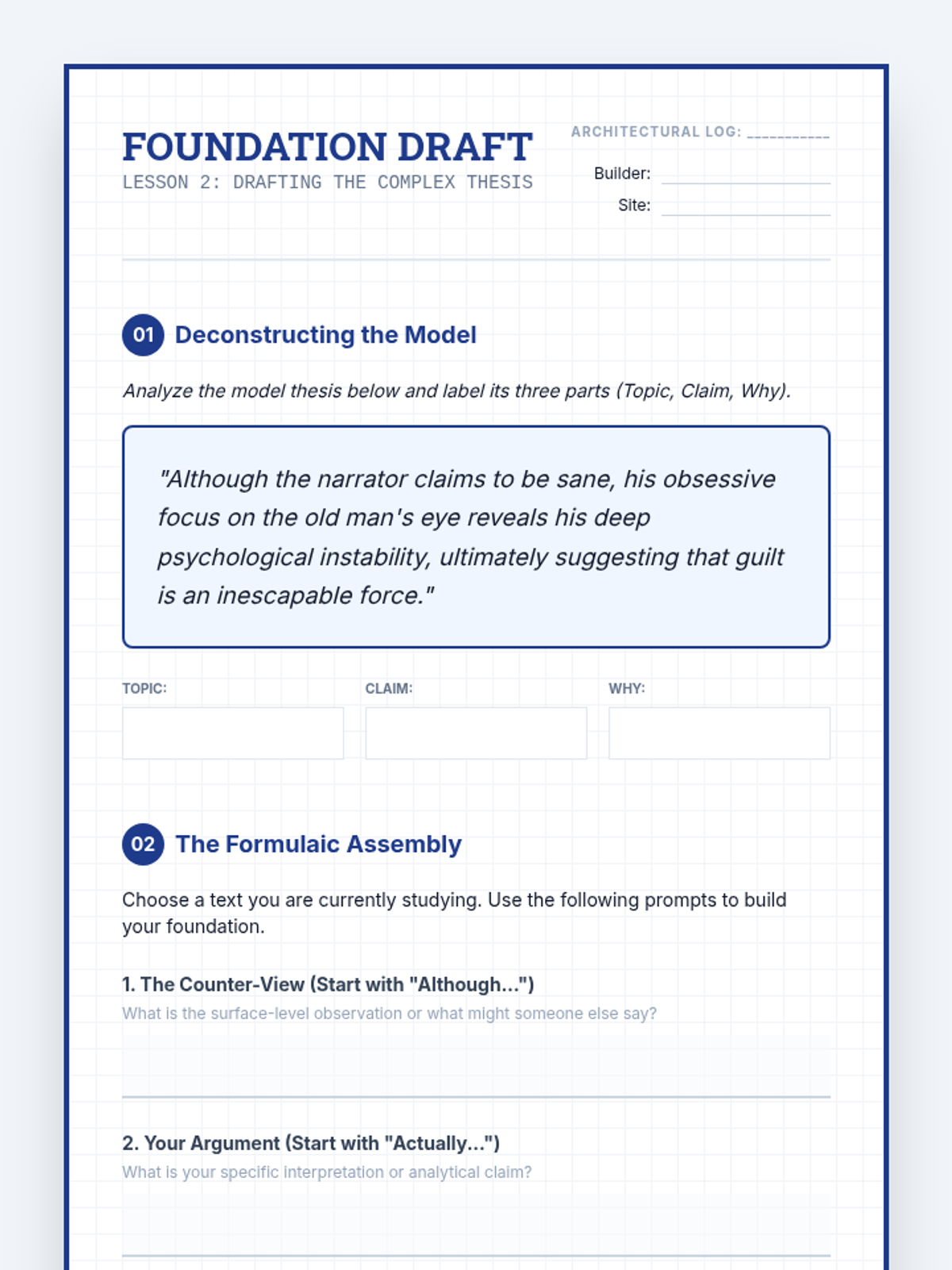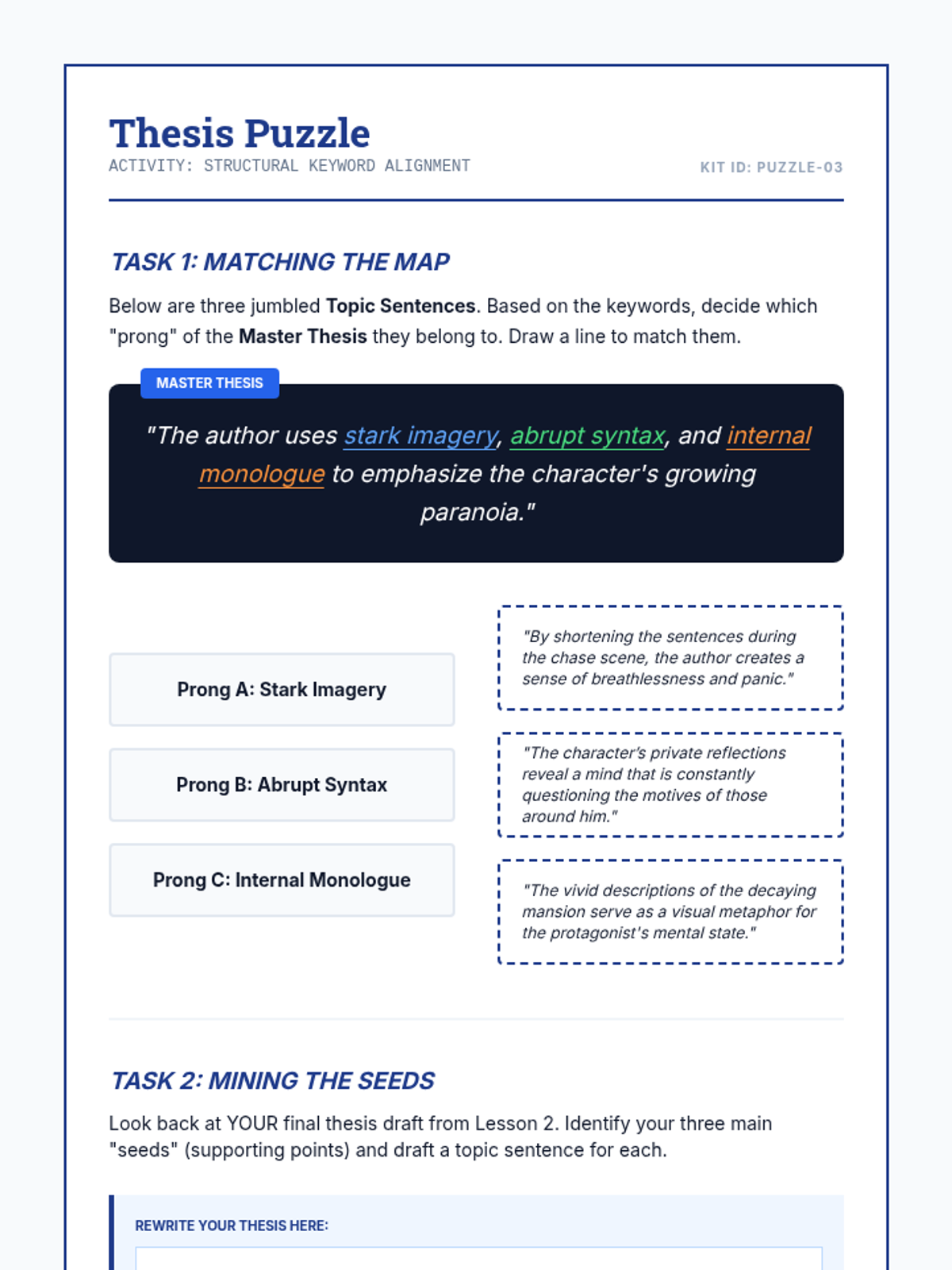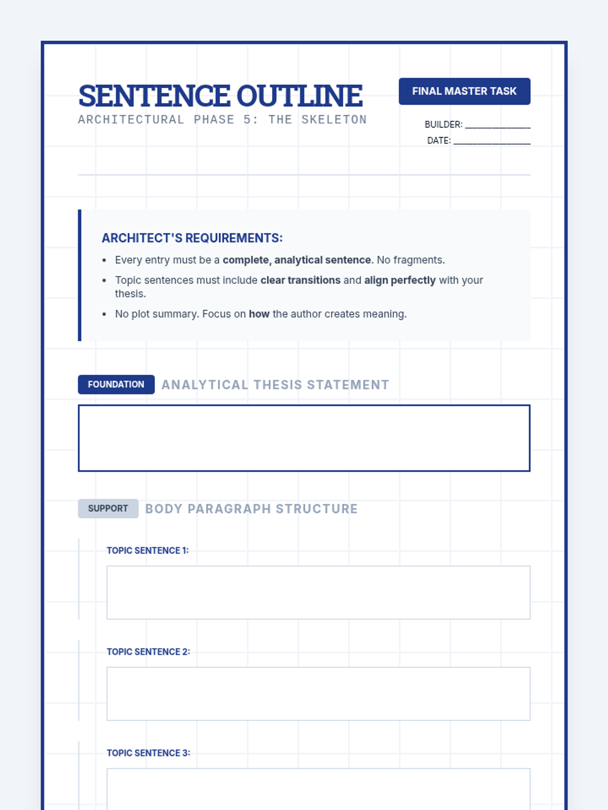 This sequence guides 9th-grade students through the structural engineering of an essay, focusing on crafting debatable thesis statements and aligning them with cohesive topic sentences. Students move from identifying arguable claims to constructing a full sentence outline that demonstrates logical flow and argumentative integrity.