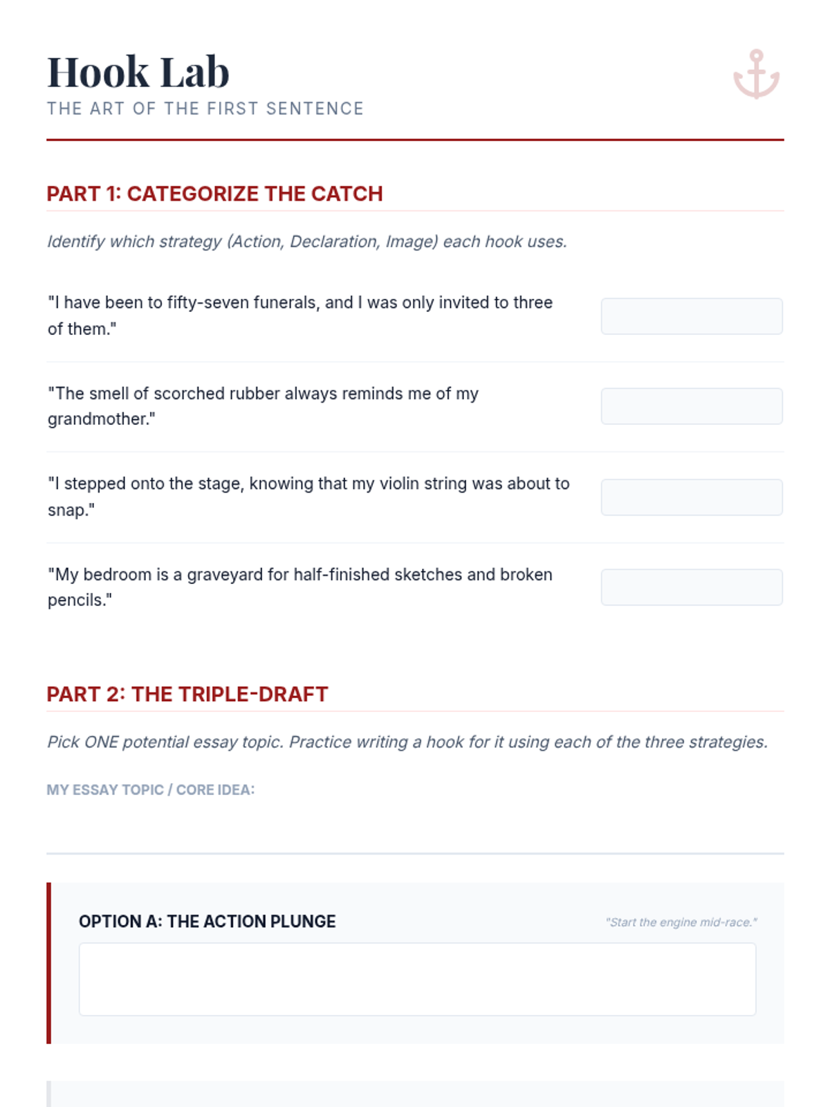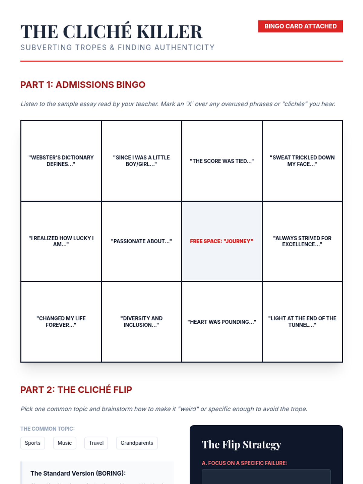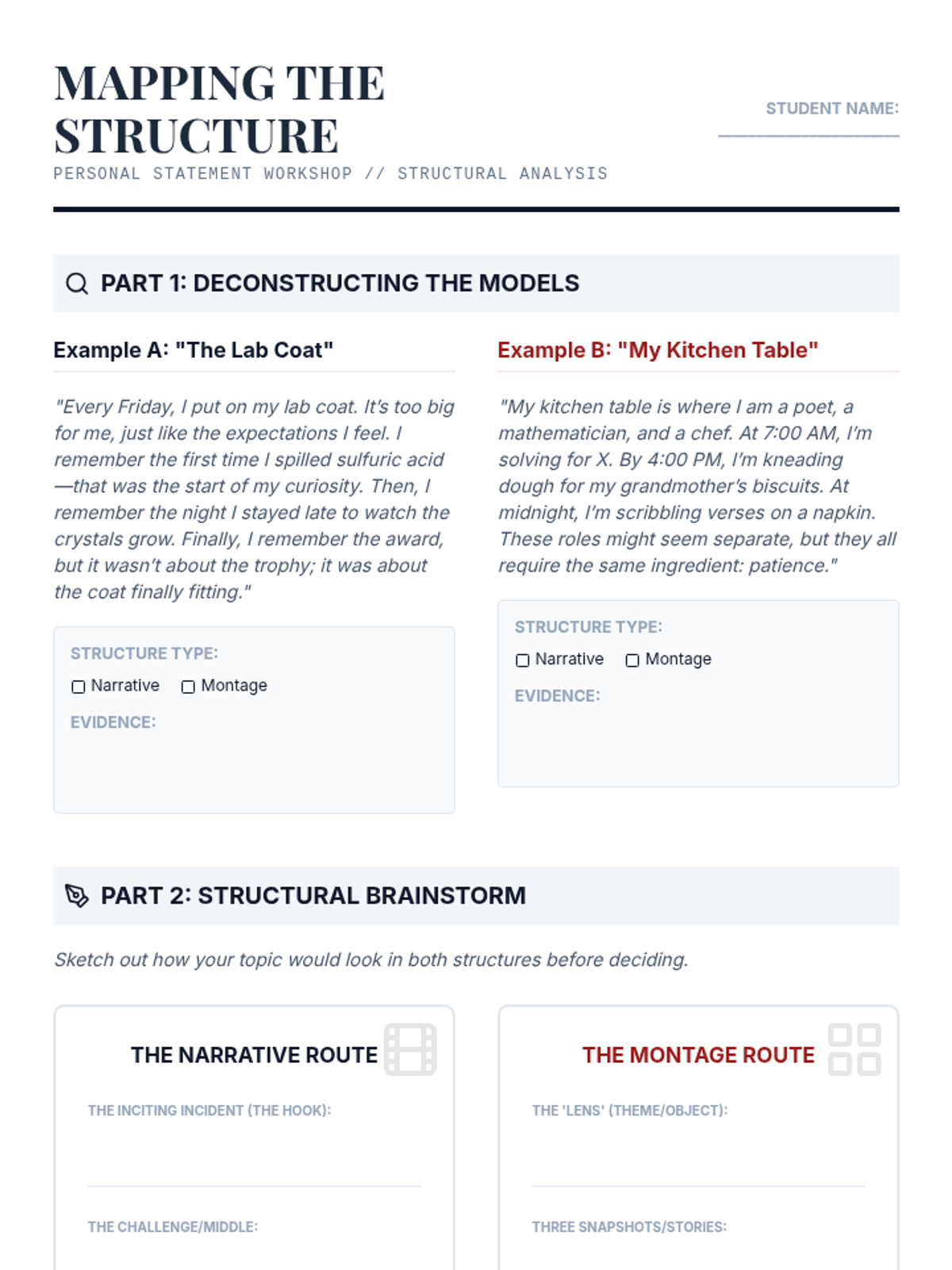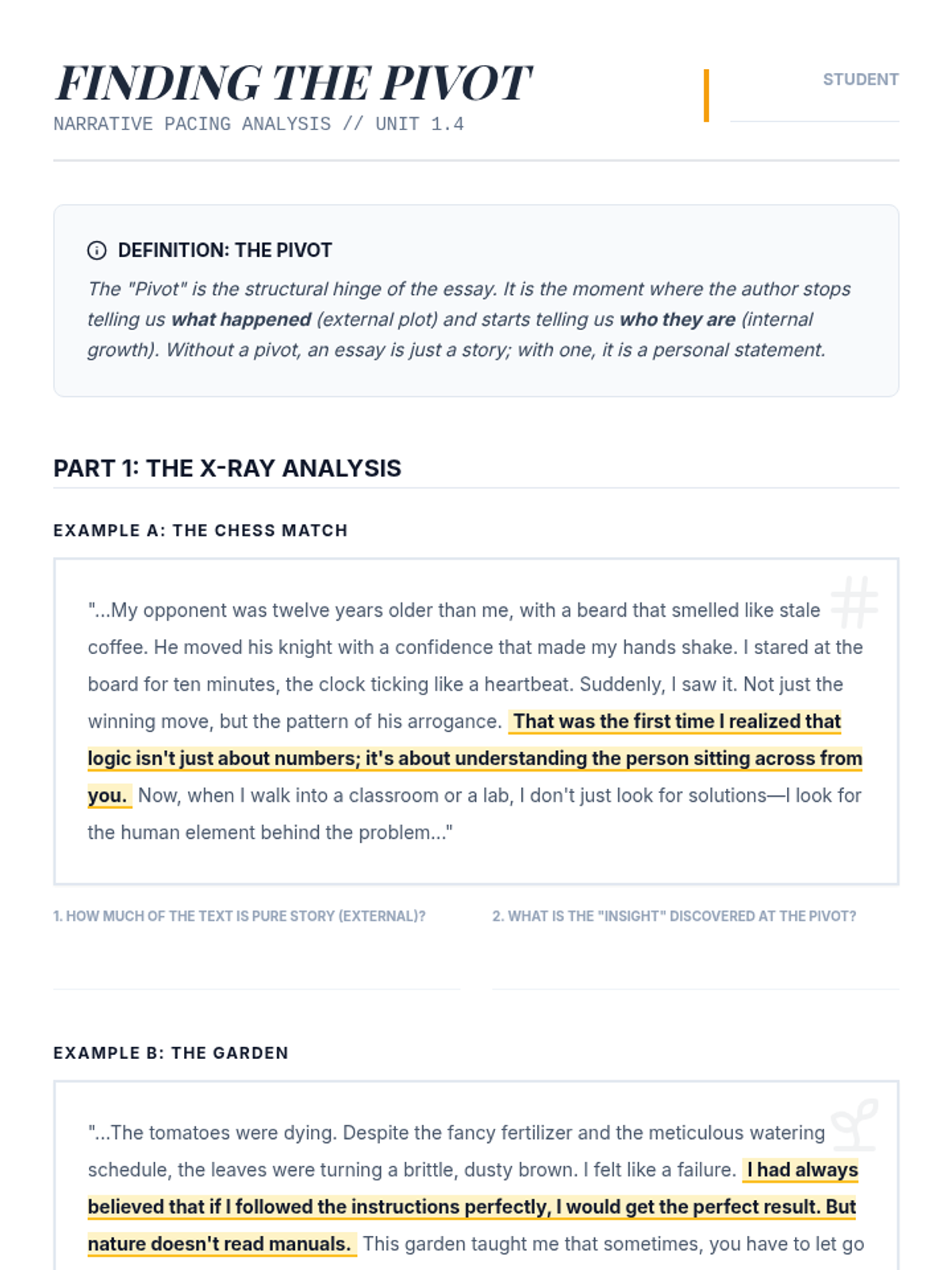 A comprehensive sequence designed to help 11th-grade students master the art of the college personal statement by deconstructing successful examples, identifying structural models, and avoiding common pitfalls. Students transition from being 'admissions officers' to becoming strategic narrative writers.