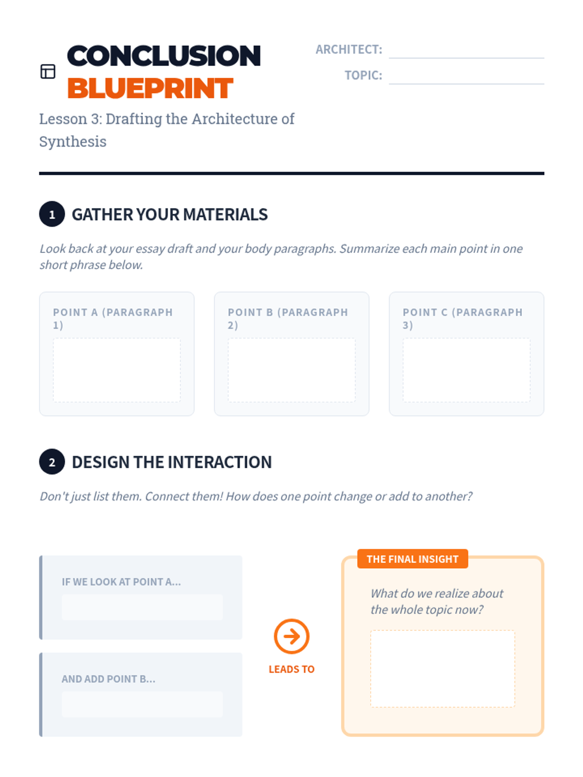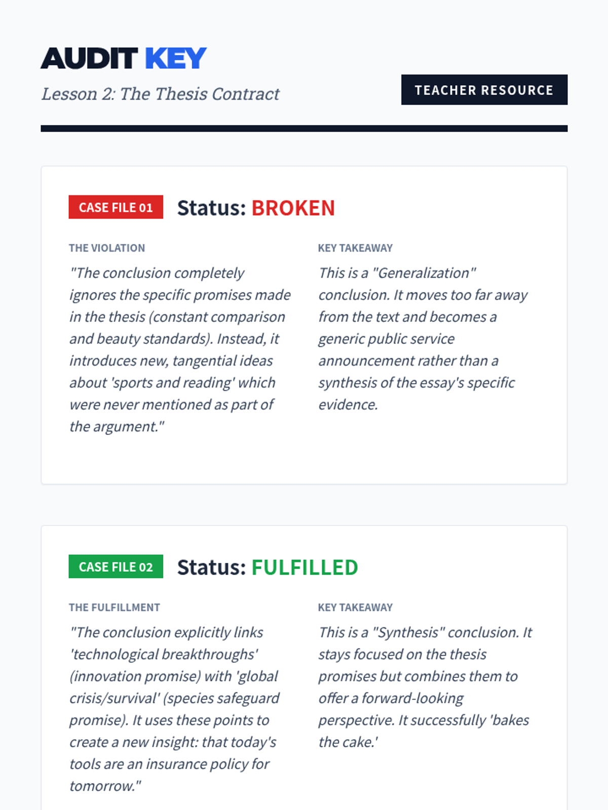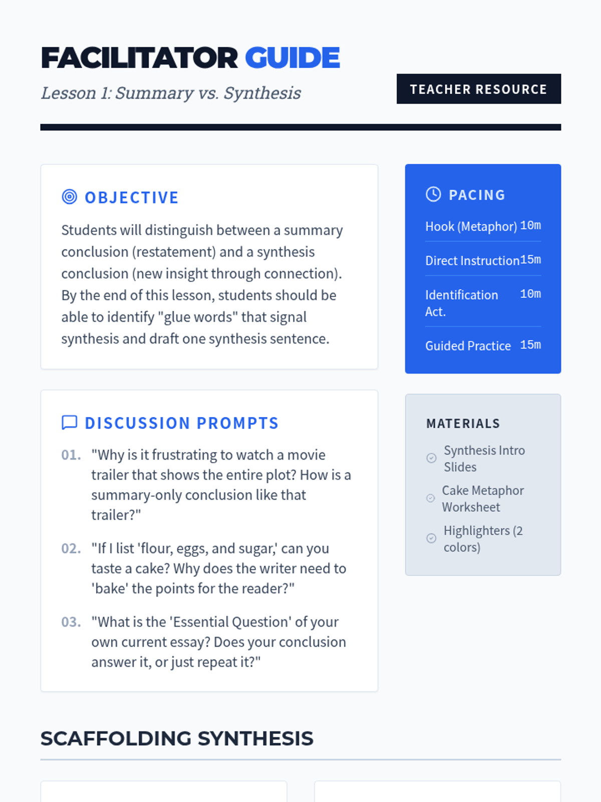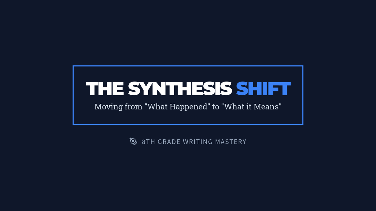 An 8th-grade writing sequence focused on moving students from simple summaries to sophisticated synthesis in their essay conclusions, emphasizing the 'contract' between the introduction and the final insight.