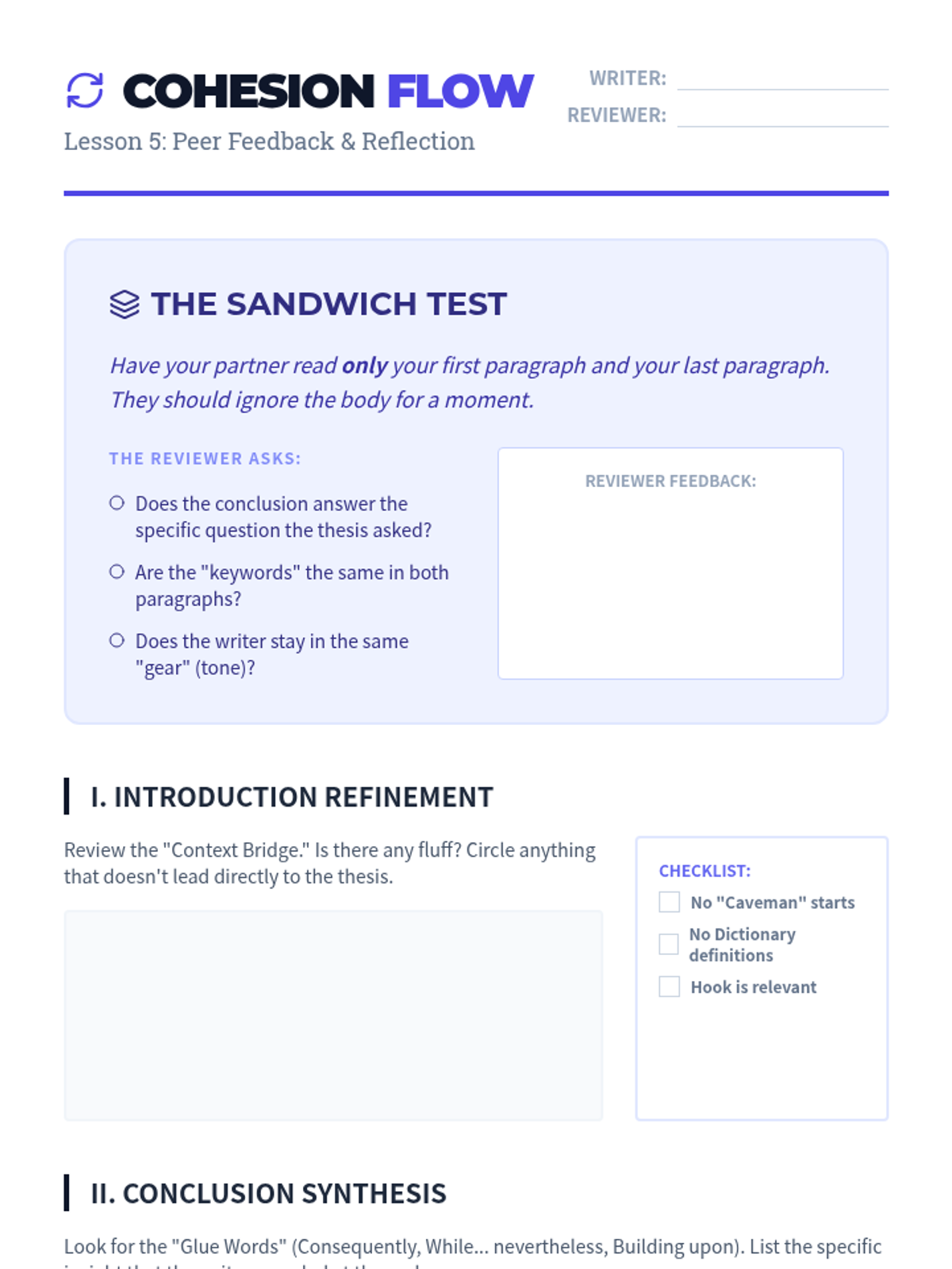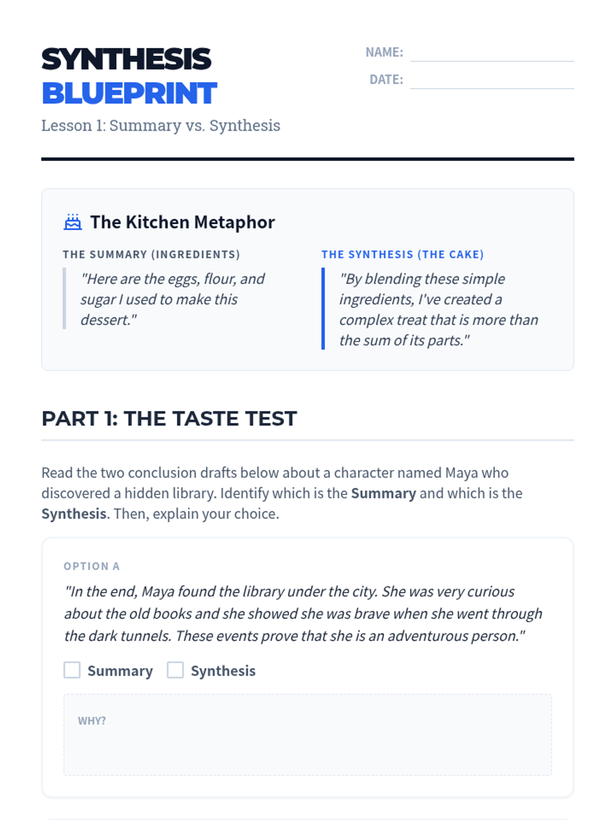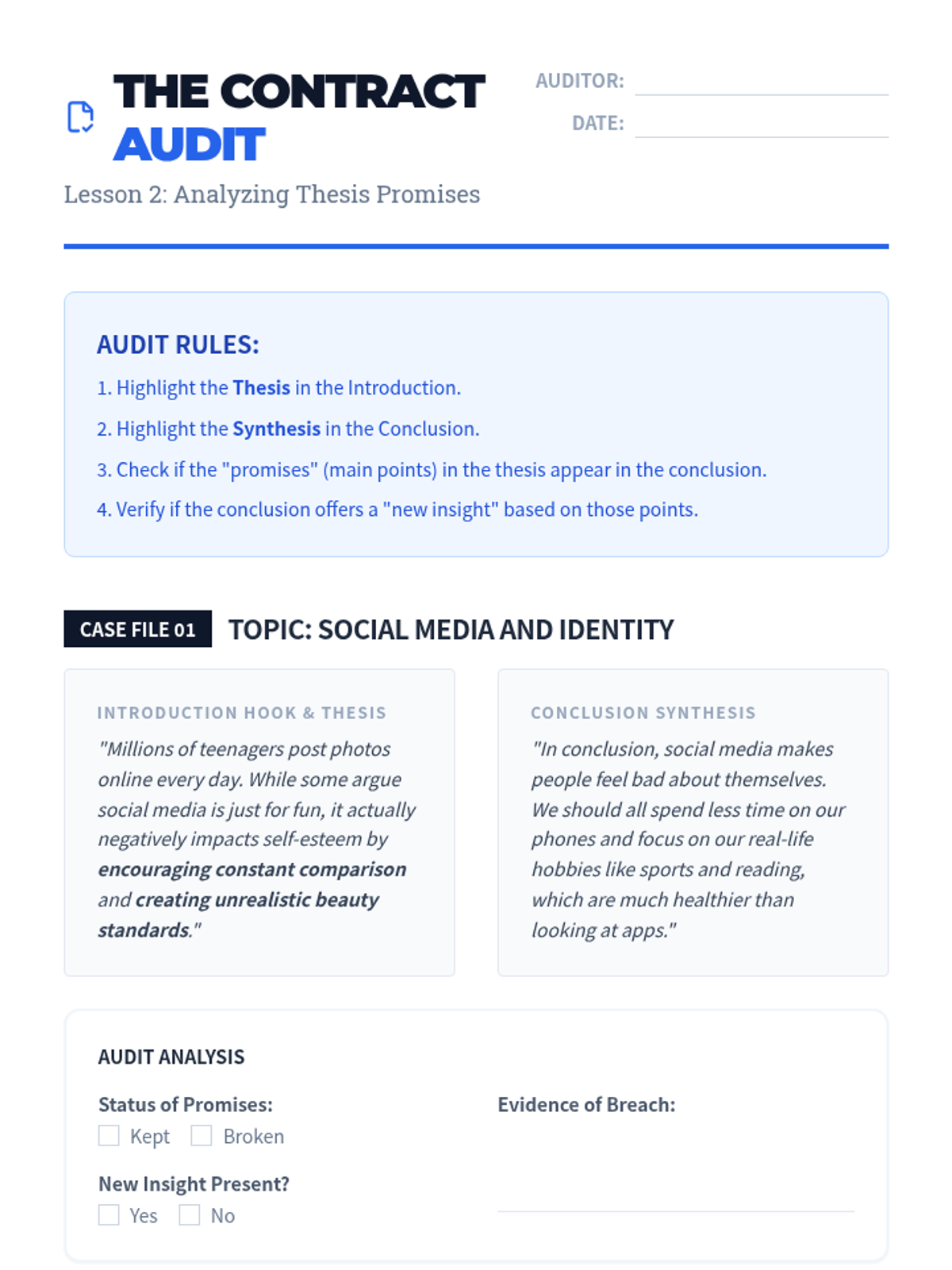 An 8th-grade writing sequence focused on moving students from simple summaries to sophisticated synthesis in their essay conclusions, emphasizing the 'contract' between the introduction and the final insight.