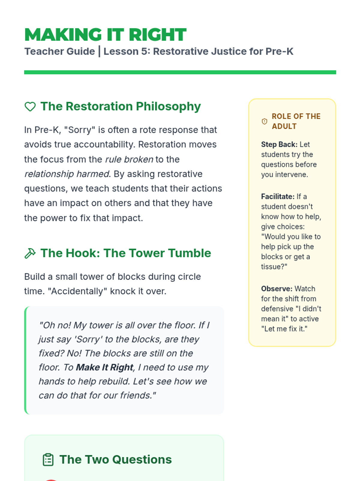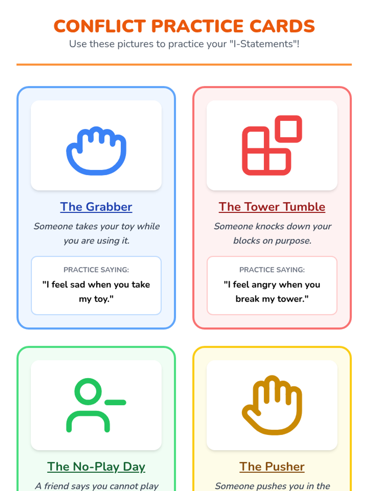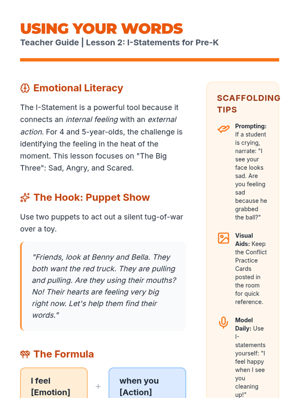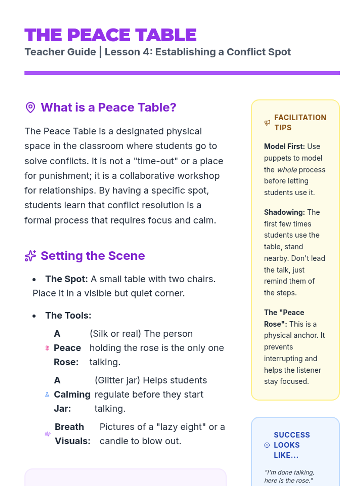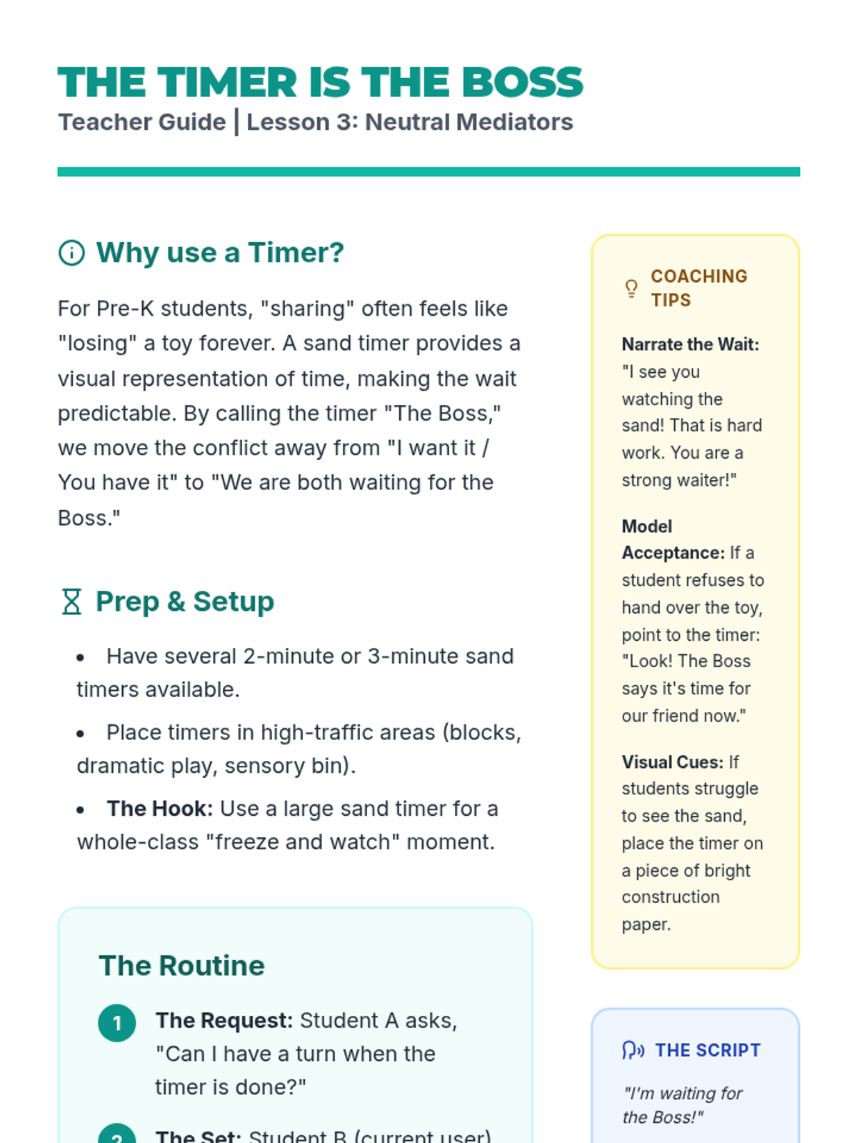 A 5-lesson sequence for Pre-K students focused on establishing basic conflict resolution strategies. Students learn to use words, signs, and tools like timers to navigate peer disputes independently and foster a sense of belonging.