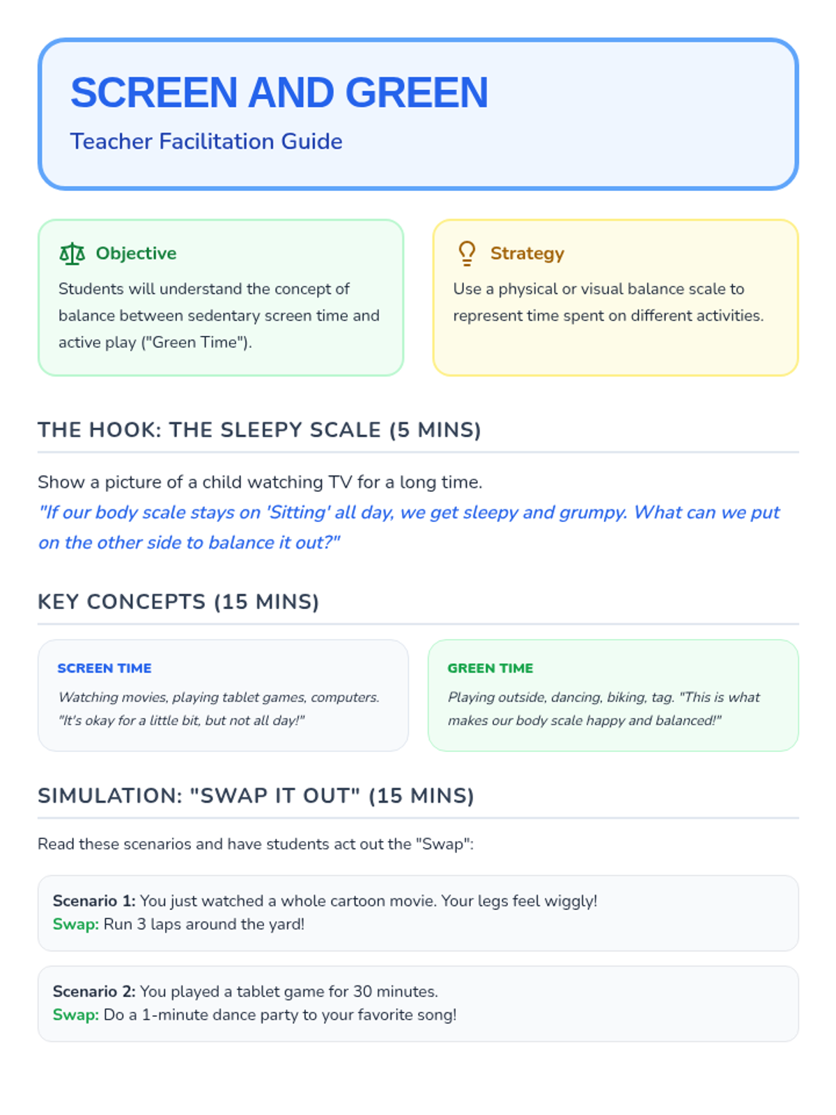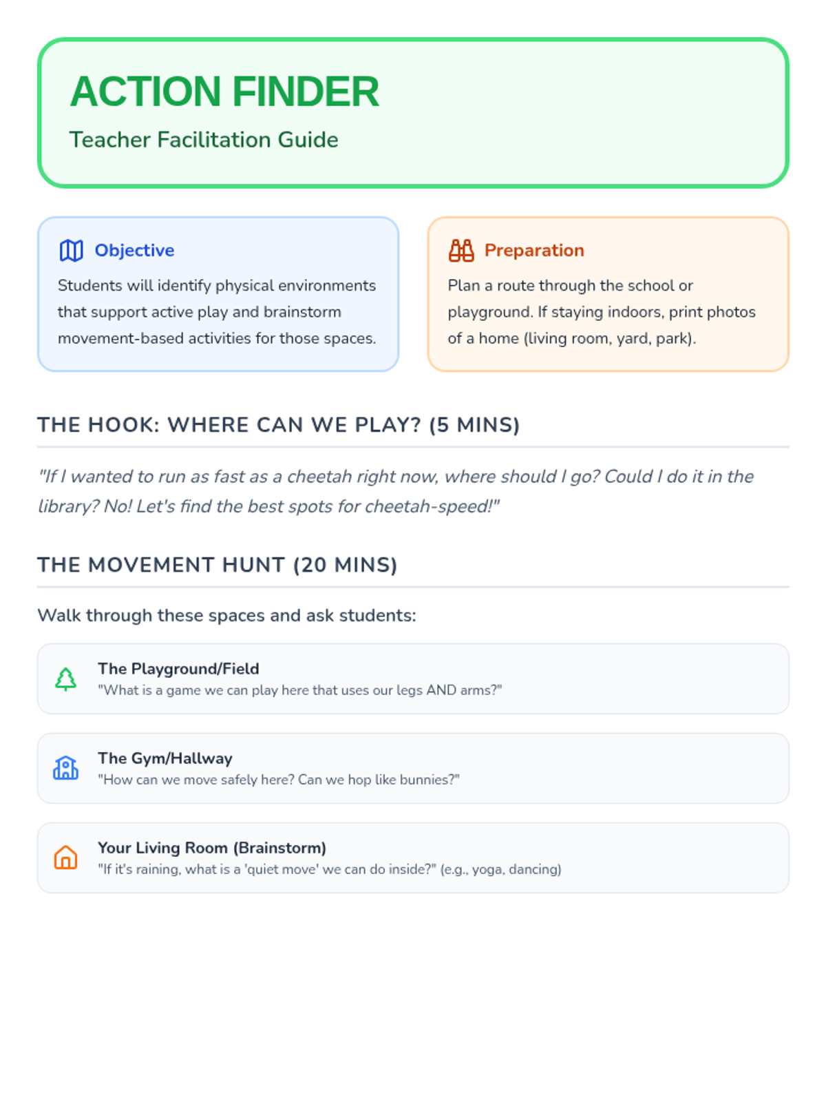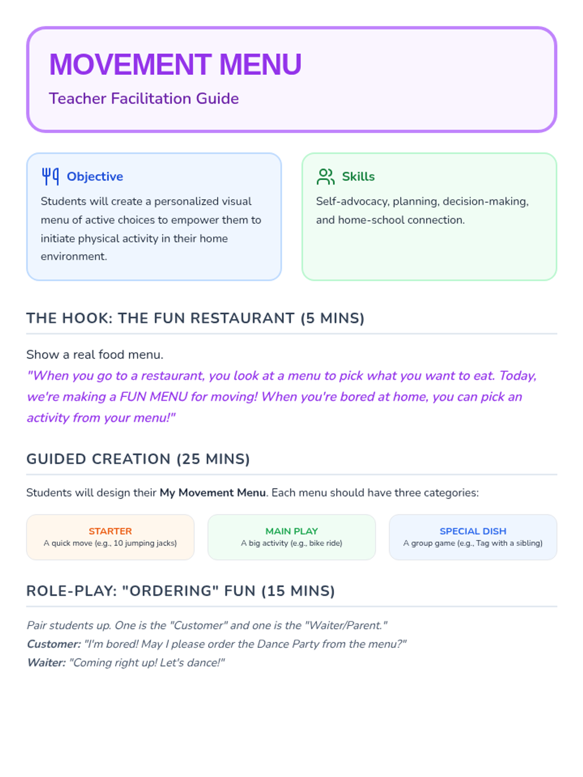 A comprehensive sequence for Kindergarteners to distinguish between sedentary and active behaviors, explore movement opportunities, and set personal activity goals through a 'Movement Menu' for home use.