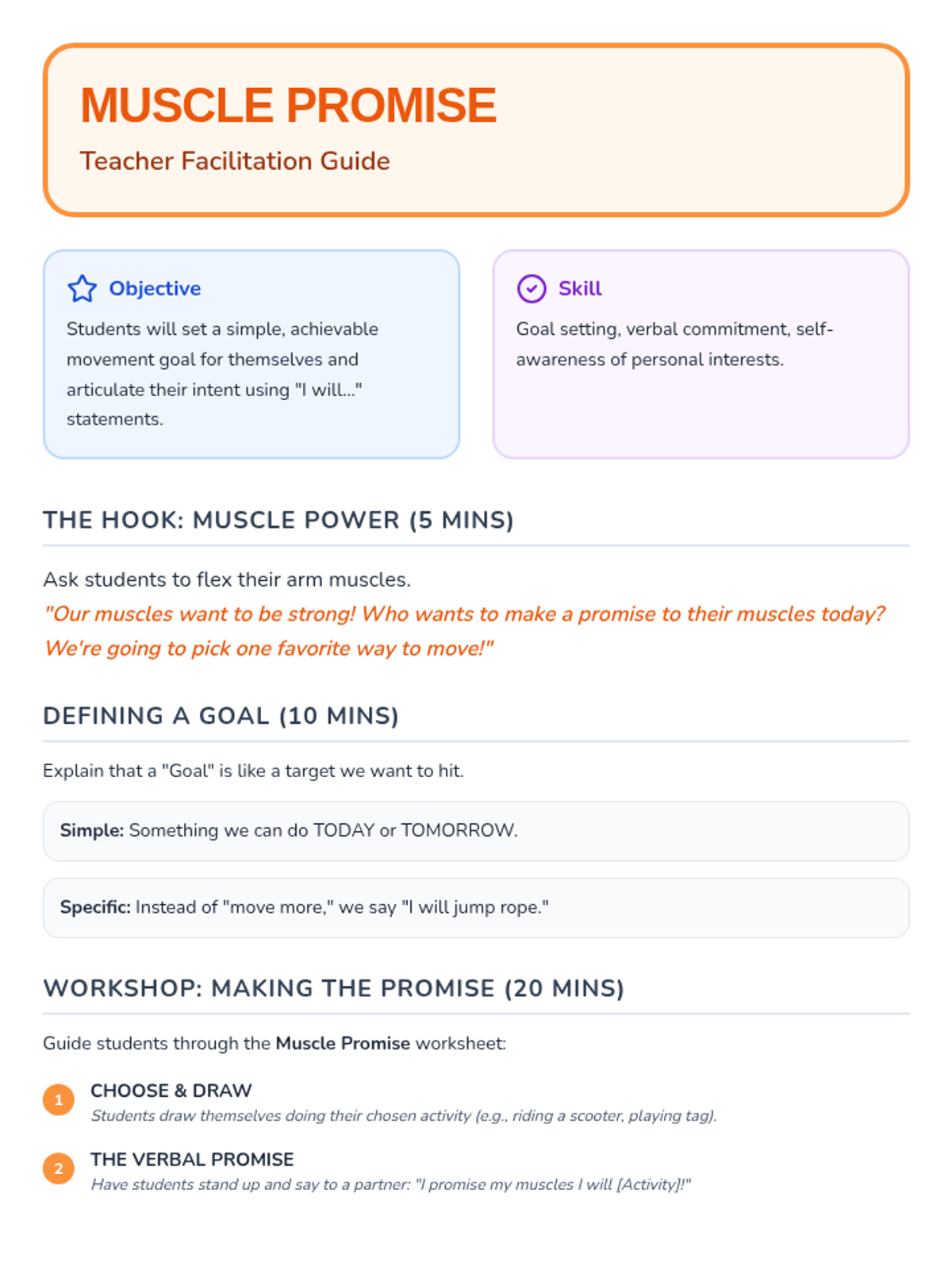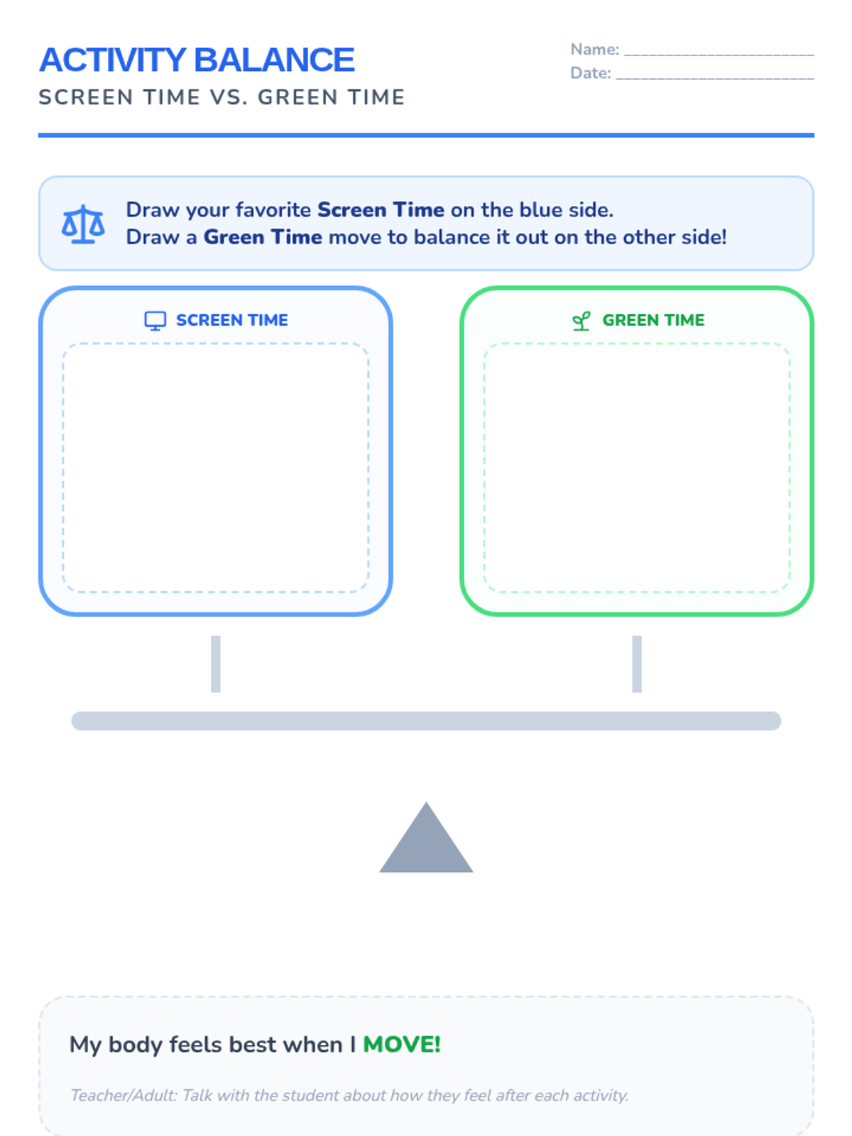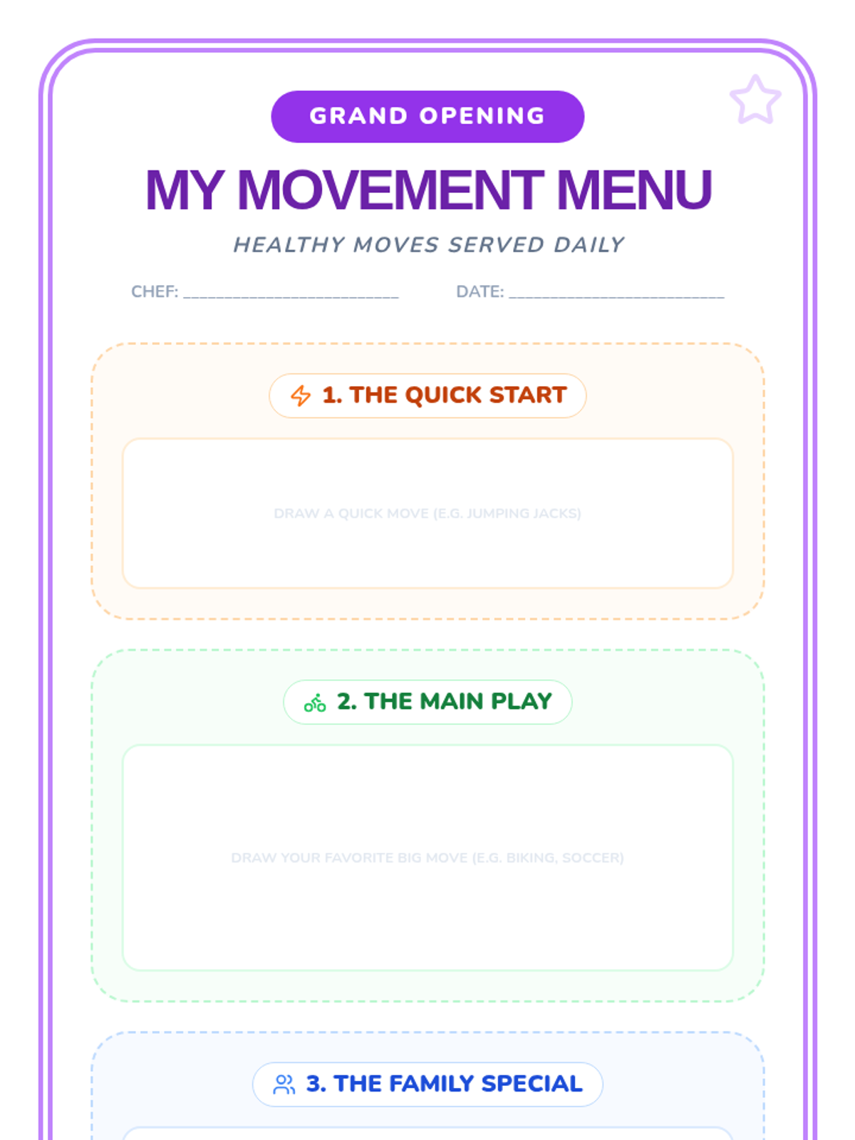 A comprehensive sequence for Kindergarteners to distinguish between sedentary and active behaviors, explore movement opportunities, and set personal activity goals through a 'Movement Menu' for home use.