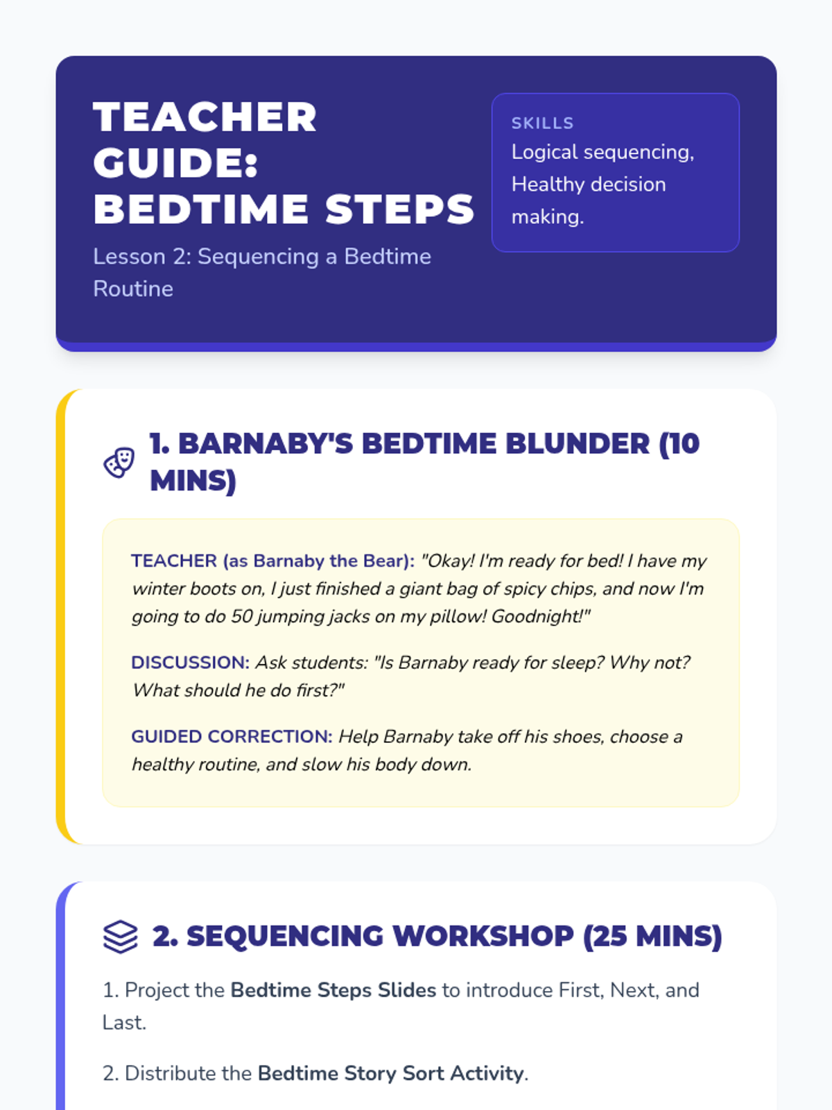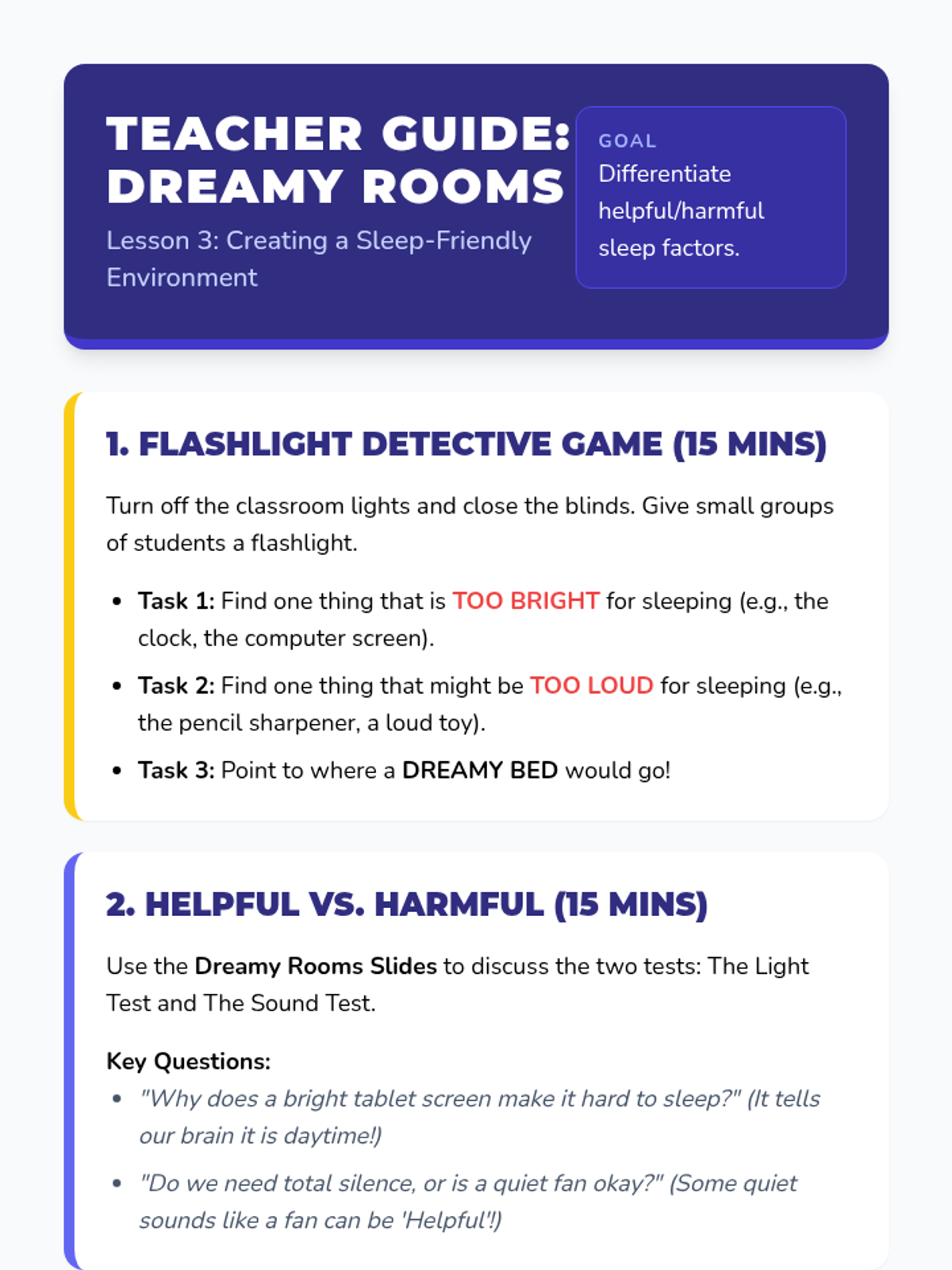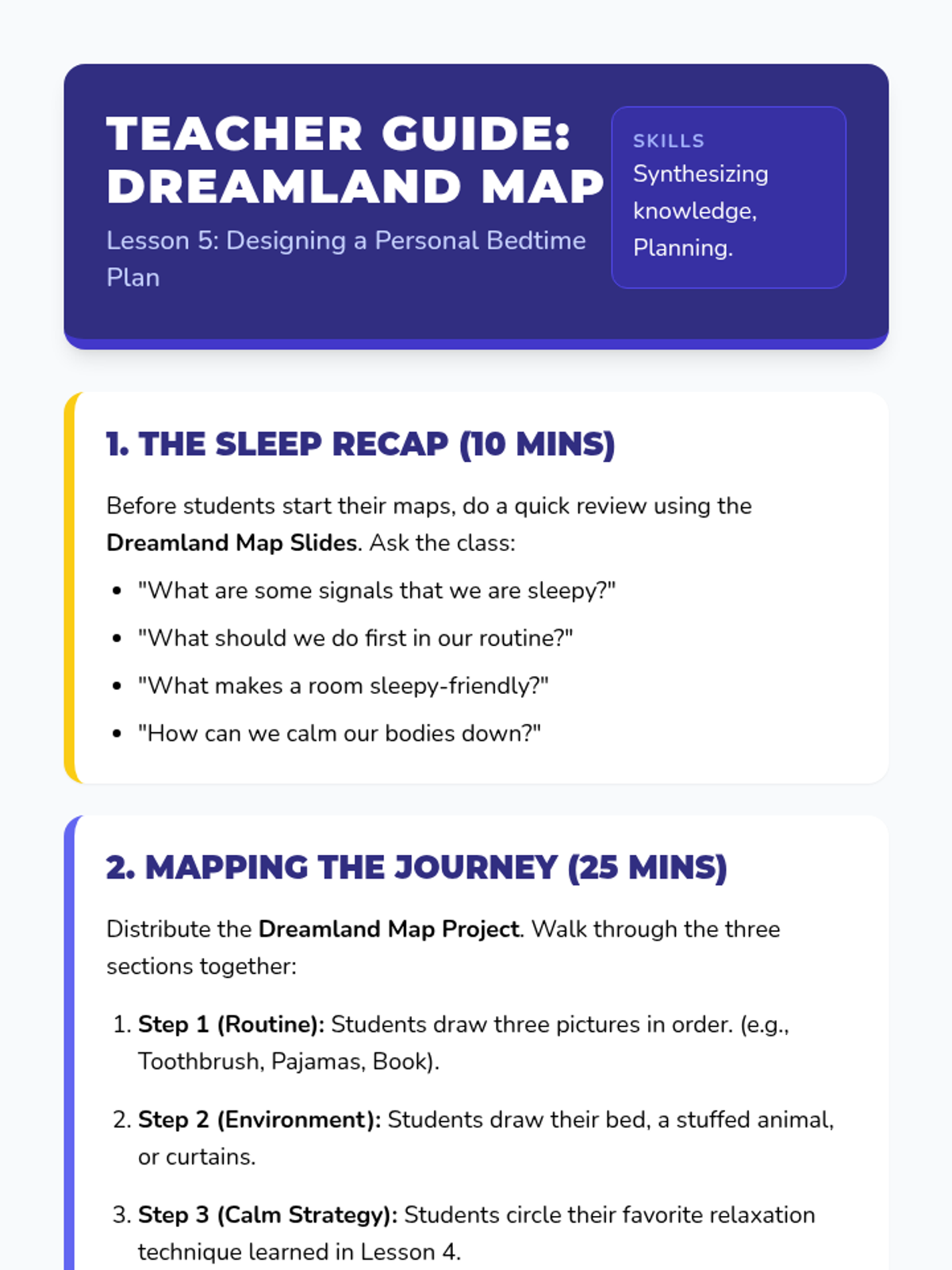 A Kindergarten Health sequence focusing on sleep hygiene. Students learn to recognize tiredness cues, sequence bedtime routines, curate sleep environments, practice calming techniques, and create a personal sleep plan.