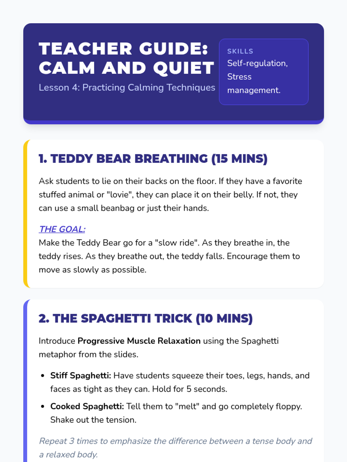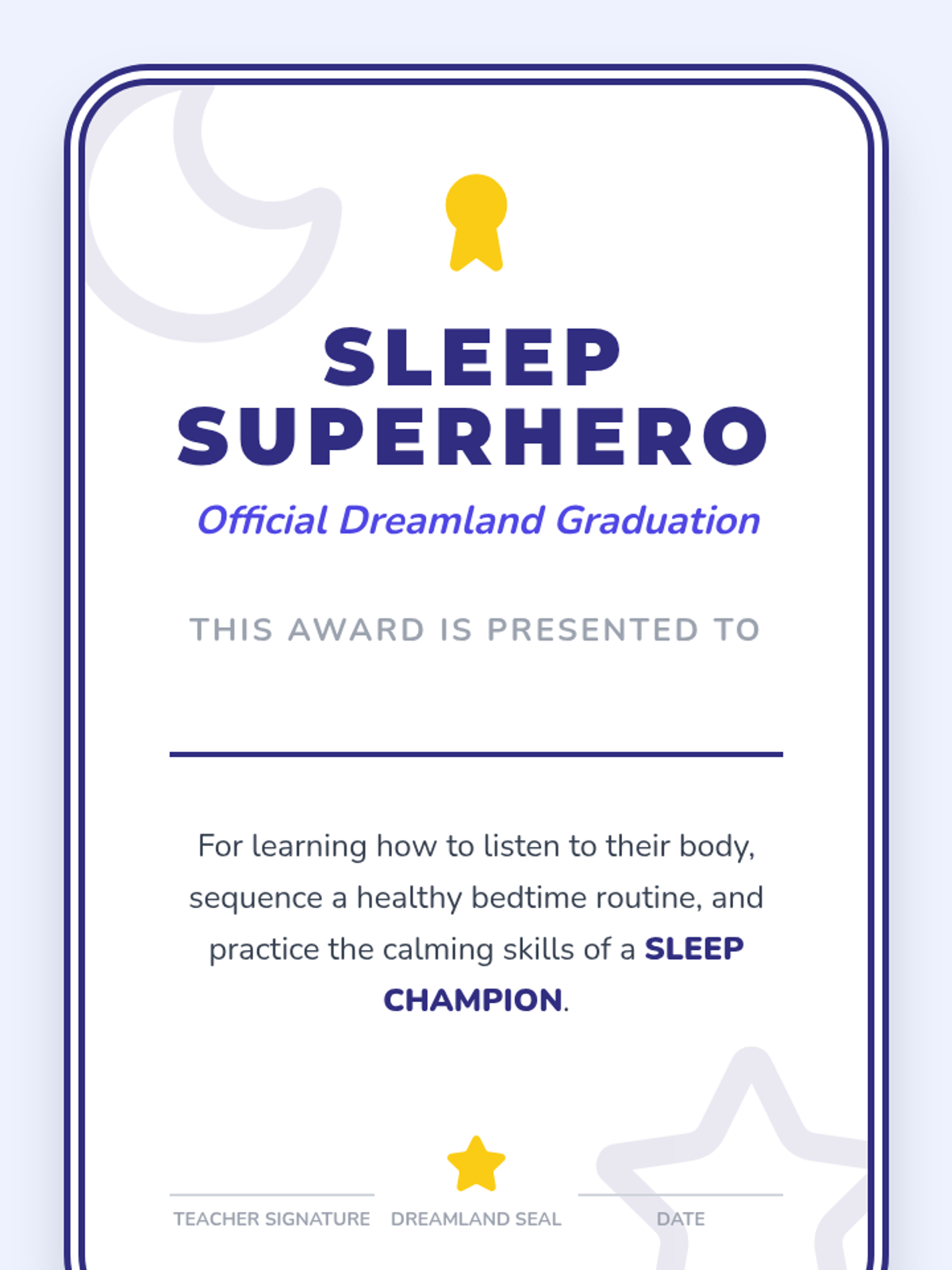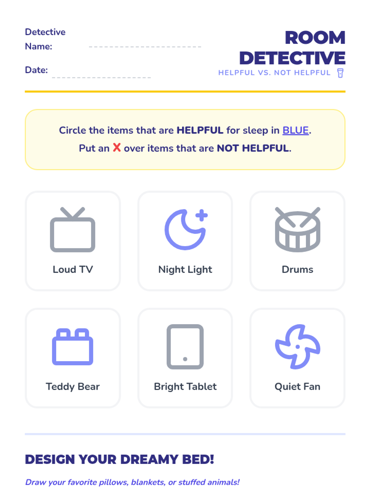 A Kindergarten Health sequence focusing on sleep hygiene. Students learn to recognize tiredness cues, sequence bedtime routines, curate sleep environments, practice calming techniques, and create a personal sleep plan.