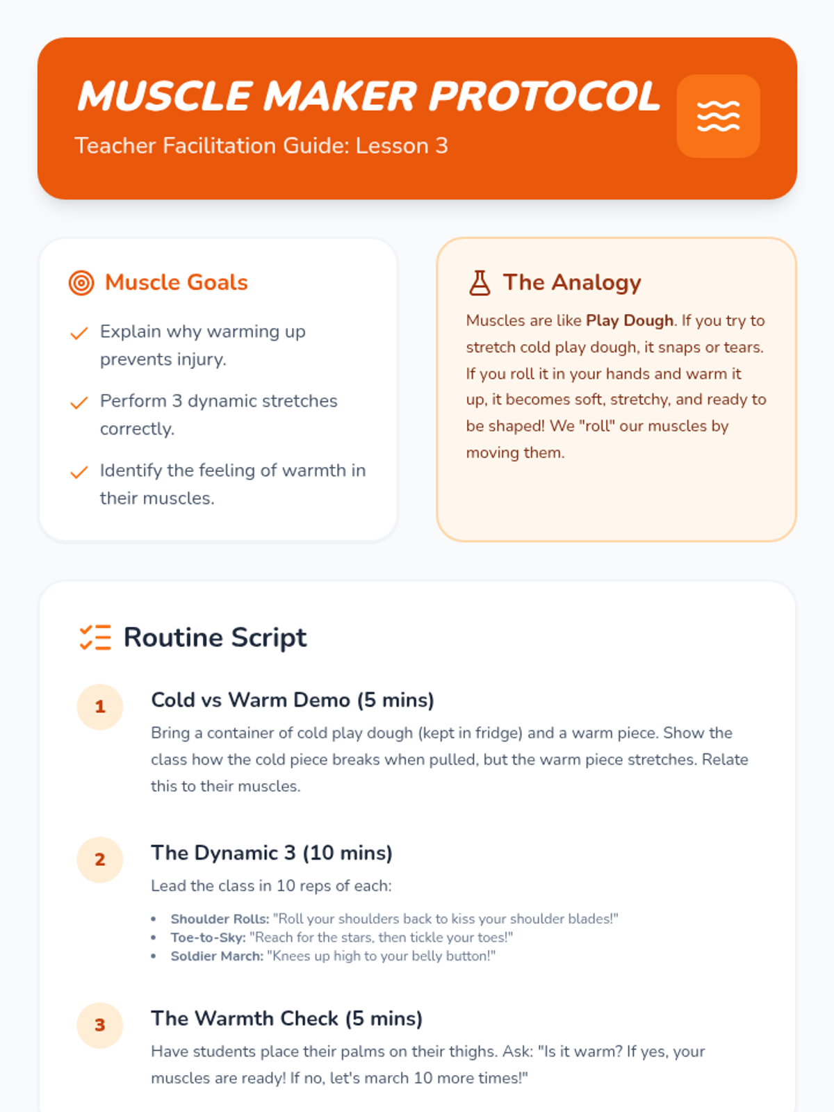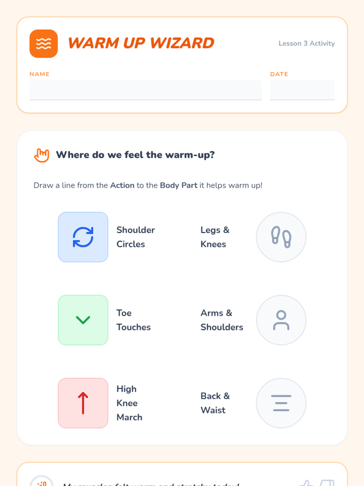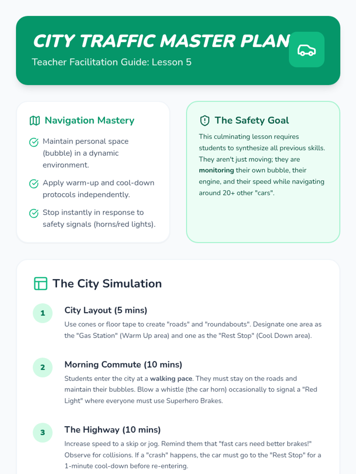 A Kindergarten Physical Education sequence focused on spatial awareness, body control, and injury prevention through the concept of 'safety bubbles' and controlled movement. Students learn to navigate shared spaces safely, warm up their muscles, and recognize their body's signals during play.