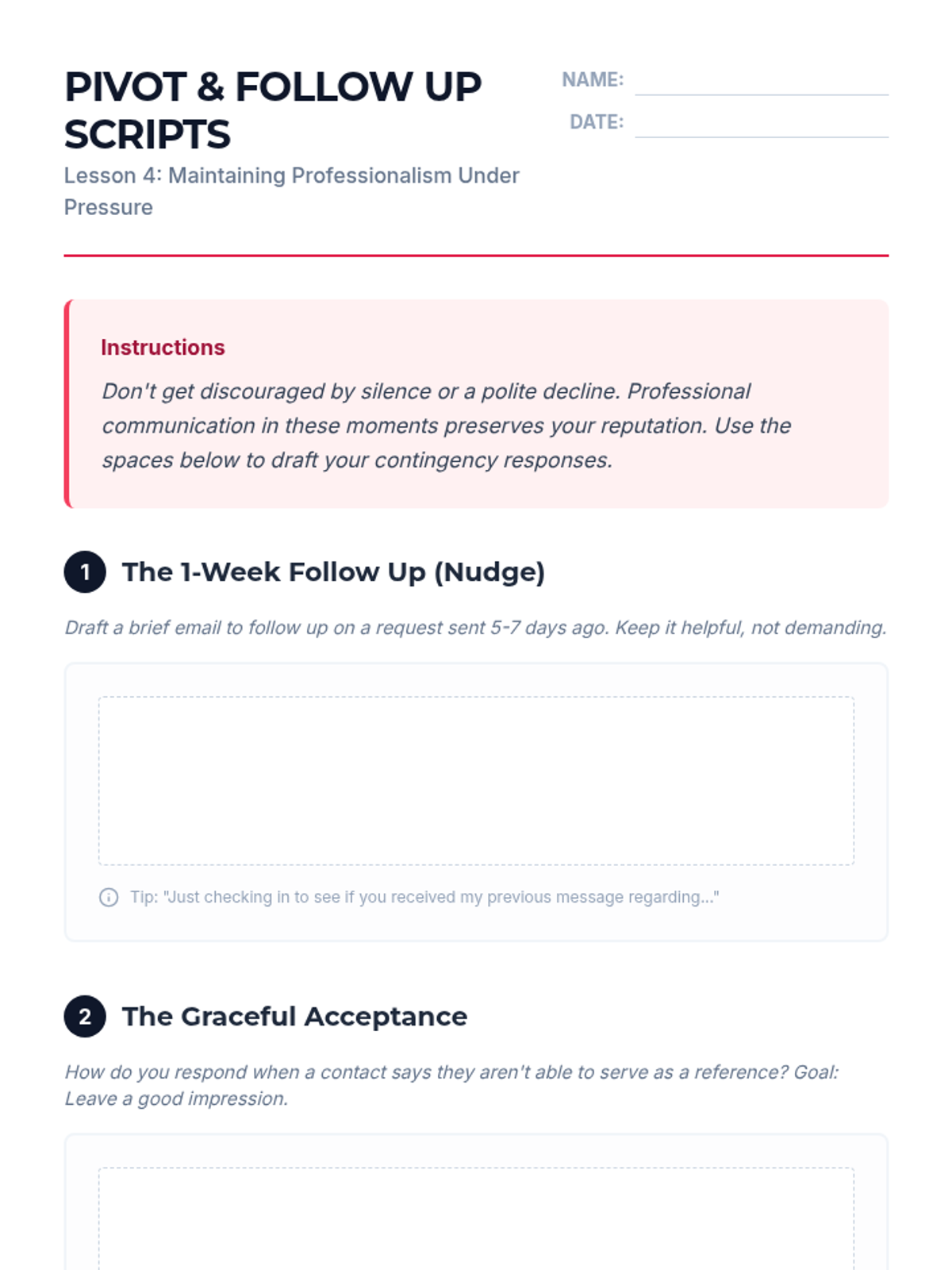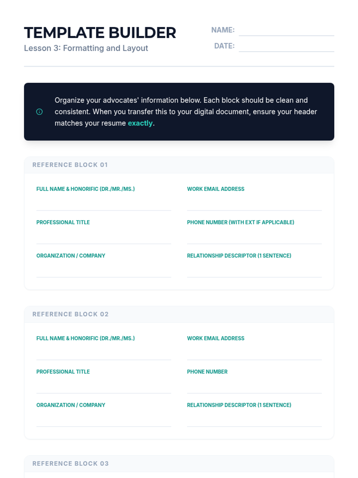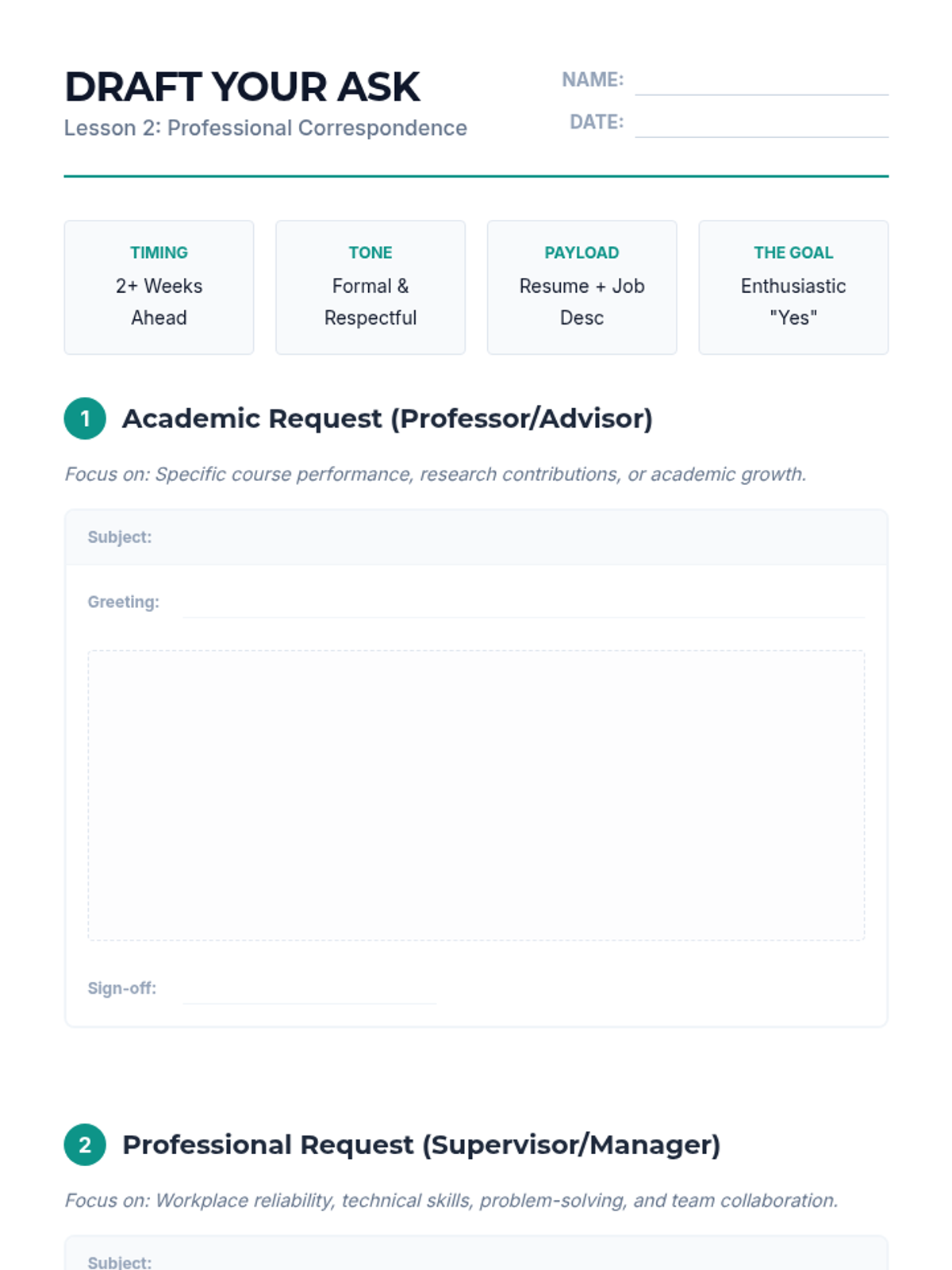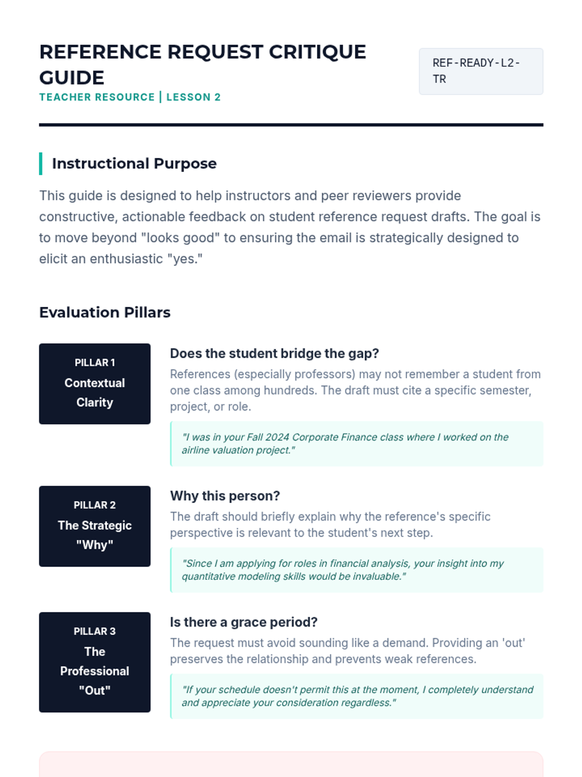 A comprehensive workshop series for undergraduate students to identify, secure, and format professional references for their job search. Students move from auditing their network to finalizing a polished reference document and practicing interview responses.