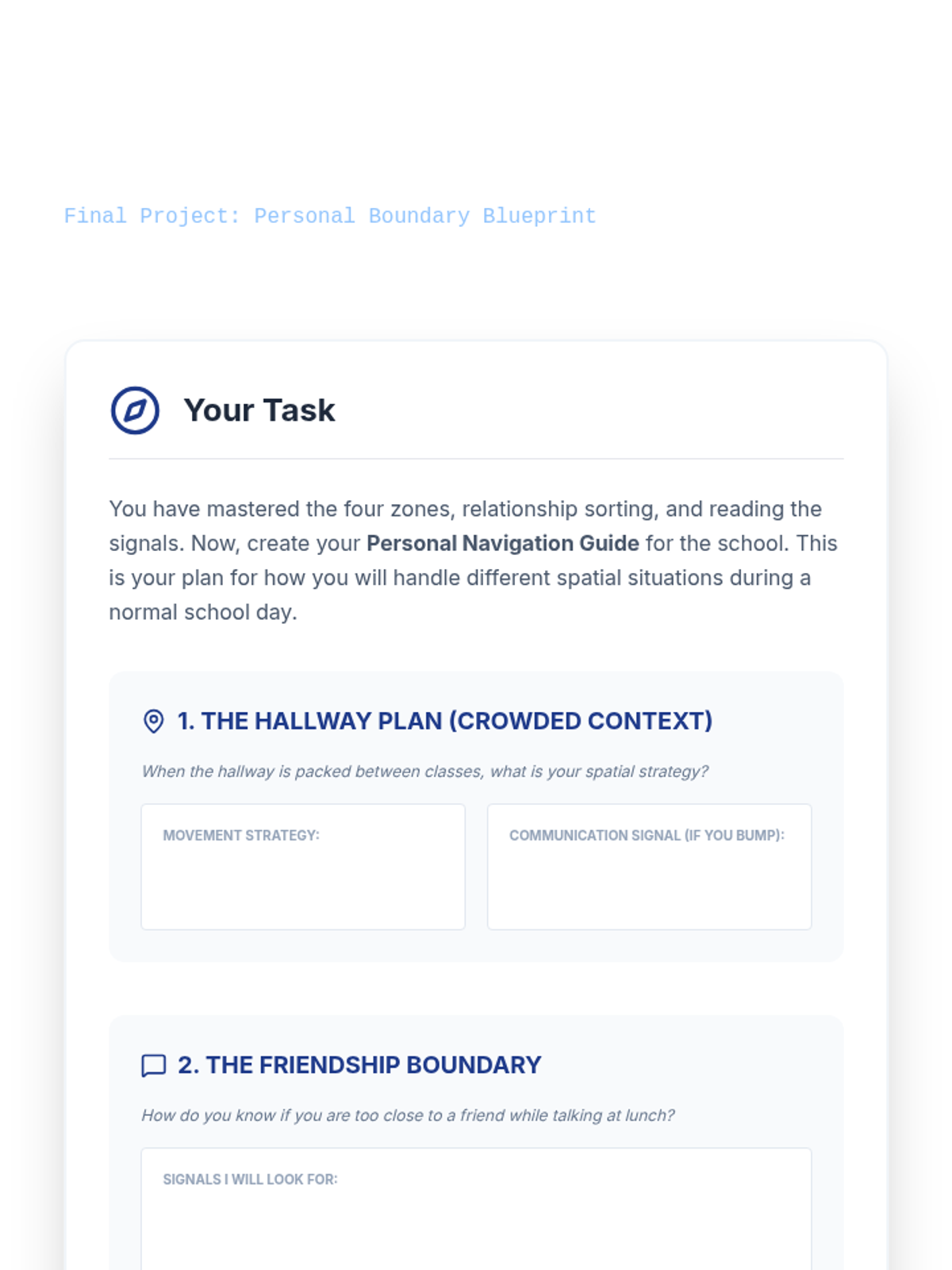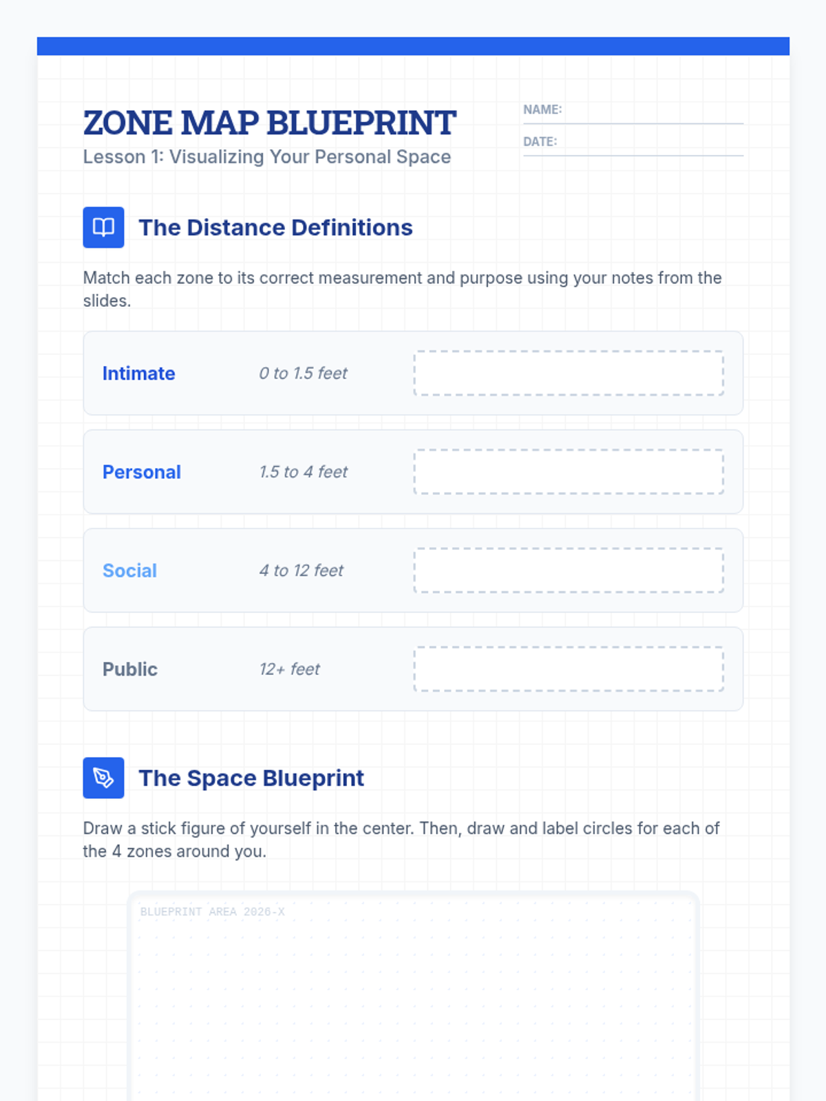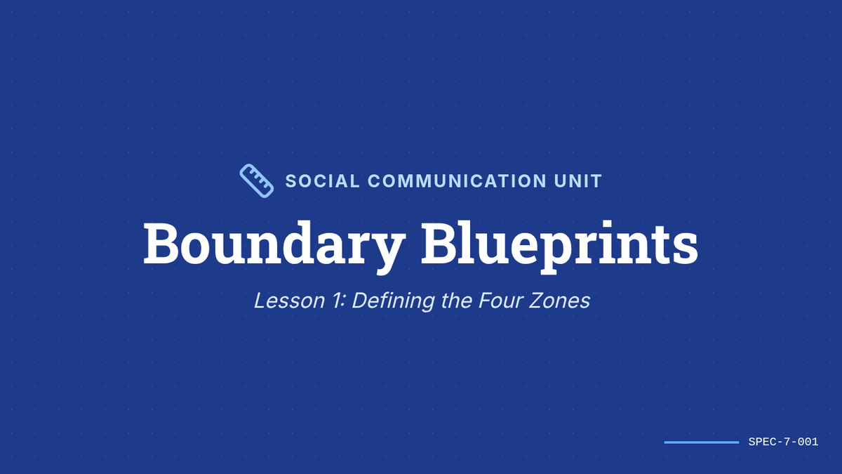 A comprehensive sequence for 7th-grade social communication students focusing on Proxemics (personal space). Students learn to define, categorize, and adjust their spatial boundaries based on relationship depth and environmental context through the 'Boundary Blueprints' framework.