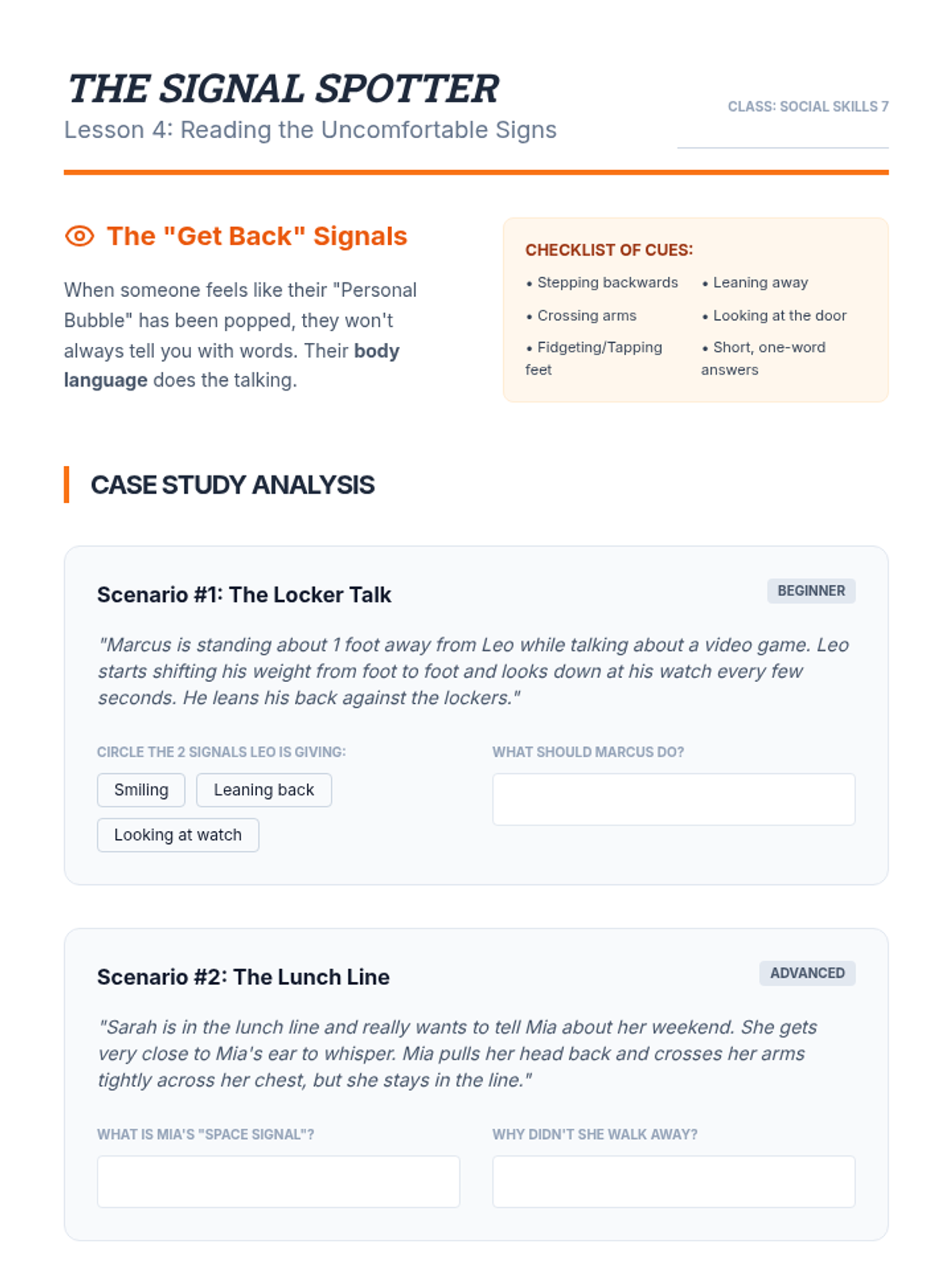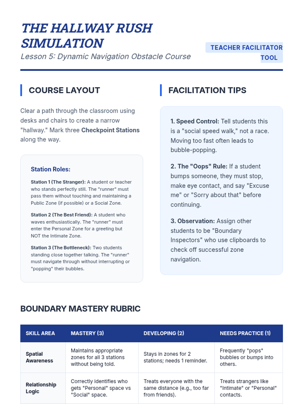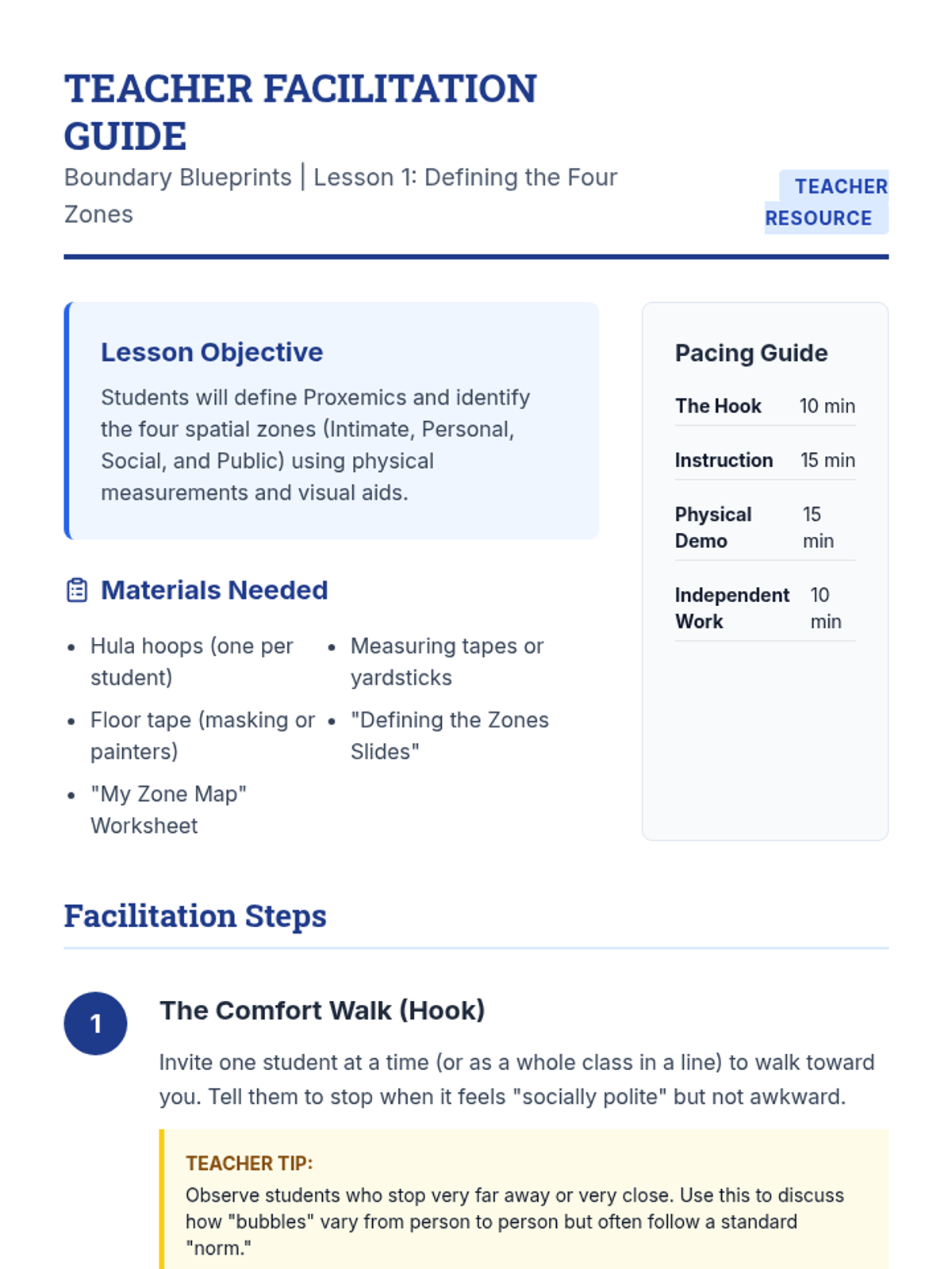 A comprehensive sequence for 7th-grade social communication students focusing on Proxemics (personal space). Students learn to define, categorize, and adjust their spatial boundaries based on relationship depth and environmental context through the 'Boundary Blueprints' framework.