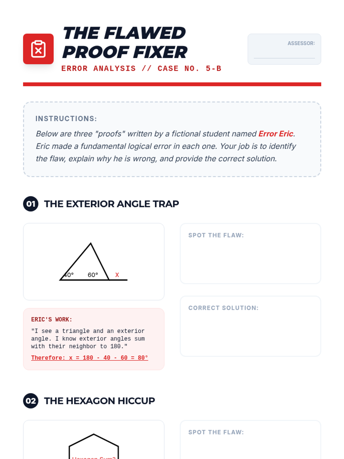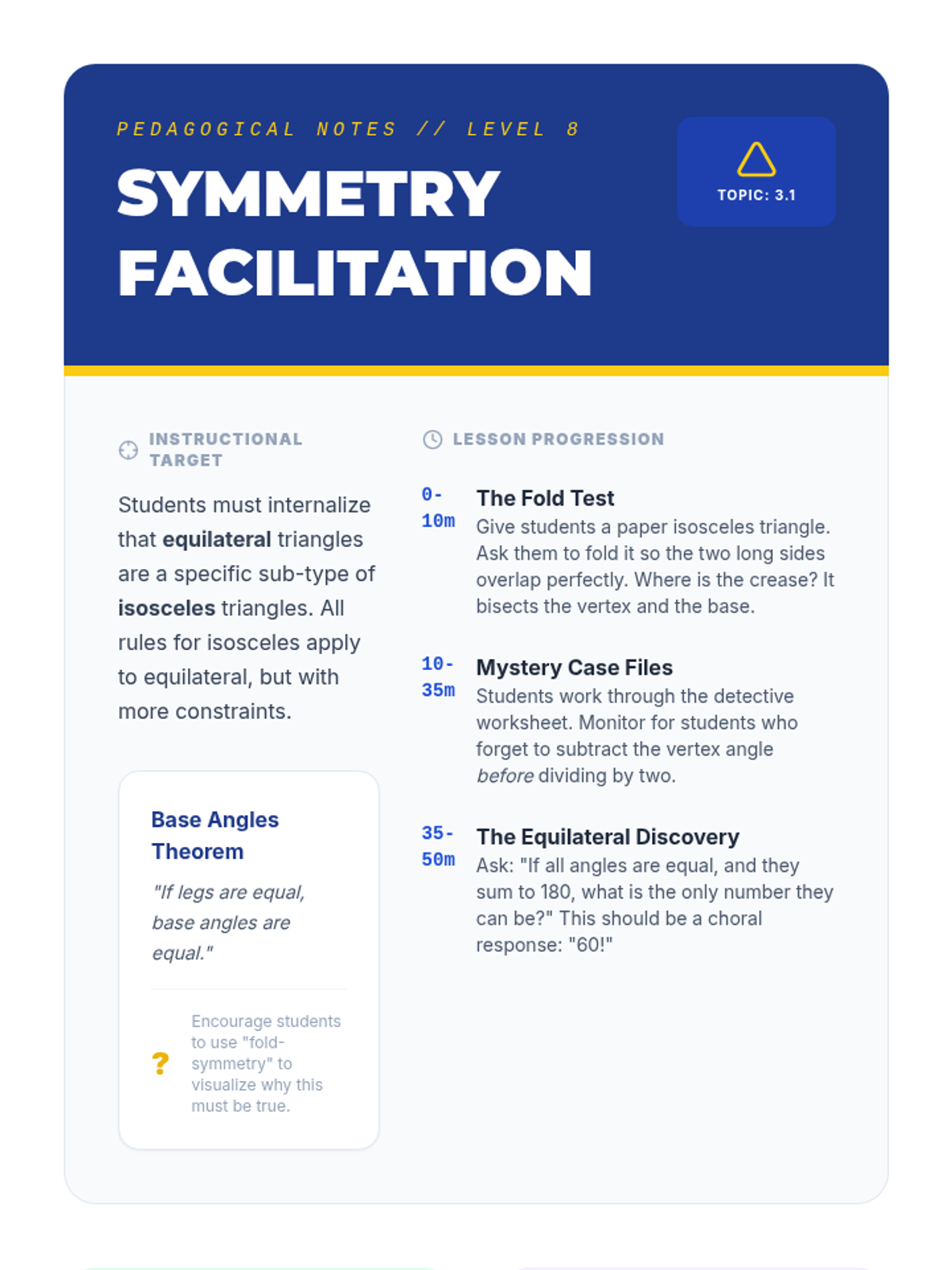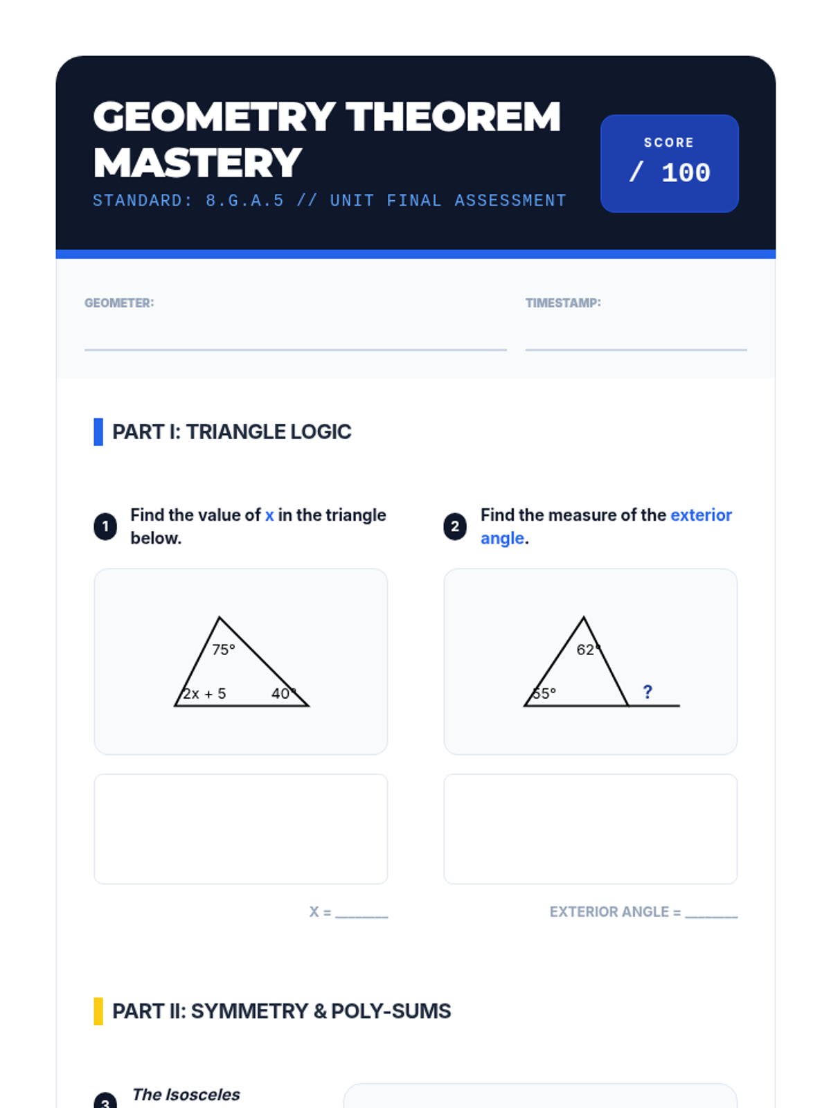 A comprehensive geometry unit for 8th-grade students focused on proving and applying triangle and polygon theorems through inquiry, visualization, and formal logic. Students transition from physical manipulation of shapes to rigorous deductive reasoning, mastering the Triangle Sum Theorem, Exterior Angle Theorem, and polygon interior angle formulas.