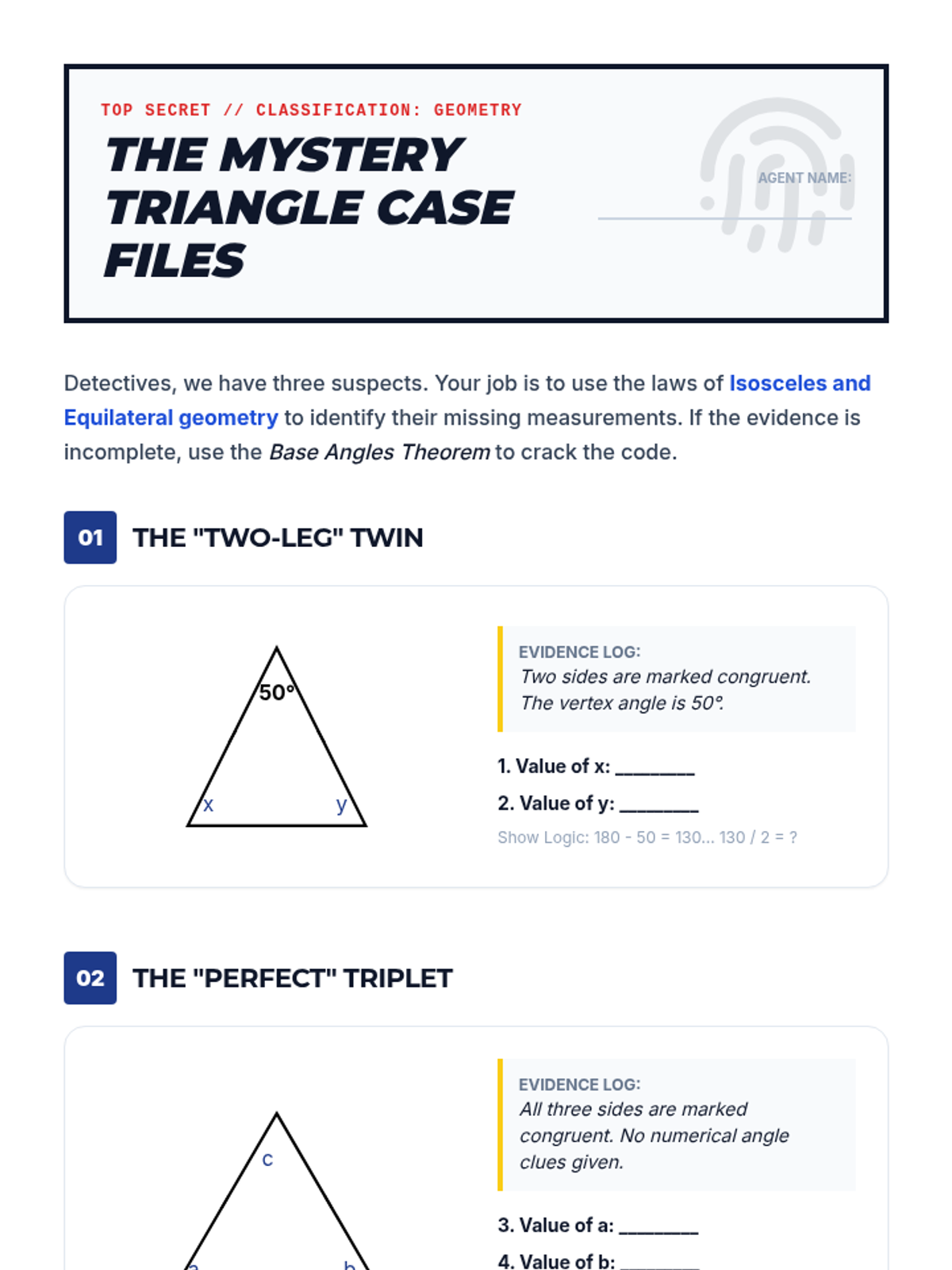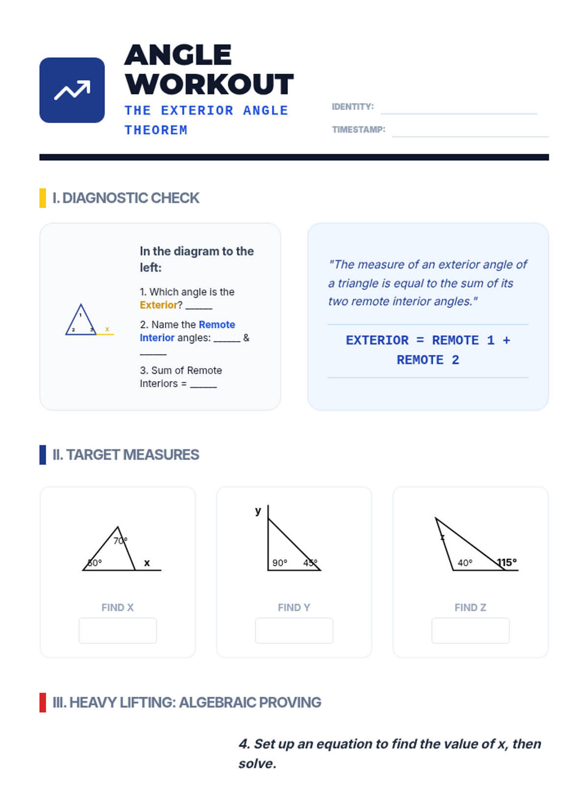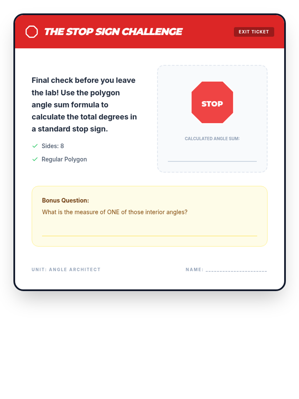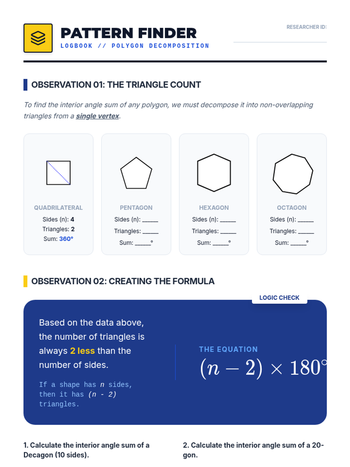 A comprehensive geometry unit for 8th-grade students focused on proving and applying triangle and polygon theorems through inquiry, visualization, and formal logic. Students transition from physical manipulation of shapes to rigorous deductive reasoning, mastering the Triangle Sum Theorem, Exterior Angle Theorem, and polygon interior angle formulas.