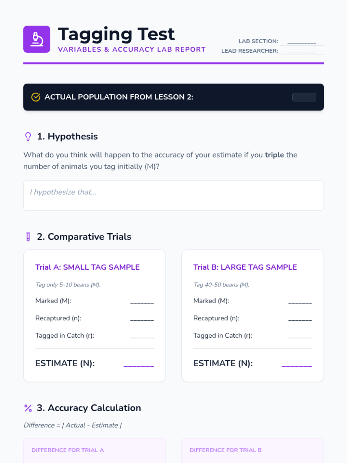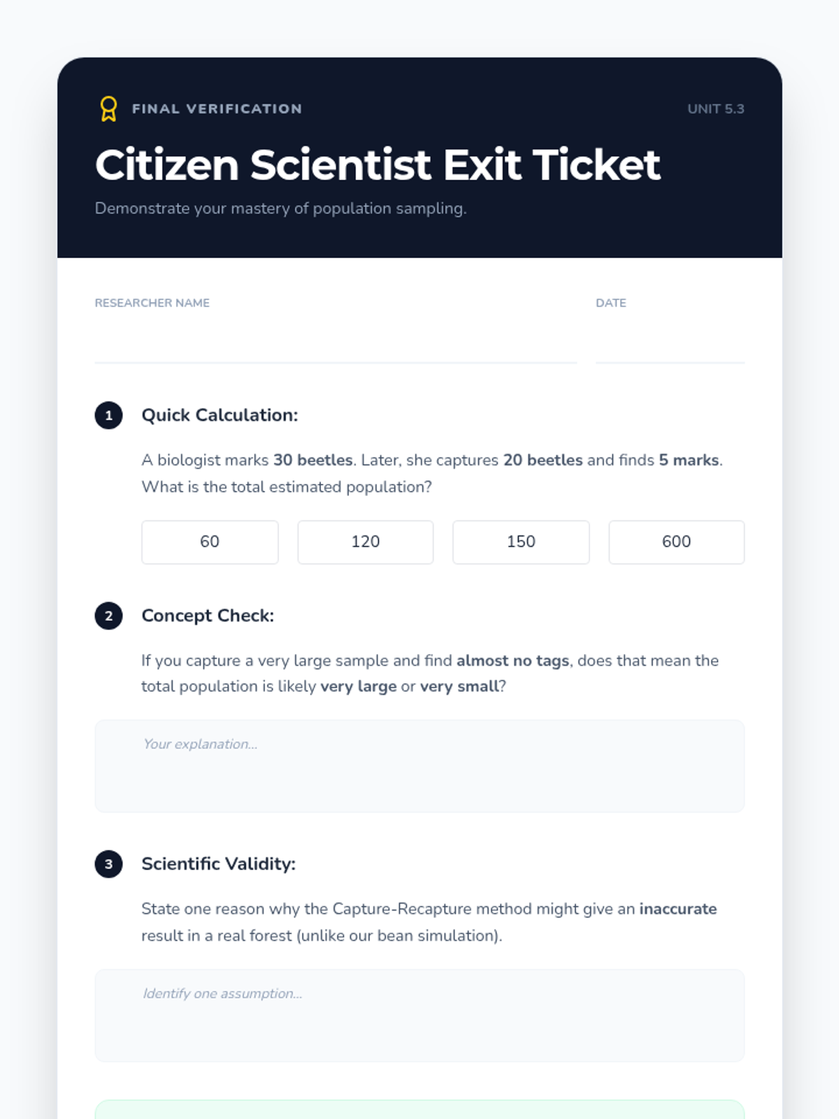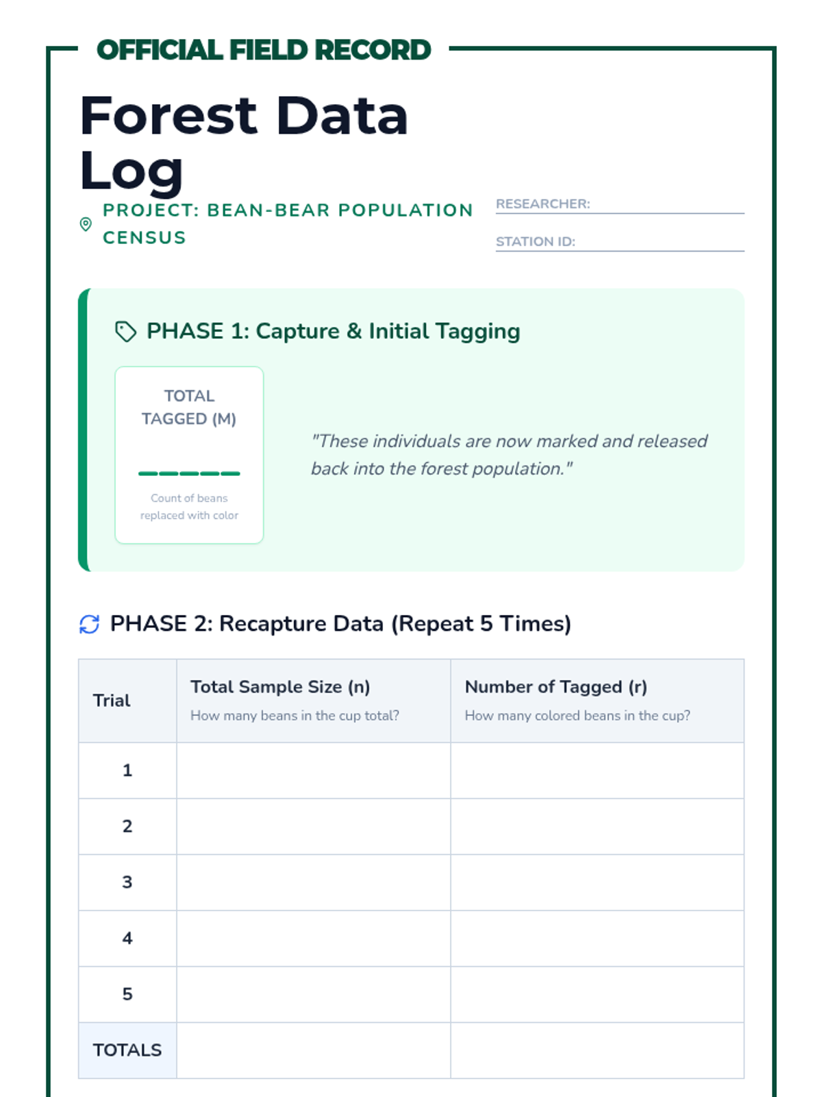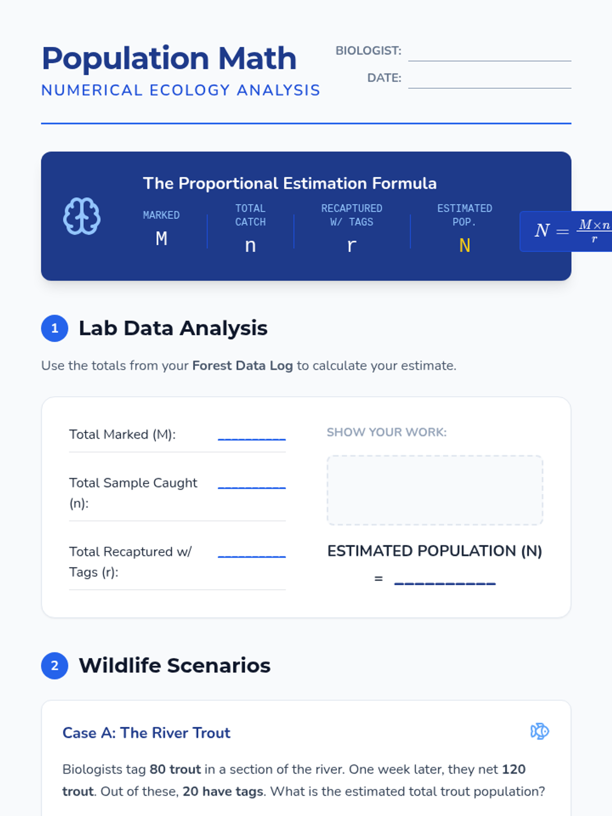 A game-based sequence where students use the Capture-Recapture method to estimate population sizes, progressing from physical simulations to proportional reasoning and real-world ecological analysis.