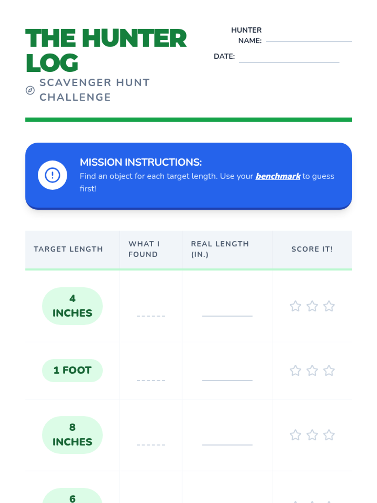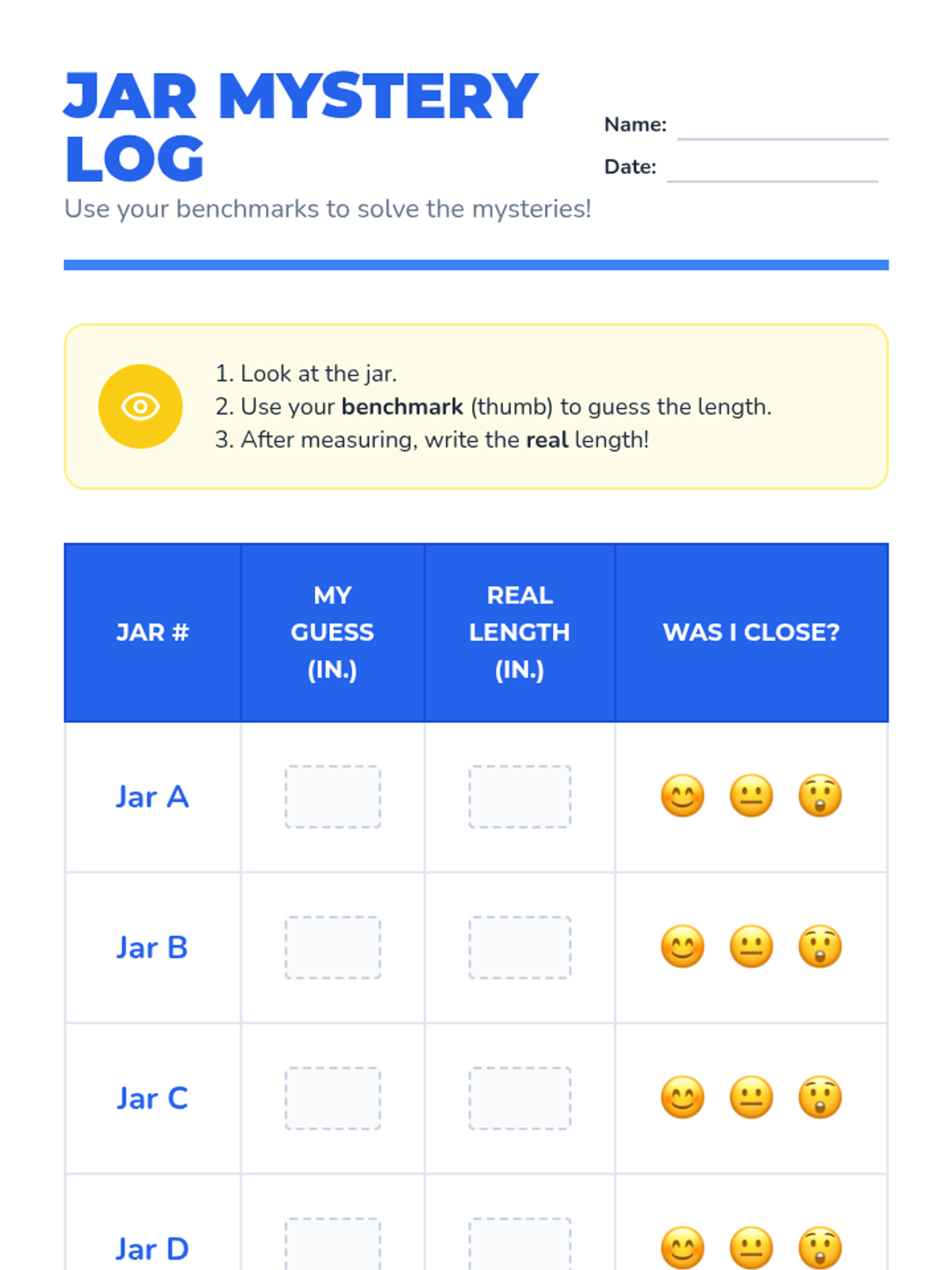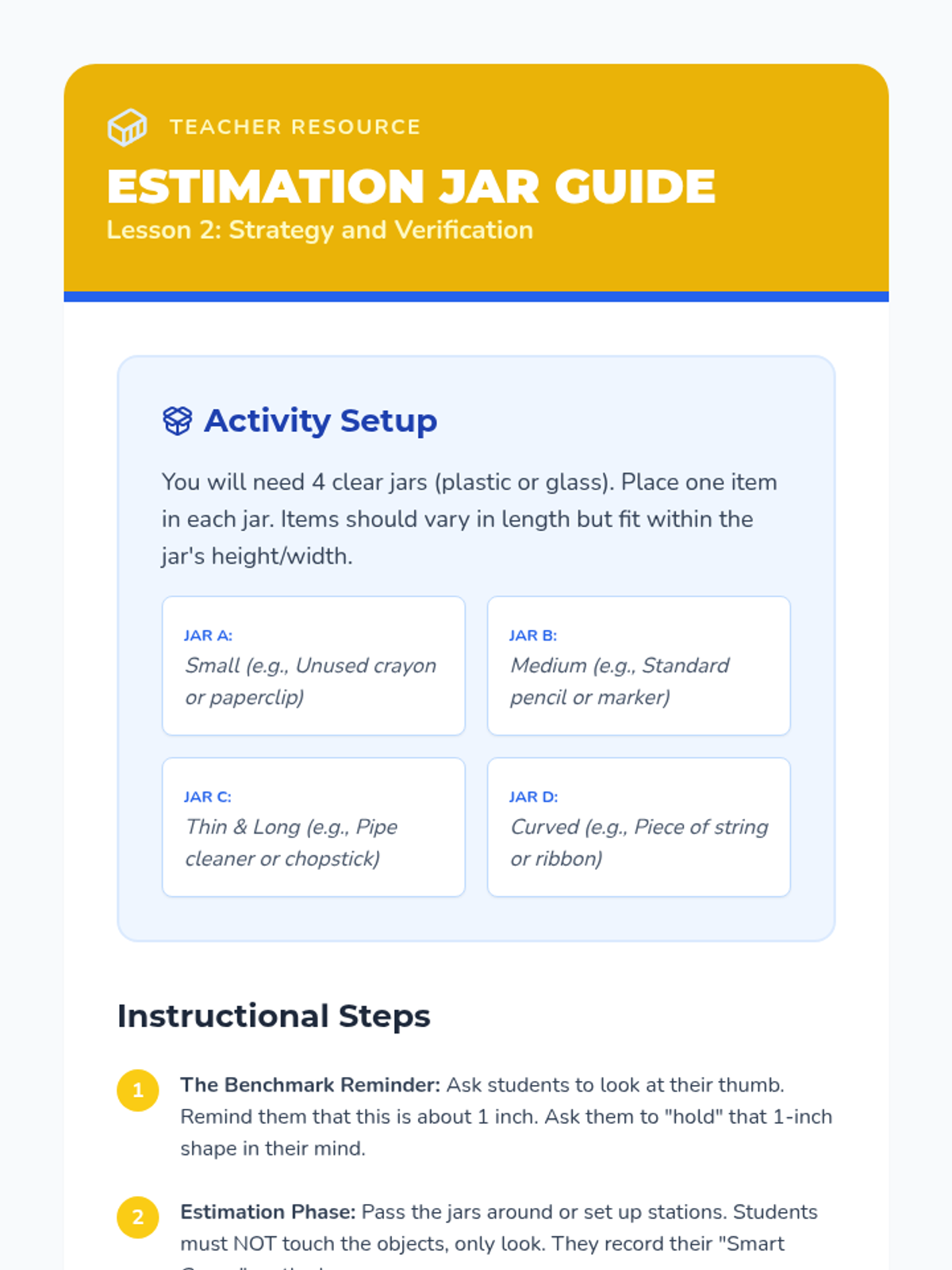 This sequence helps 1st Grade students develop 'measurement sense' by finding personal body benchmarks (like their thumb or foot) to estimate lengths before verifying with standard tools. Through gamified activities like 'The Estimation Jar' and 'Estimation Olympics,' students internalize the magnitude of inches and feet.