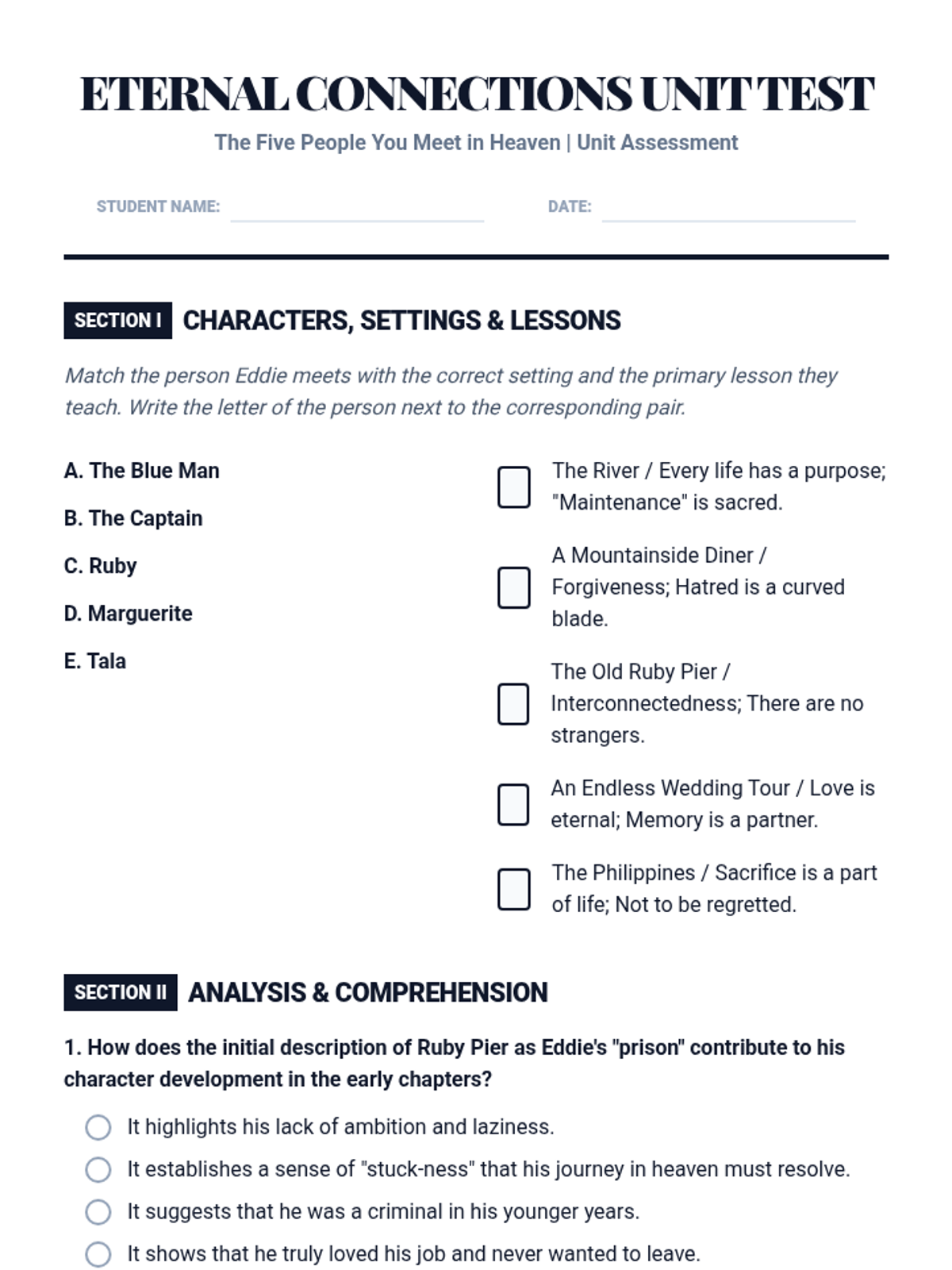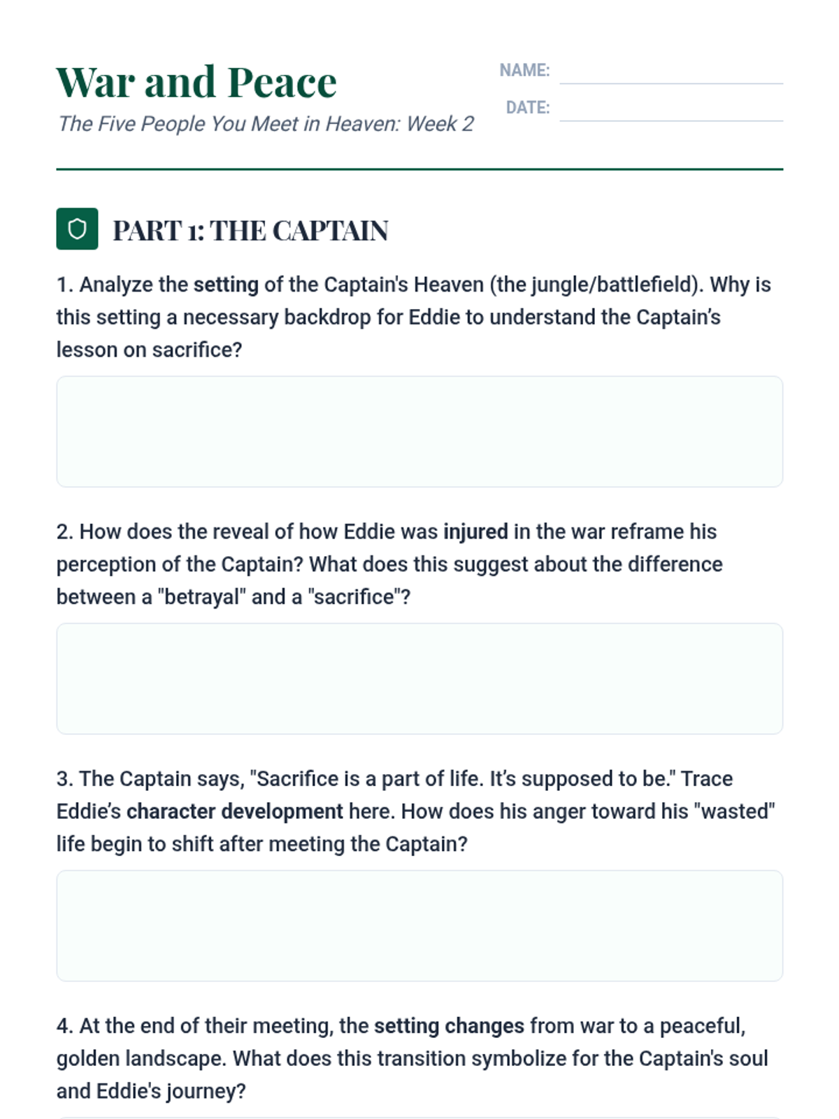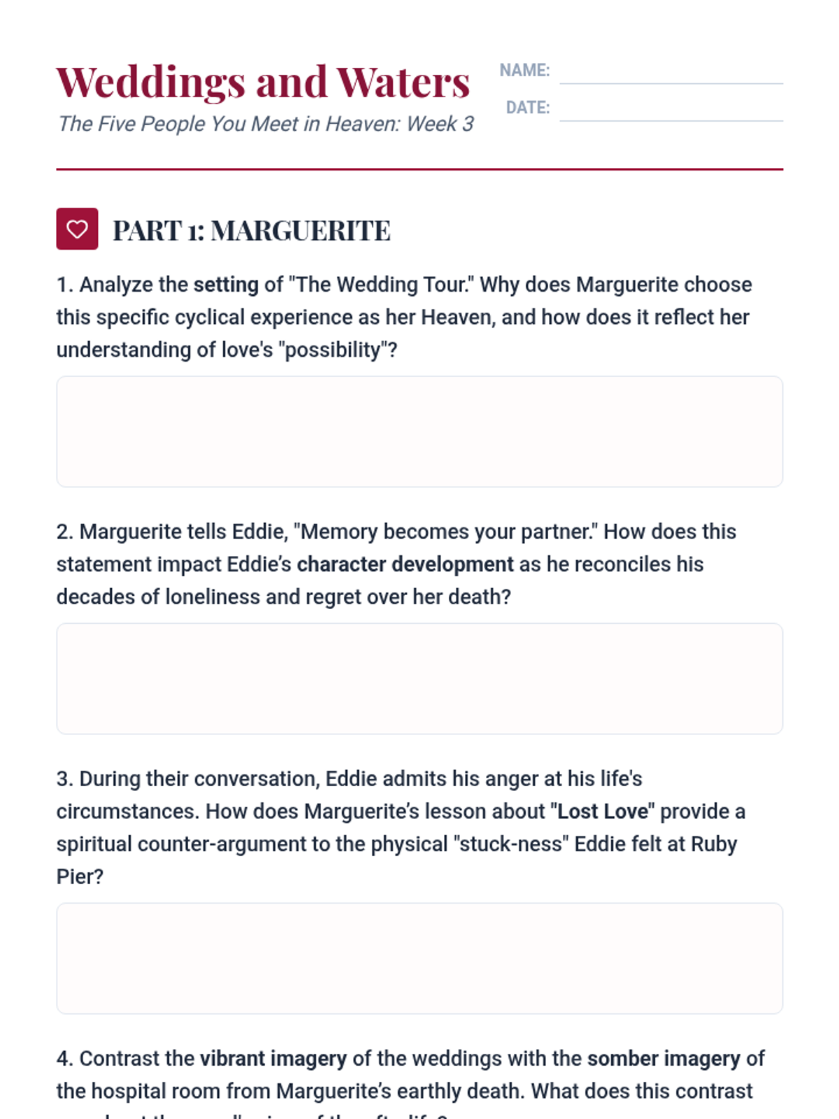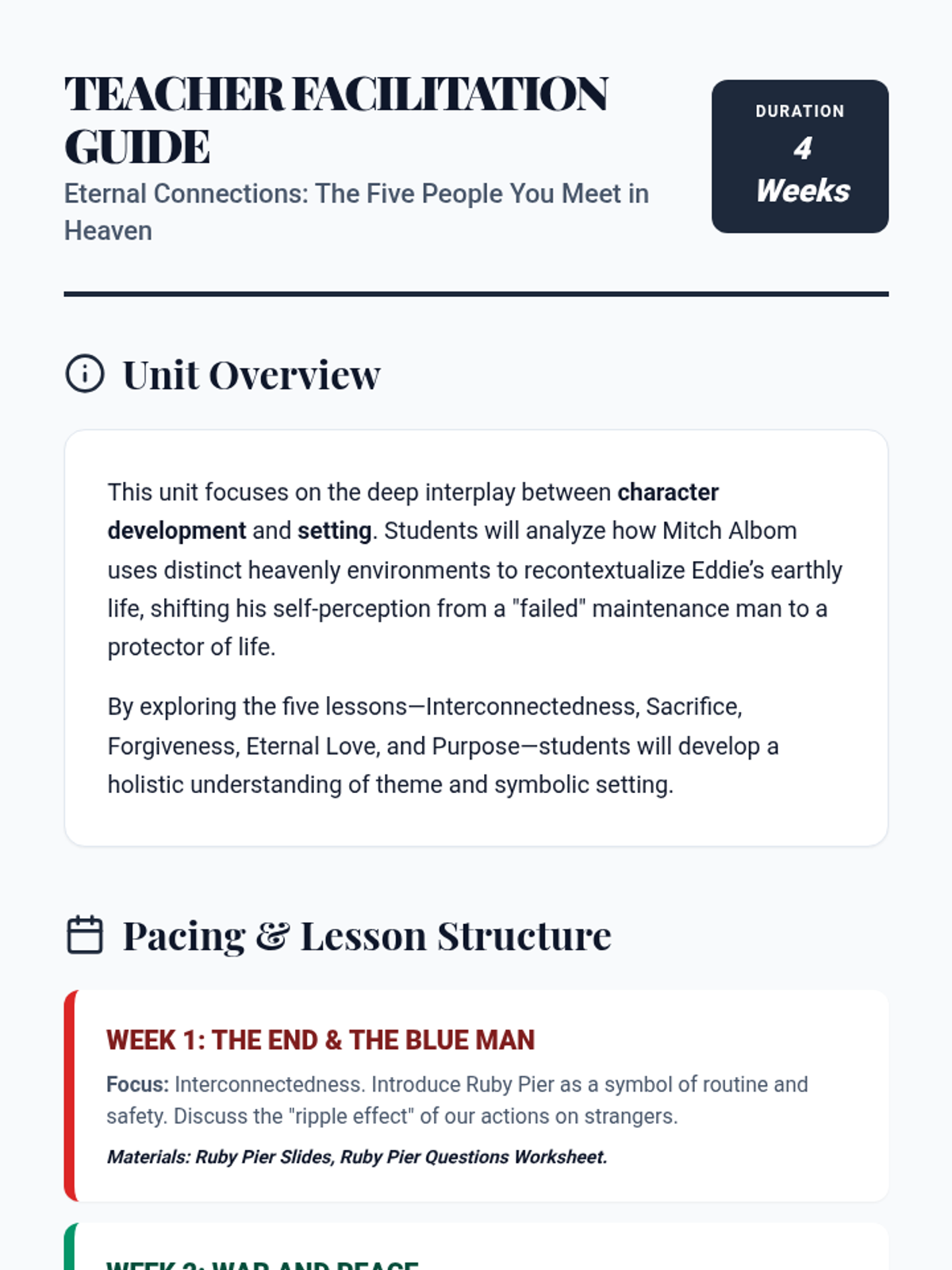 A comprehensive 4-week study of 'The Five People You Meet in Heaven' focusing on character development and the symbolic impact of setting. Students explore how Eddie's life is recontextualized through five distinct heavenly settings and the people who inhabit them.