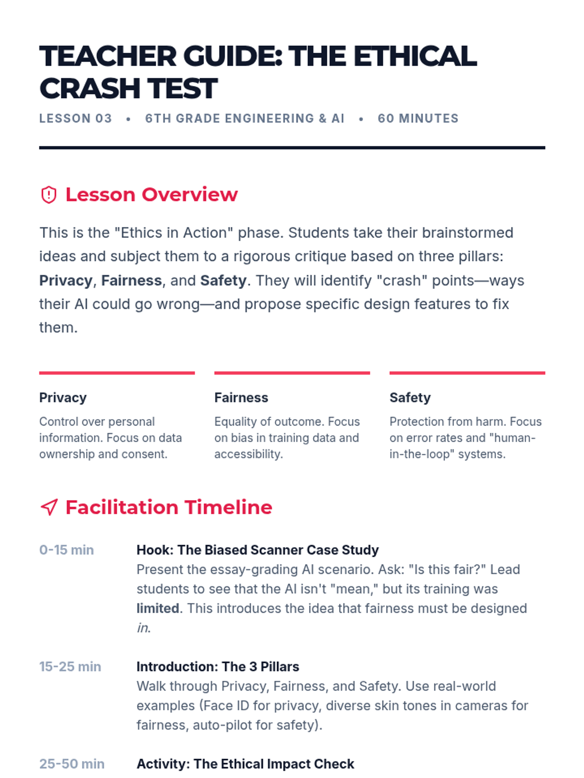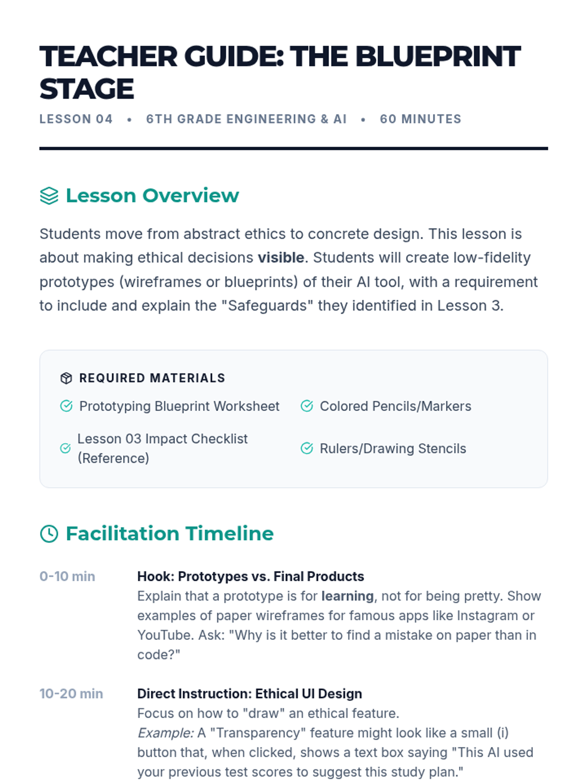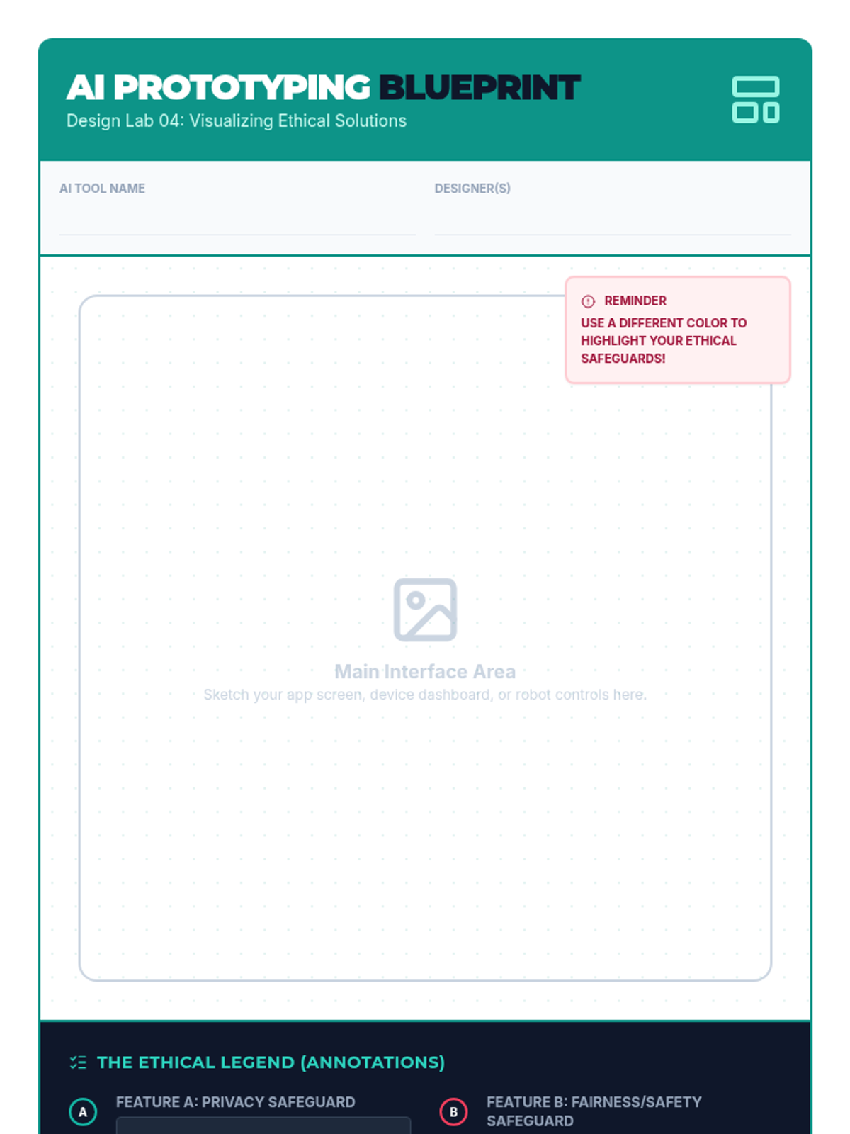 A project-based unit where 6th-grade students use Design Thinking to create ethical AI concept prototypes that solve community problems while prioritizing privacy, fairness, and safety.