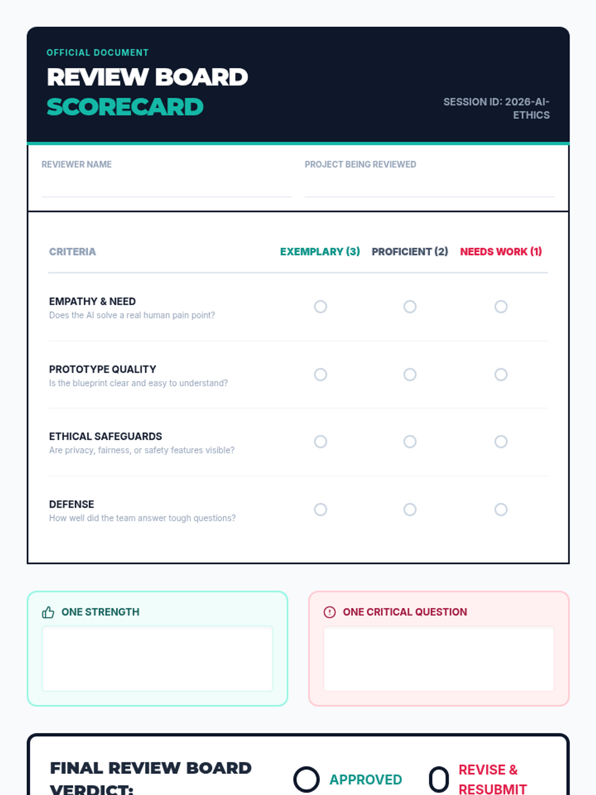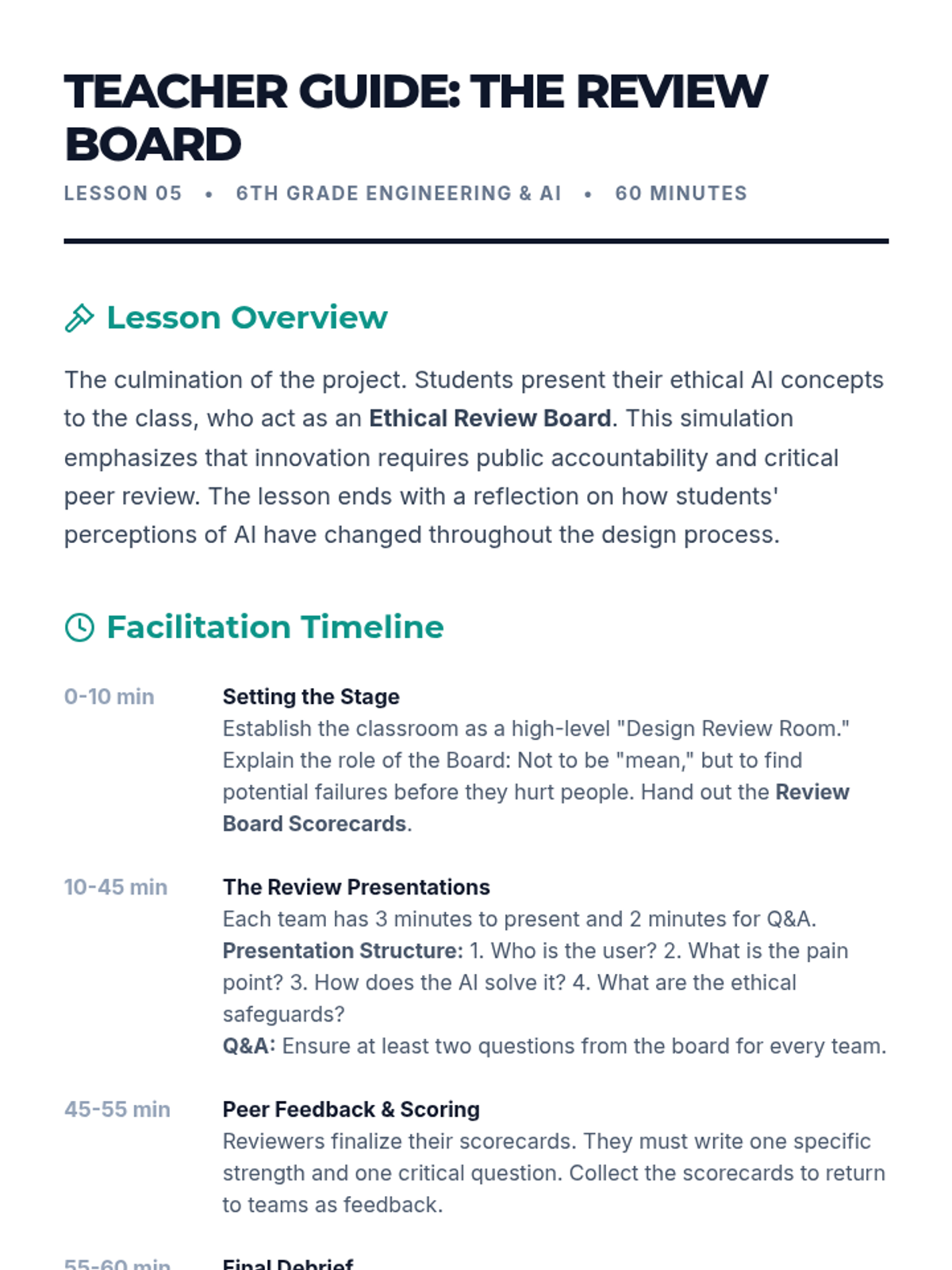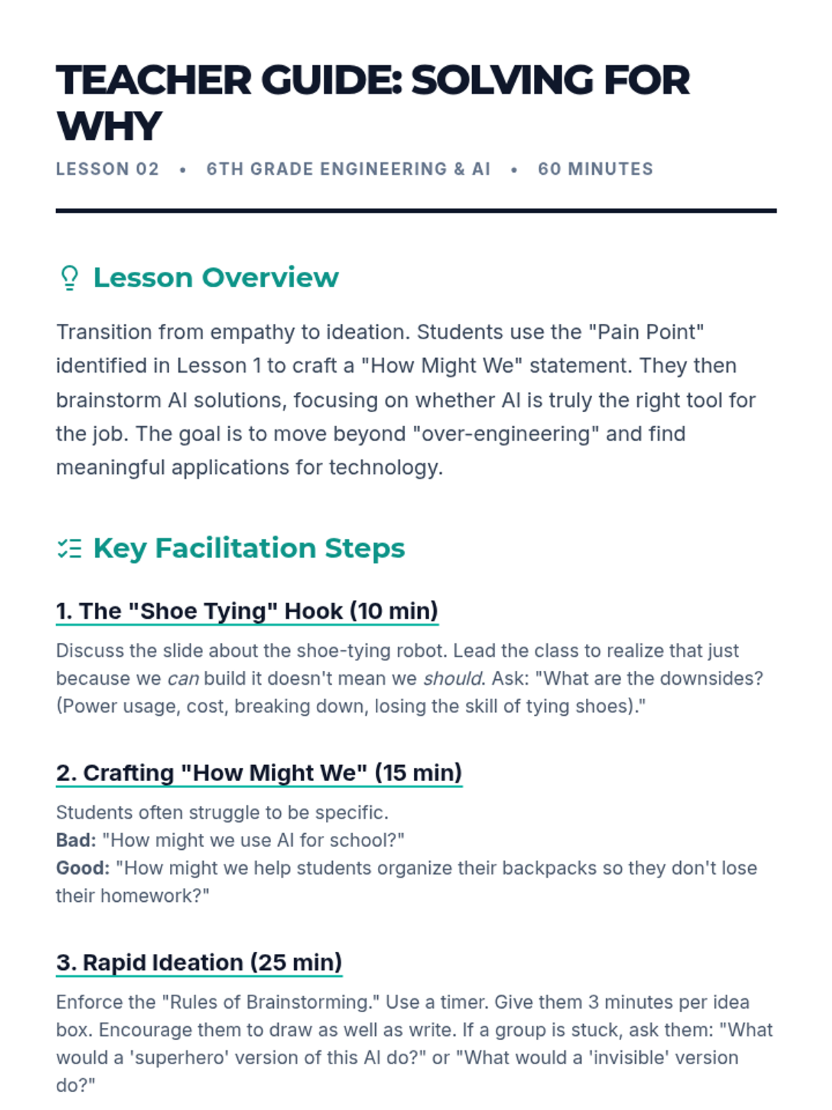 A project-based unit where 6th-grade students use Design Thinking to create ethical AI concept prototypes that solve community problems while prioritizing privacy, fairness, and safety.