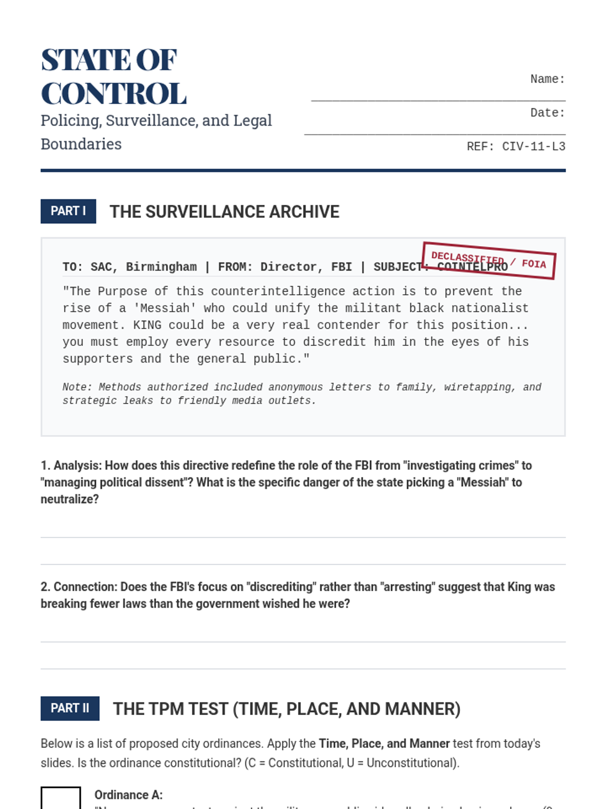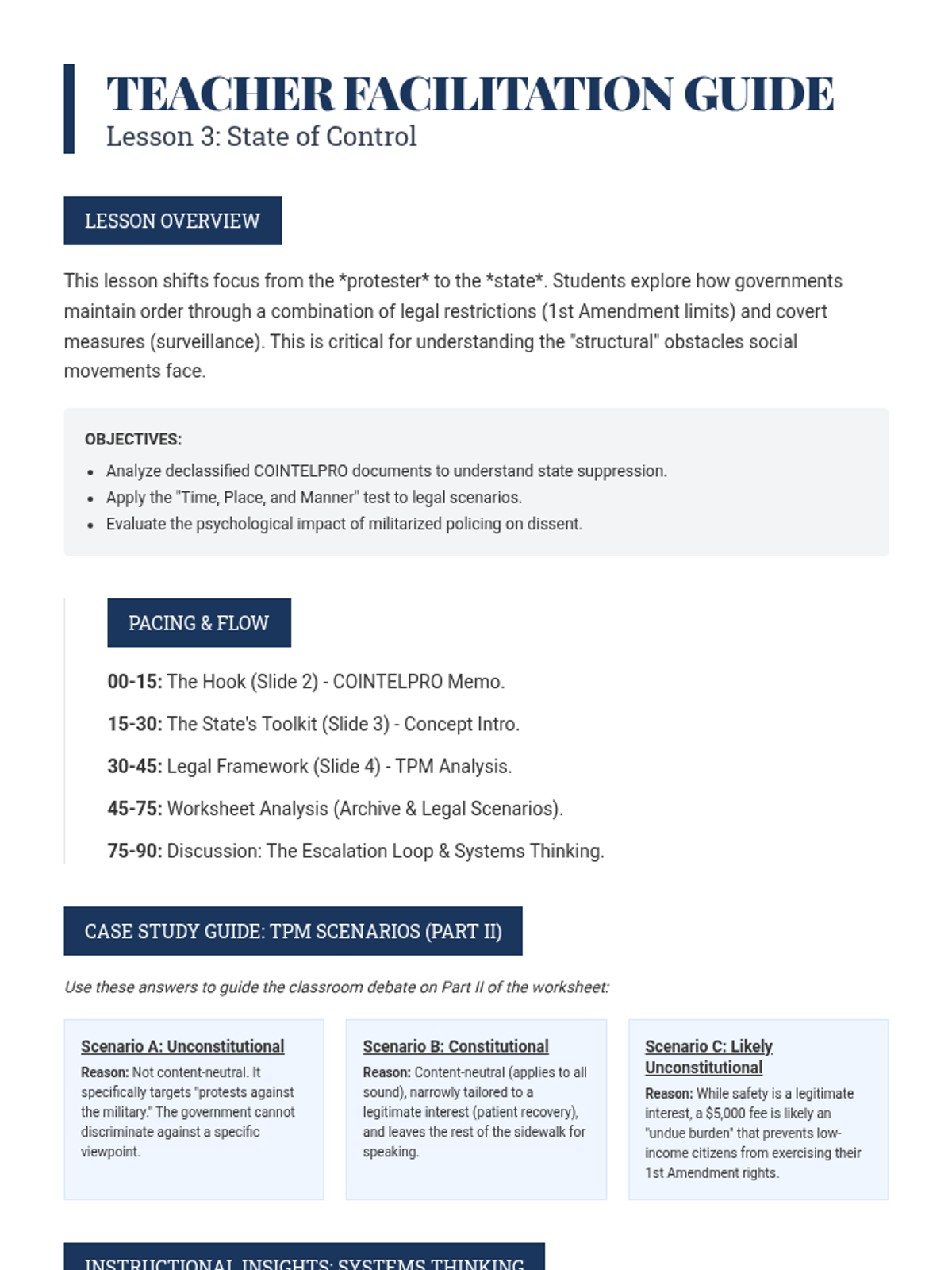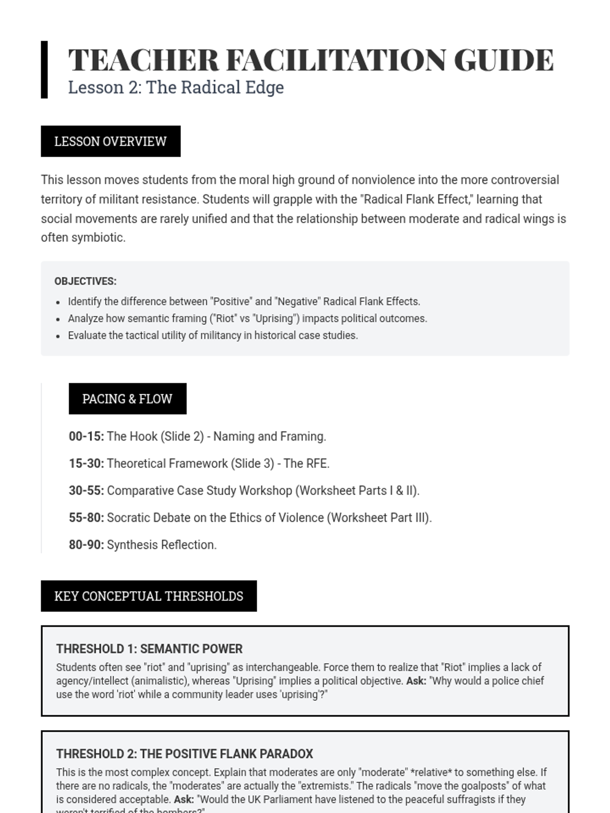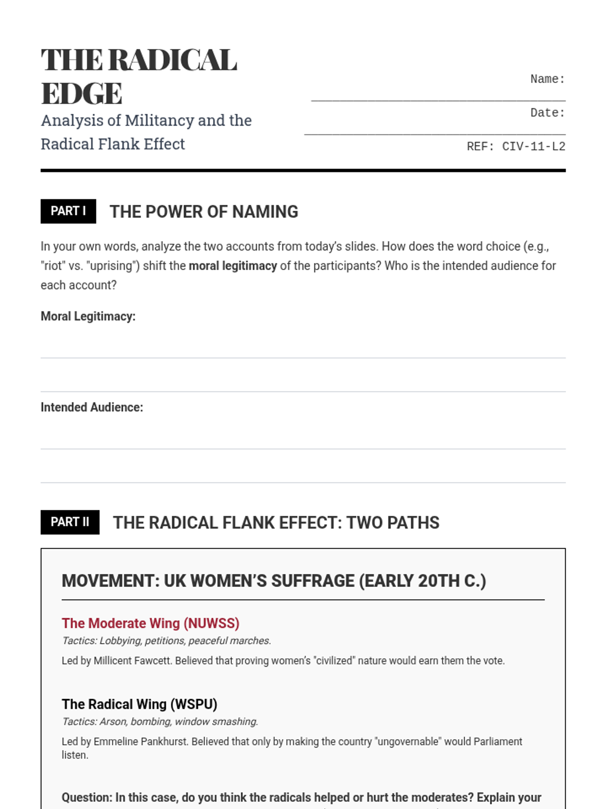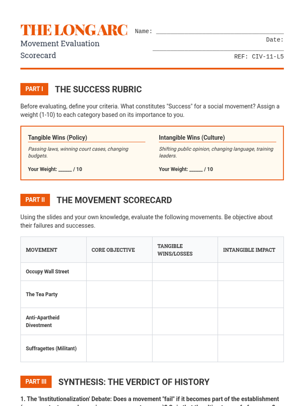 A high-level civics sequence for 11th graders exploring the ethical and tactical dimensions of social movements, from nonviolent civil disobedience to radical resistance and state responses.