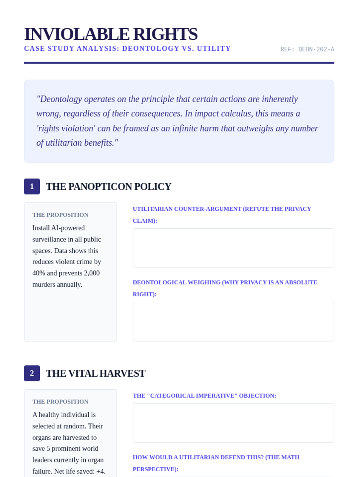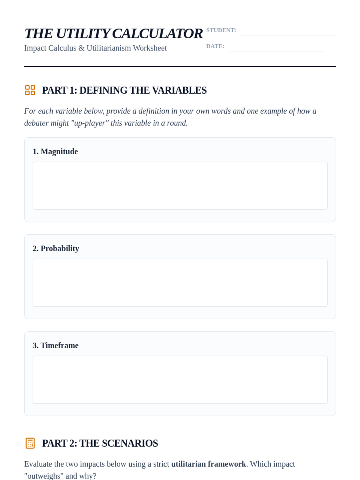This sequence explores the intersection of moral philosophy and competitive debate strategy. Students will learn to justify impact calculus through various ethical frameworks, including Utilitarianism, Deontology, and Structural Violence theory, ultimately competing in 'Framework Rounds' where the weighing mechanism itself is the primary point of contention.