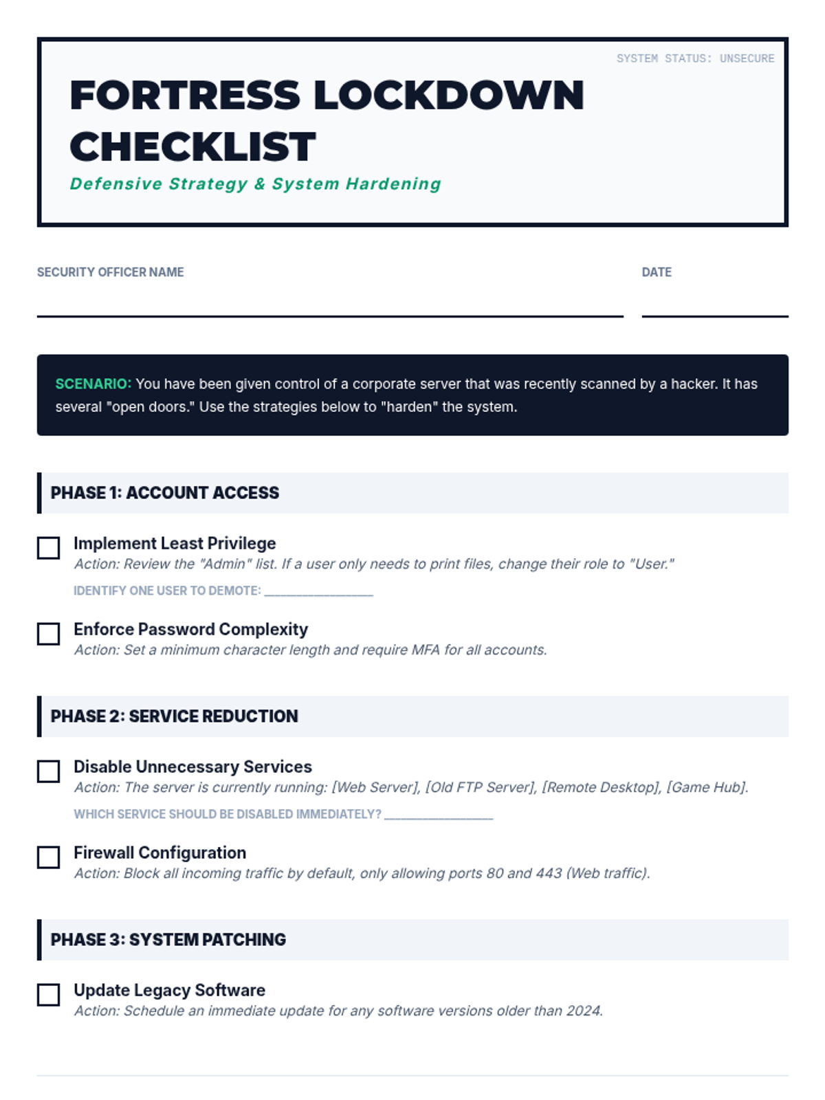 An introductory cybersecurity course for 8th graders focusing on the ethics of hacking, defensive strategies, and conceptual understanding of system vulnerabilities. Students transition from understanding 'White Hat' ethics to performing reconnaissance, hardening systems, and competing in a 'Capture the Flag' challenge.