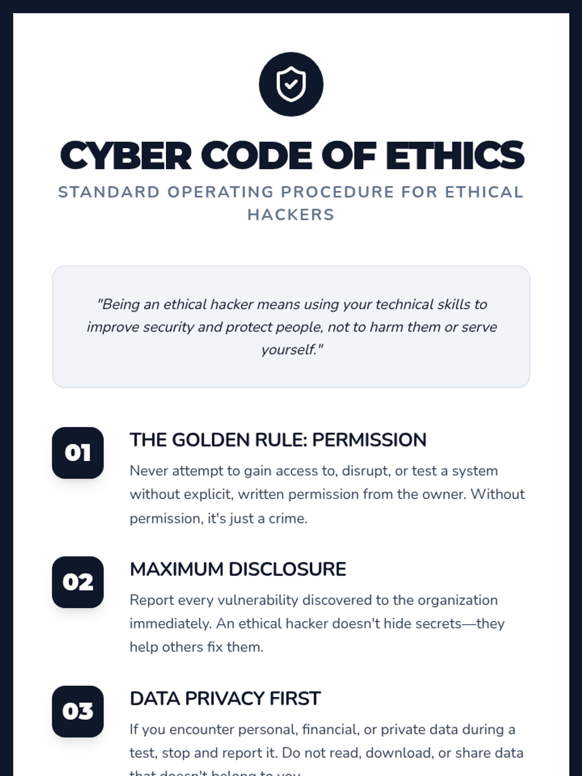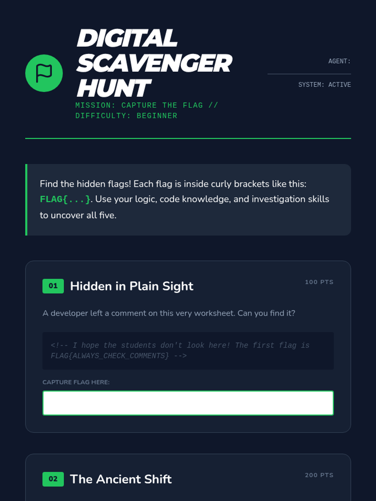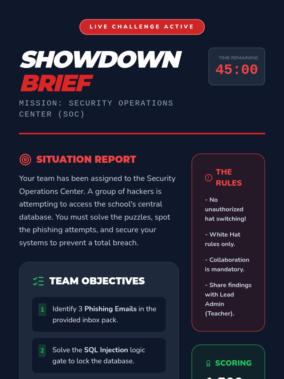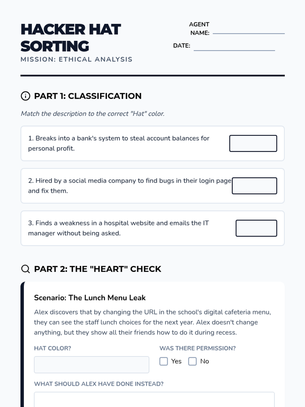 A 5-lesson unit on ethical hacking for 7th grade, covering the ethics of cybersecurity, the logic of technical vulnerabilities like SQL injection, physical security audits, and culminating in a Capture the Flag competition.