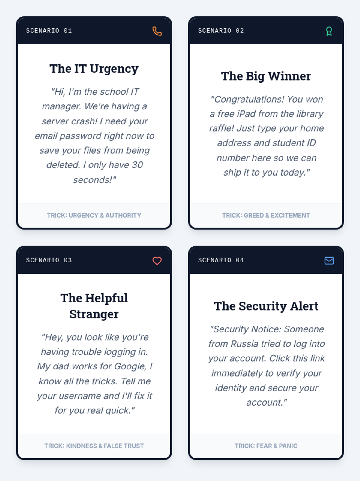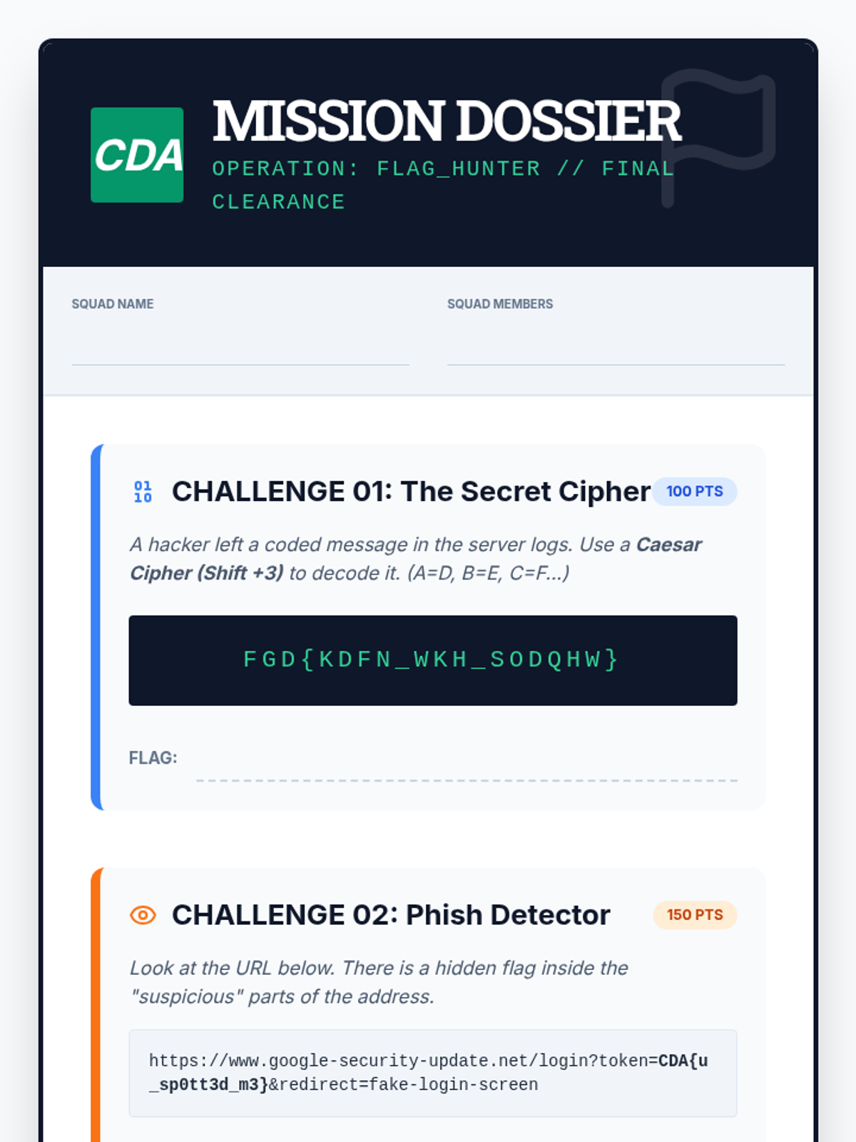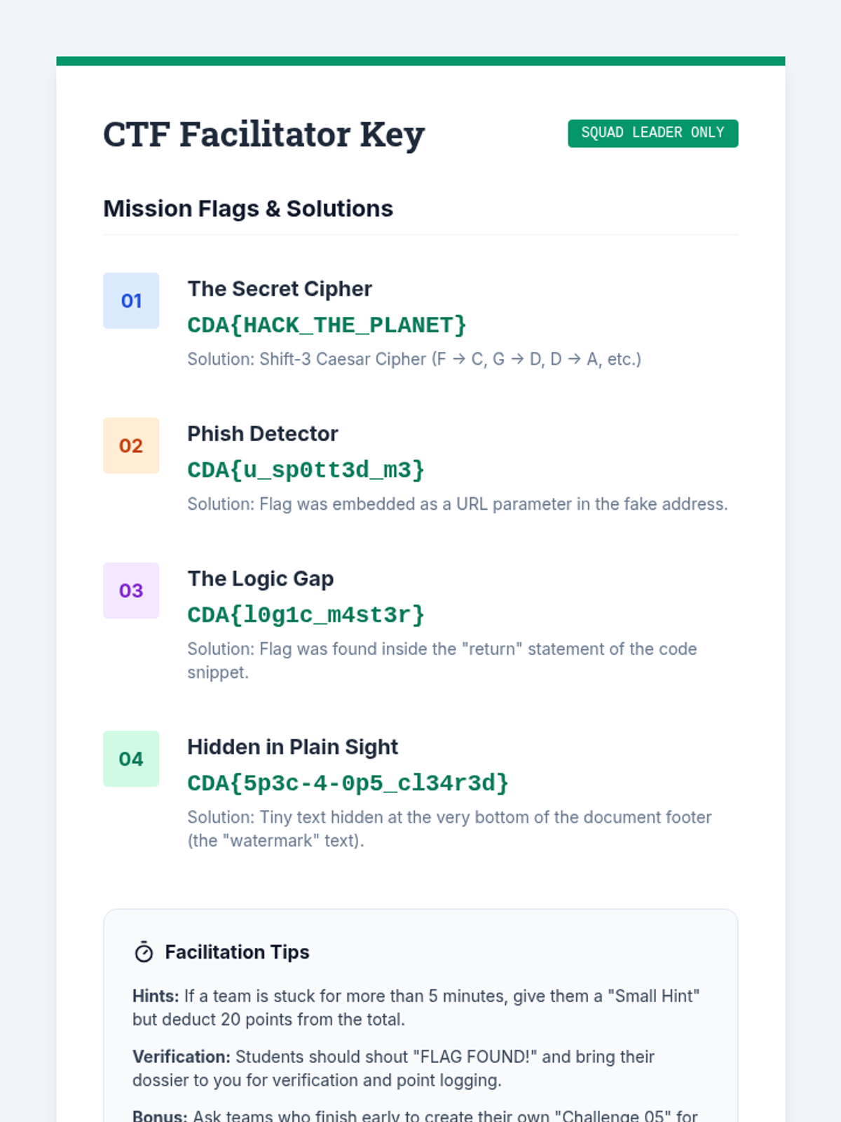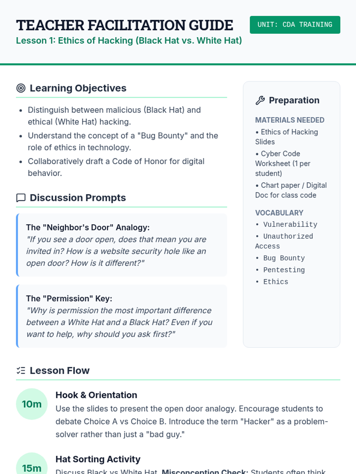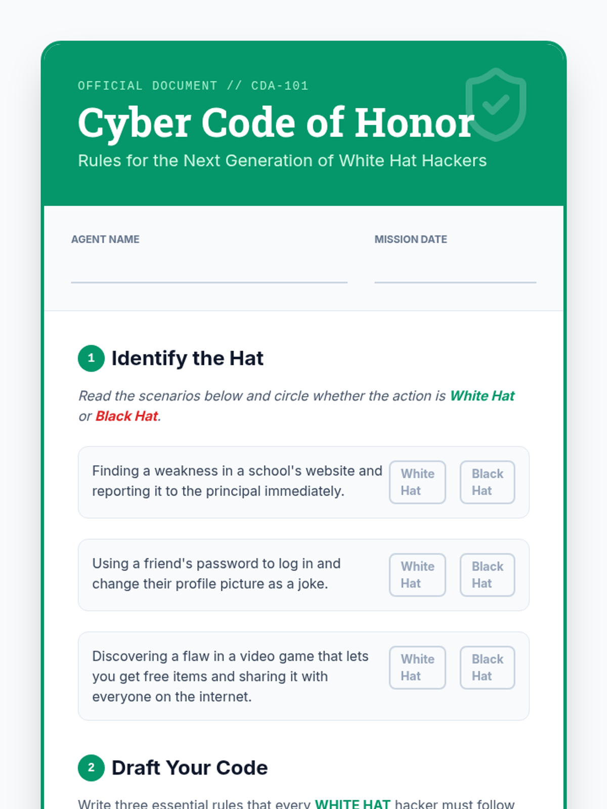 A 5th-grade sequence on ethical hacking and cybersecurity. Students learn the ethics of 'White Hat' hacking, perform physical security audits, debug logic errors, defend against social engineering, and compete in a Capture the Flag challenge.