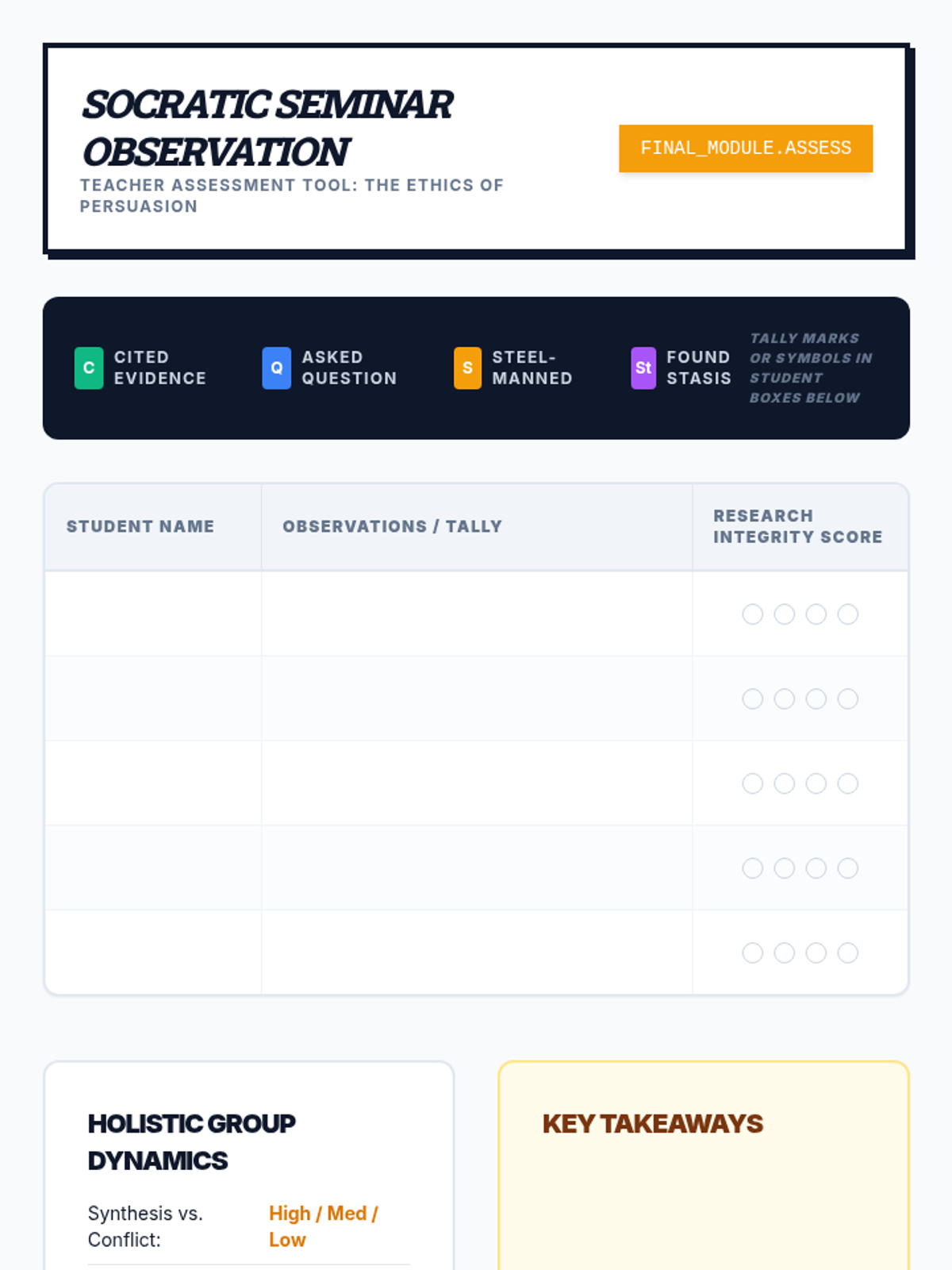 An 11th-grade ELA sequence focused on ethical research, stakeholder analysis, and 'Steel-Manning' in debate. Students move from data gathering to deep synthesis of conflicting perspectives.