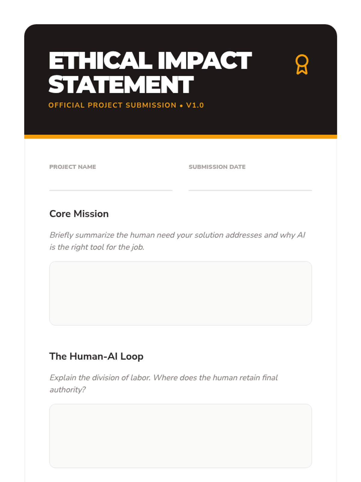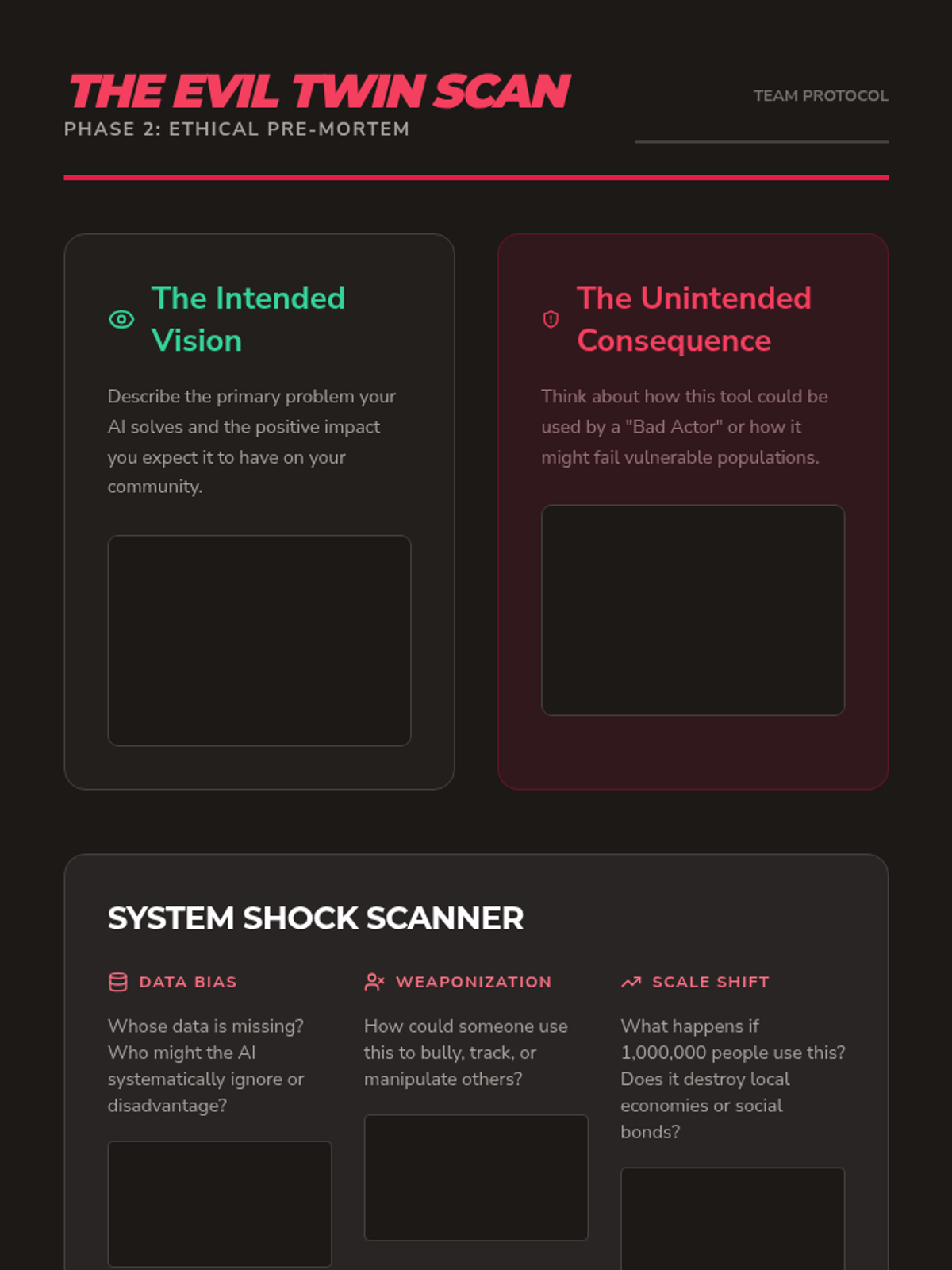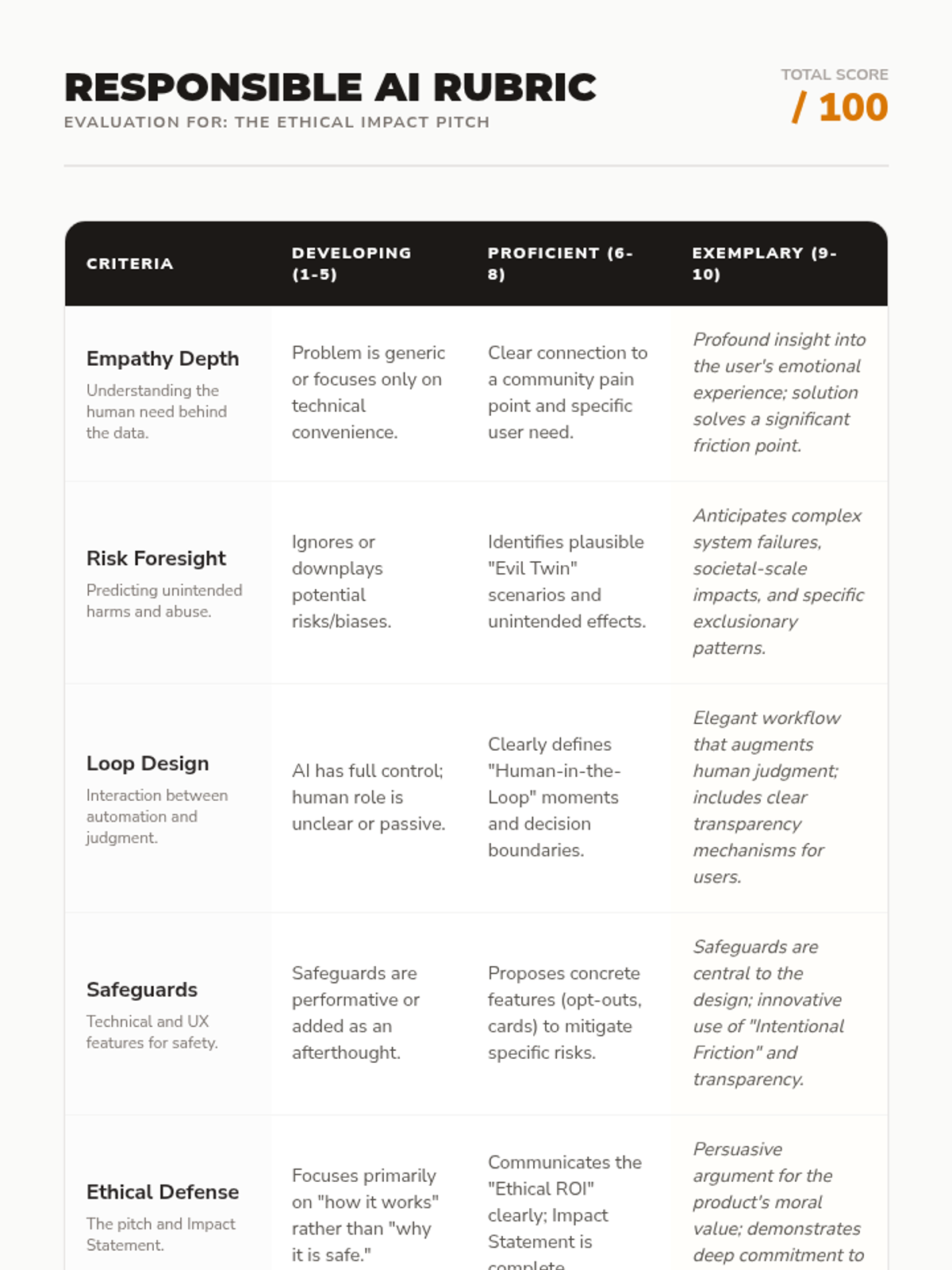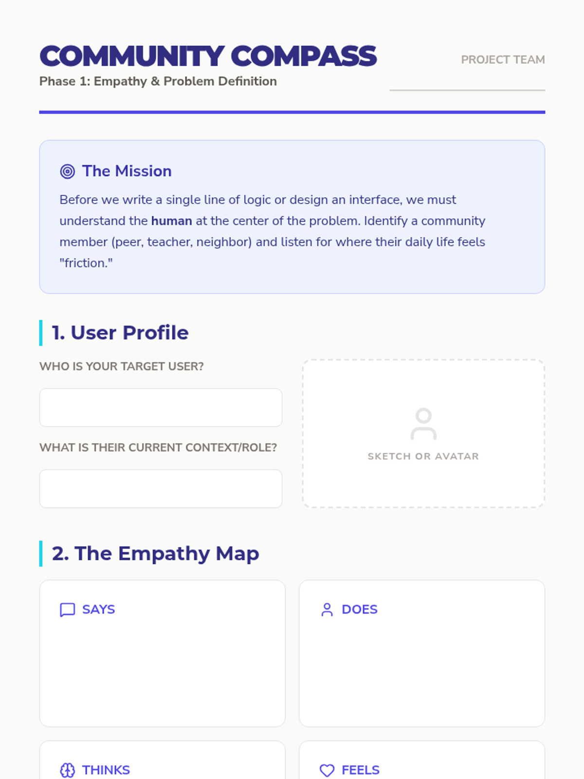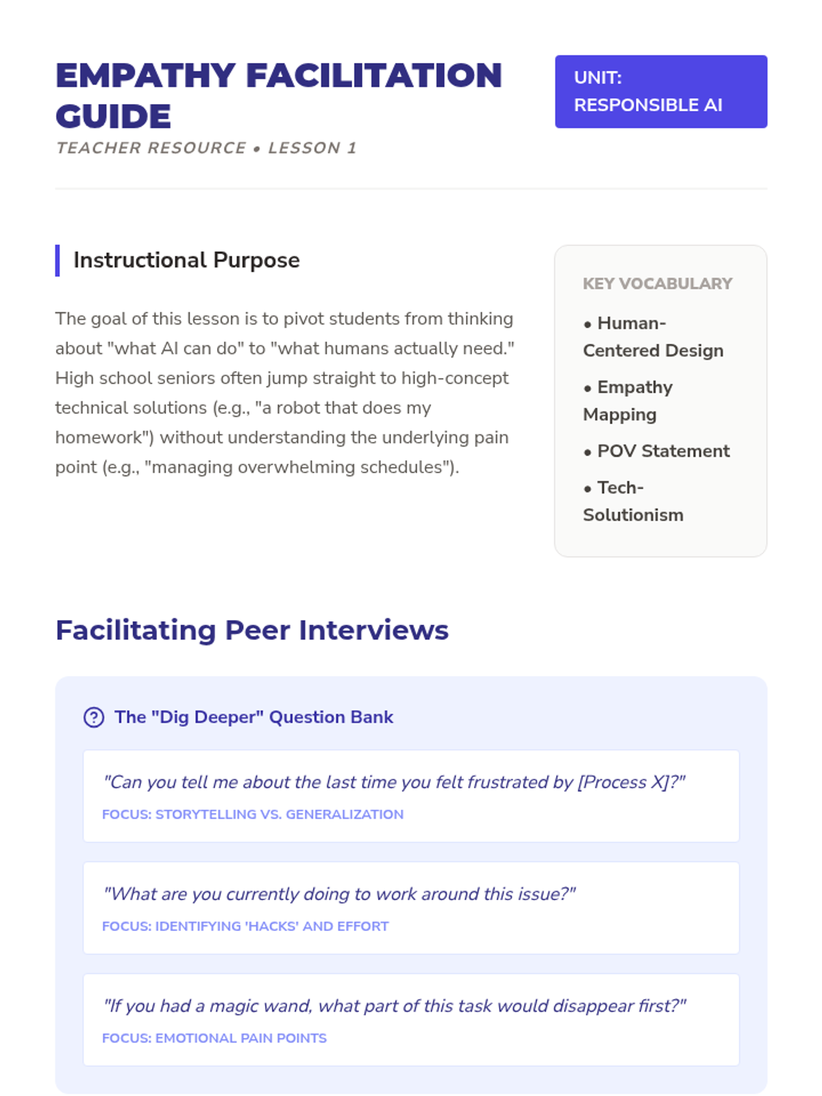 A project-based unit where 12th-grade students design human-centered AI solutions by identifying community needs, scanning for ethical risks, and prototyping safety-first features. Students transition from being critics of AI to responsible creators, culminating in a pitch that prioritizes ethical impact over financial gain.