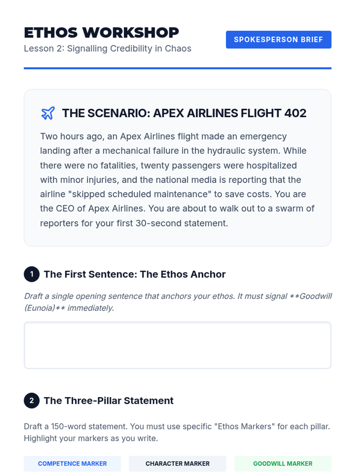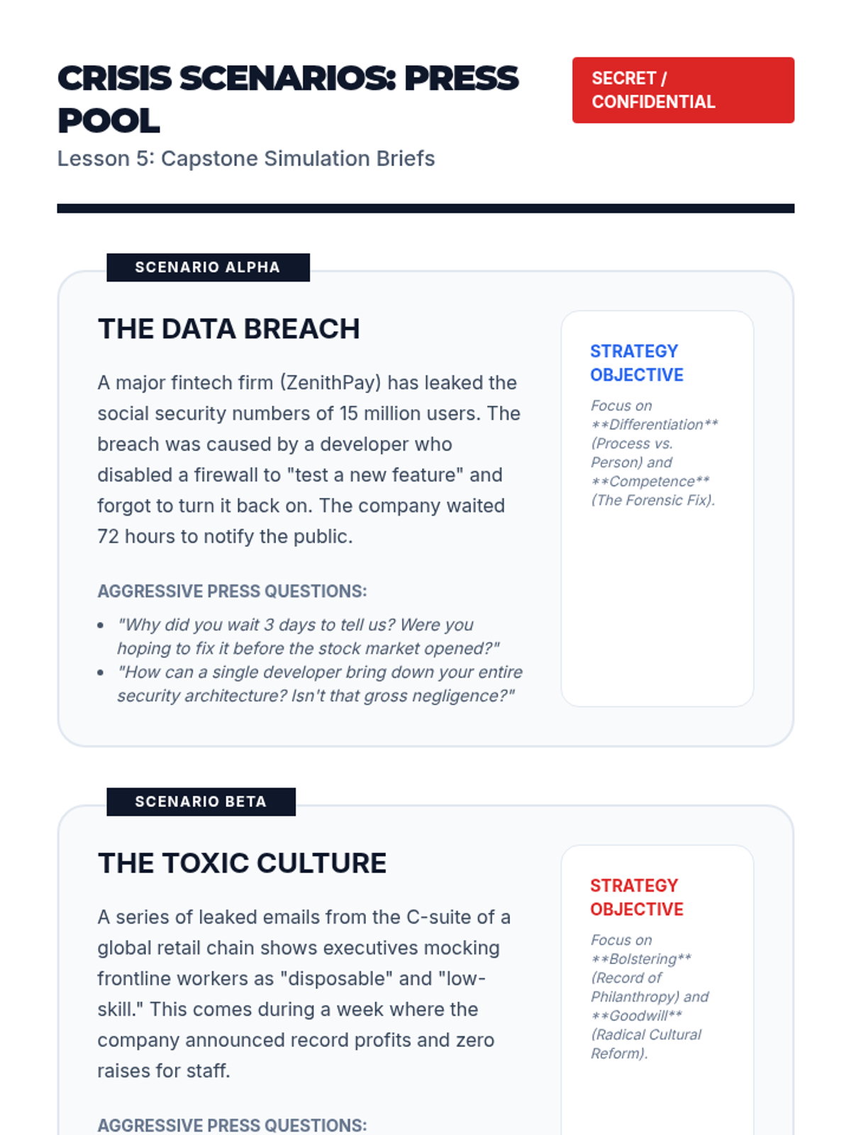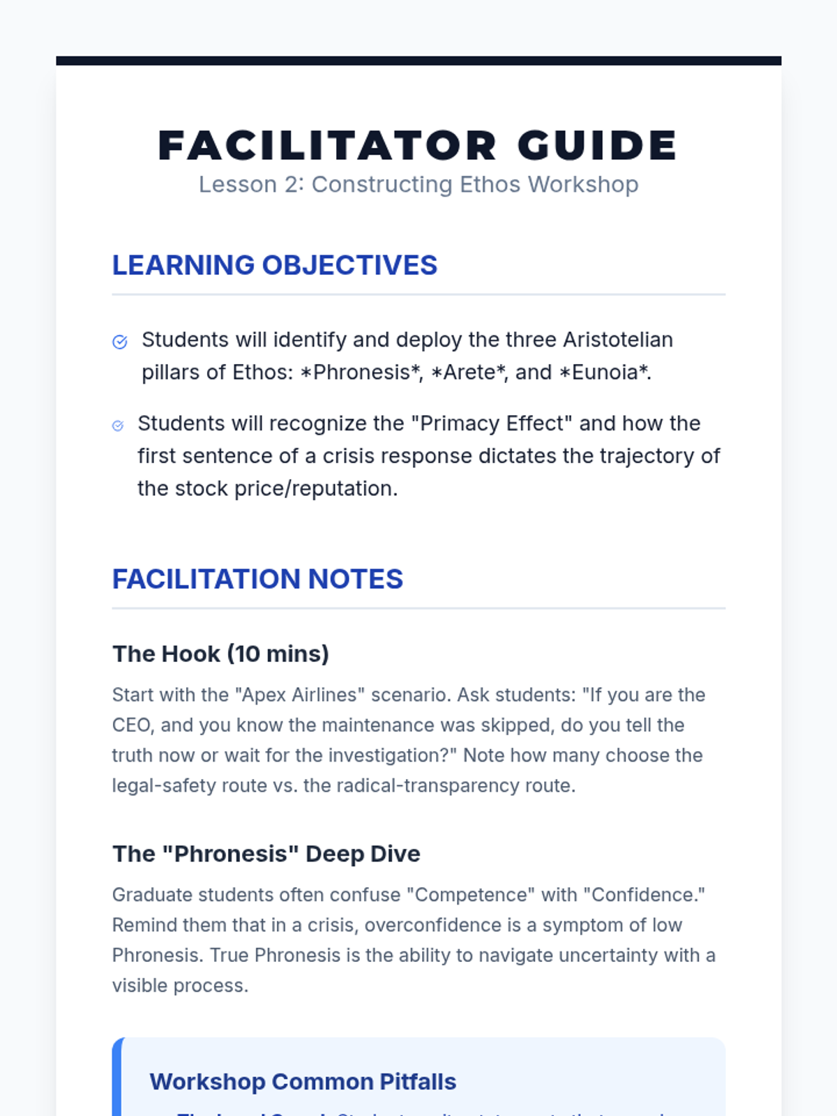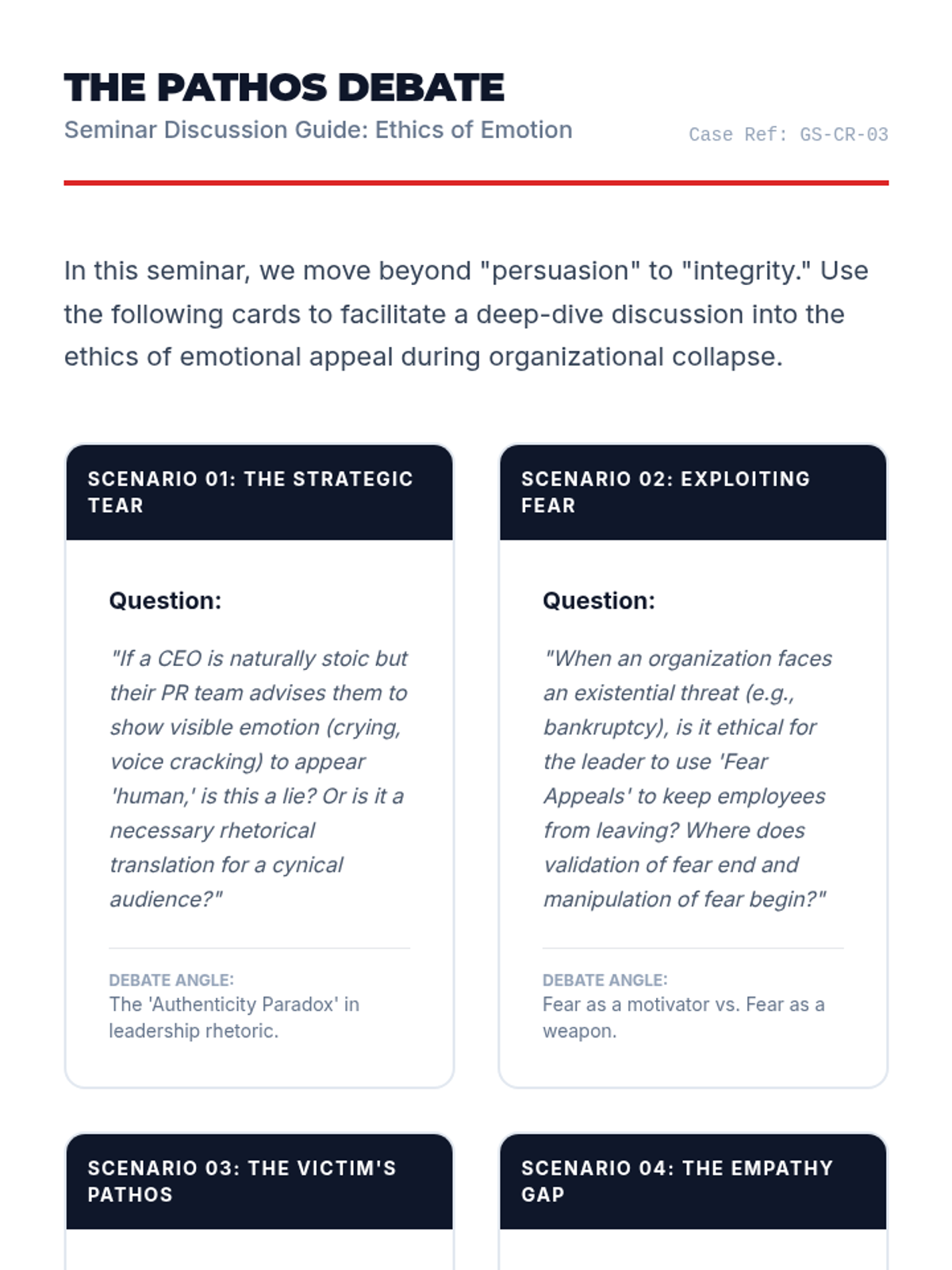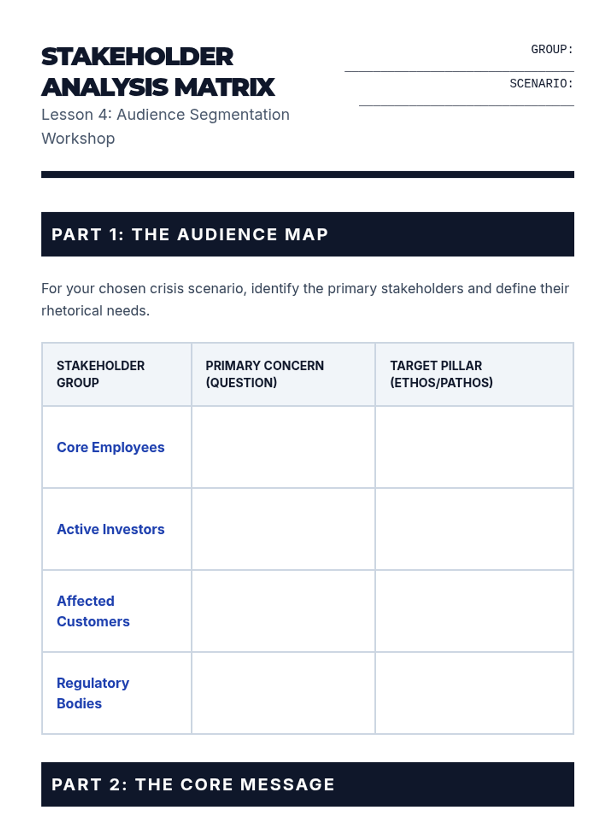 This graduate-level sequence explores the rhetorical strategies of crisis leadership, focusing on the concepts of Ethos, Pathos, and the four stances of Apologia. Students analyze historical crises and engage in simulations to master the art of reputation management under pressure.
