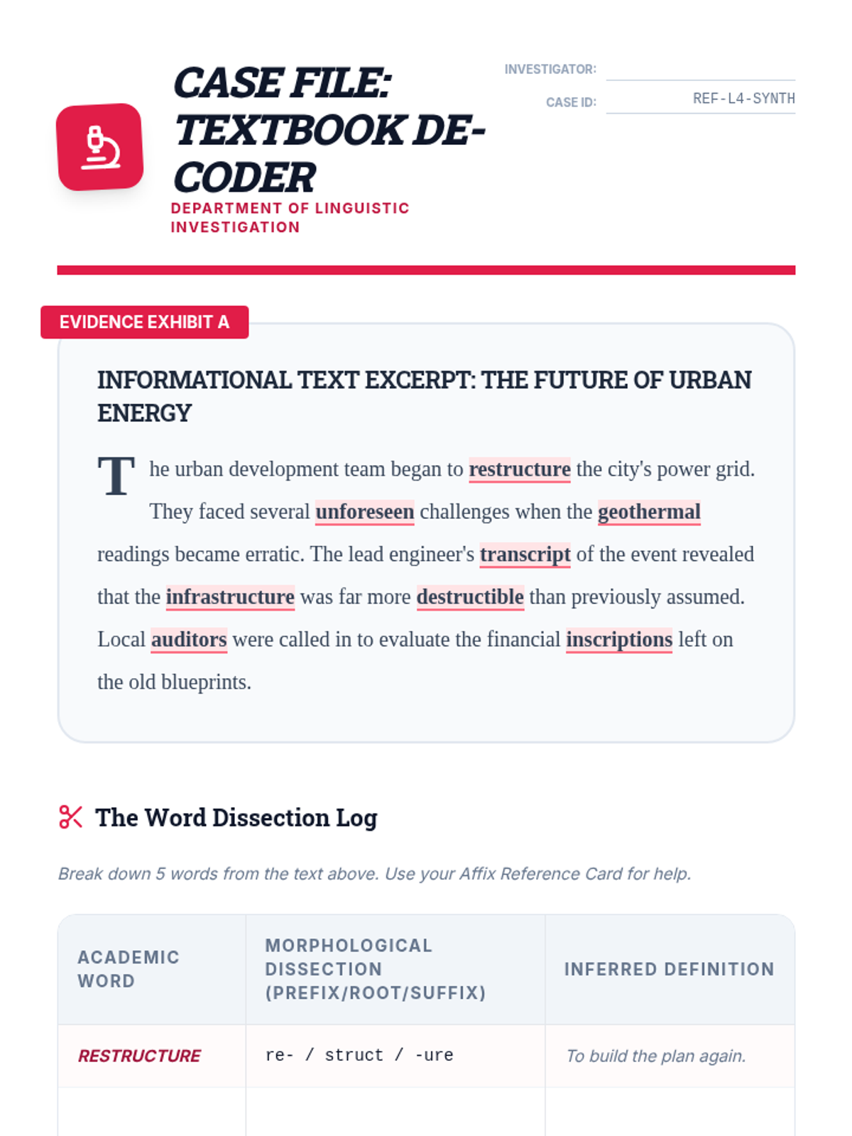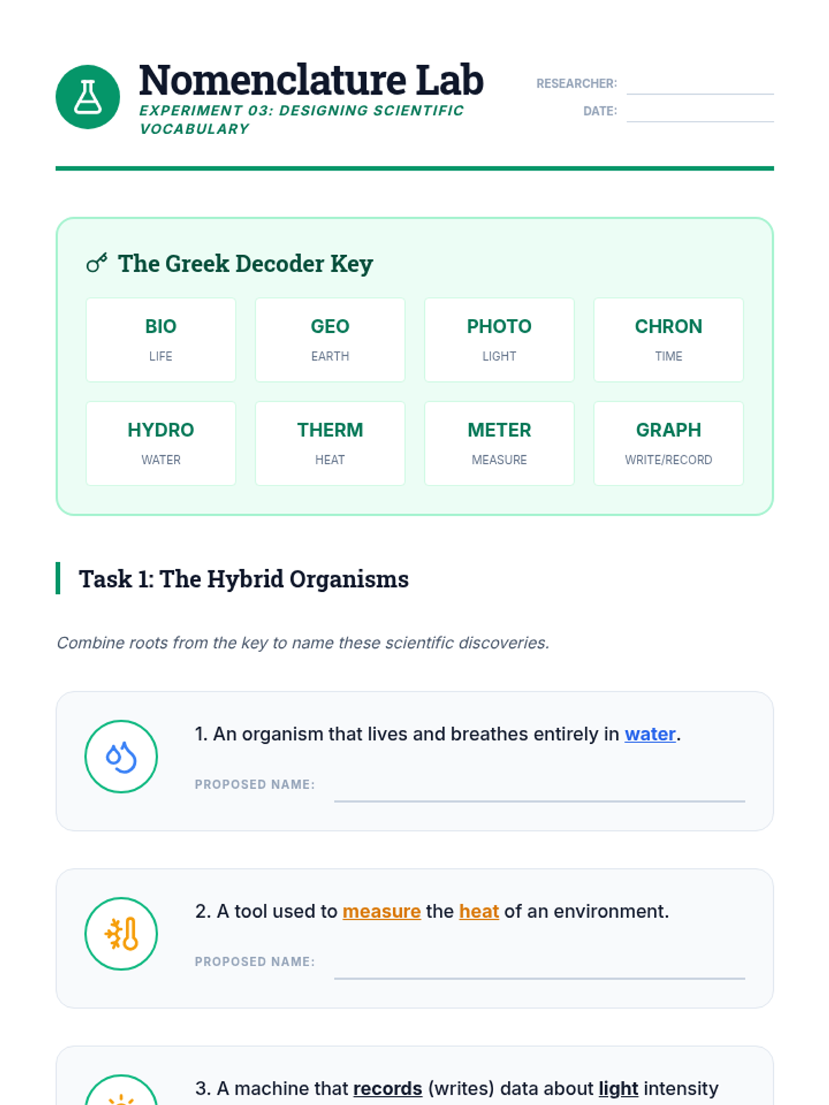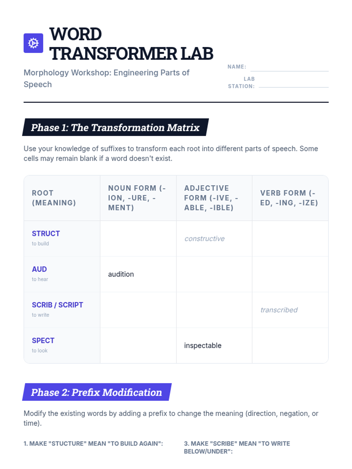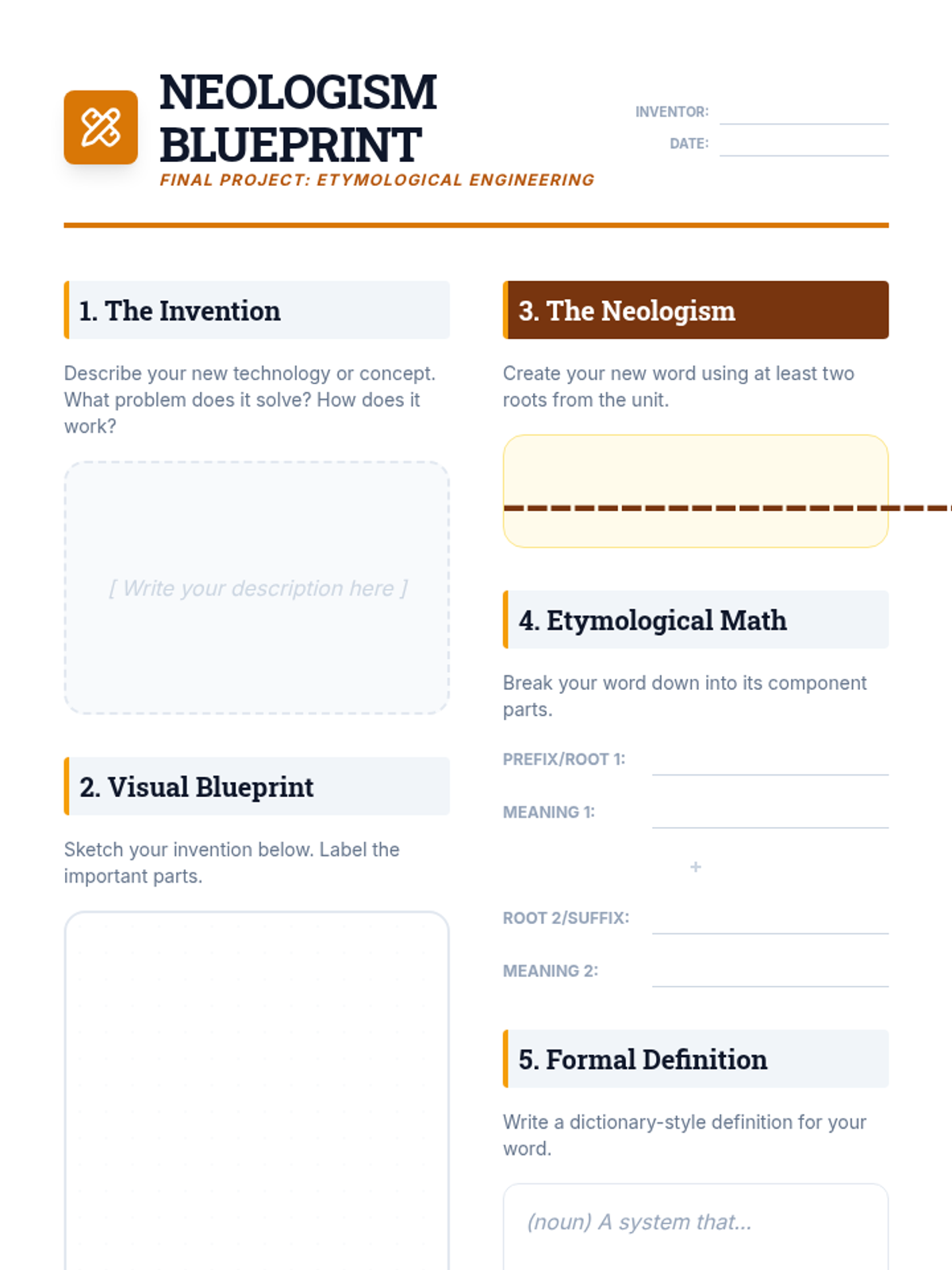 An advanced etymology sequence for 7th Grade ESL students, focusing on Latin and Greek morphemes to decode academic vocabulary across disciplines. Students progress from root identification to creating their own neologisms for modern inventions.