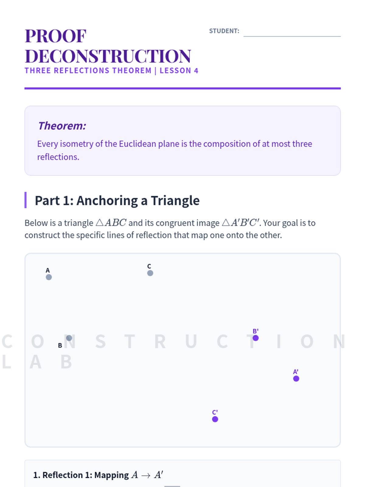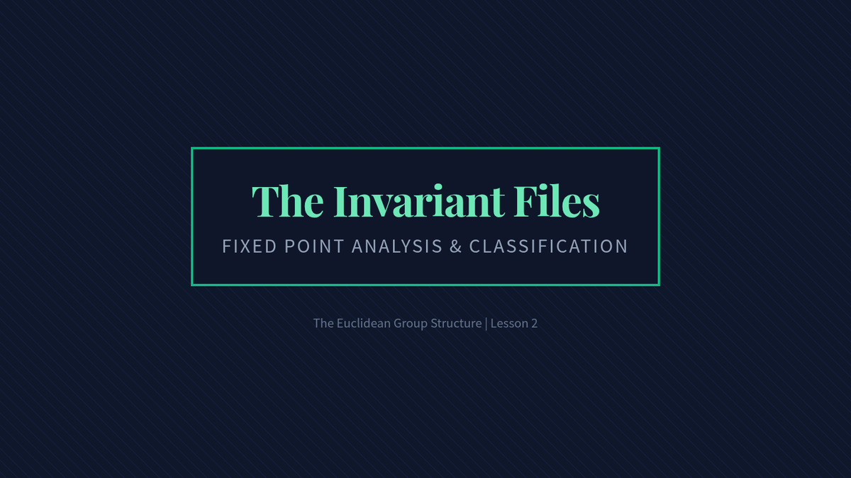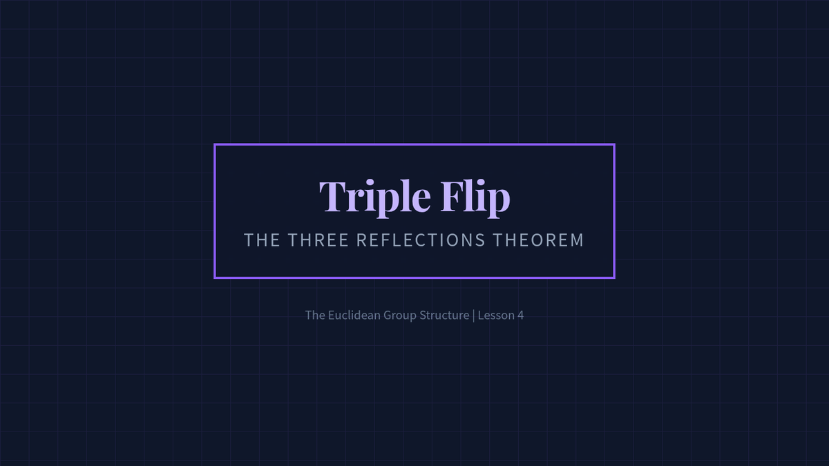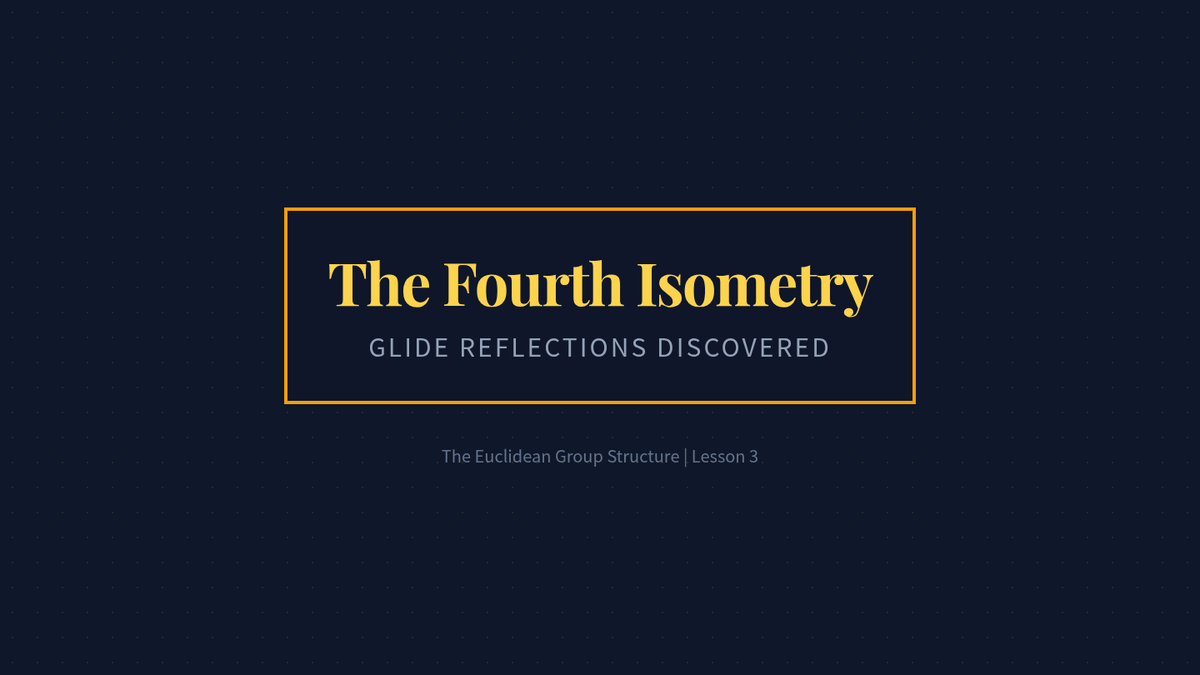 This advanced geometry sequence explores the algebraic structure of the Euclidean Group, focusing on reflections as generators and the classification of all plane isometries. Students will move from geometric constructions to formal group theory, culminating in the Three Reflections Theorem and non-commutative properties.